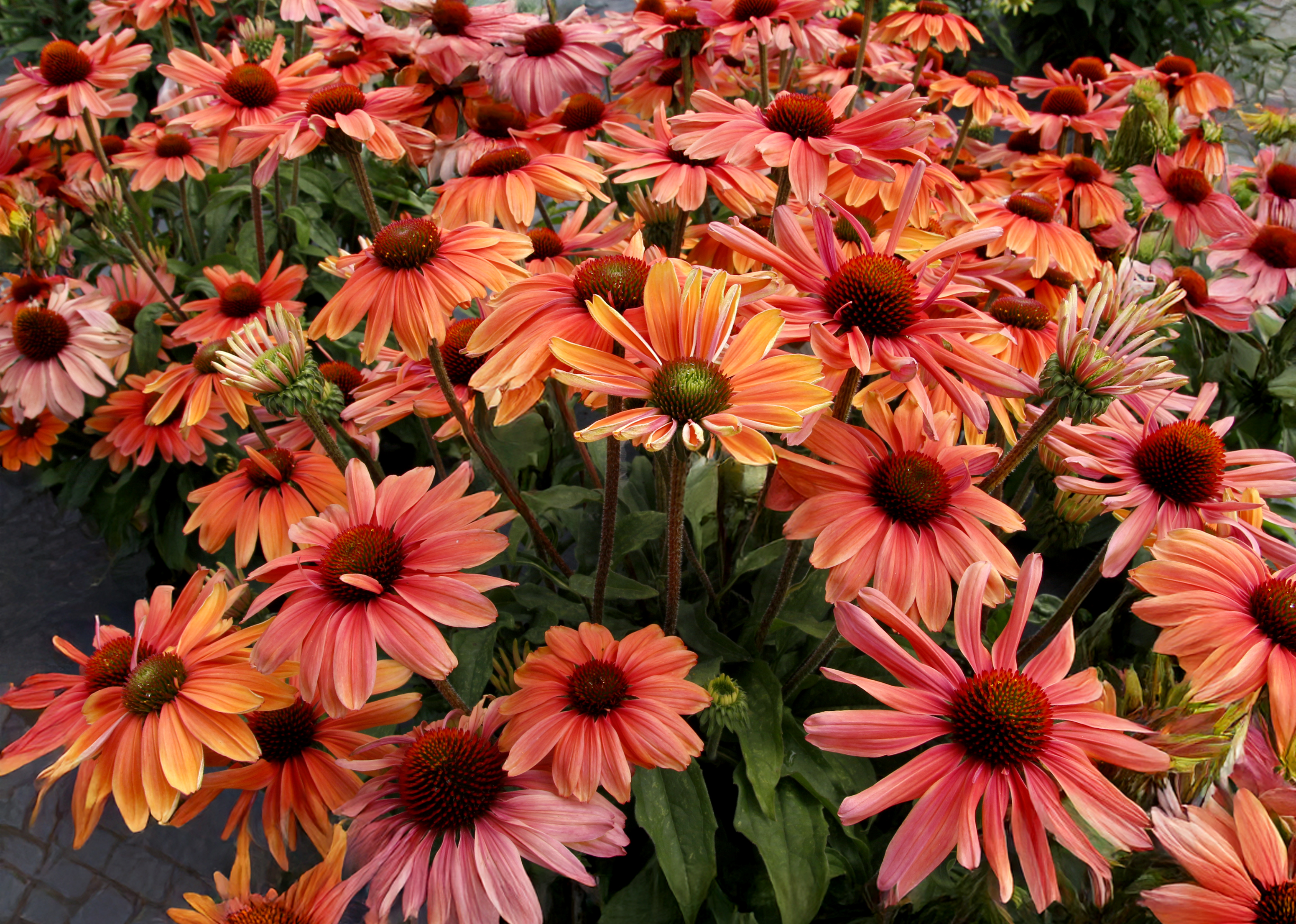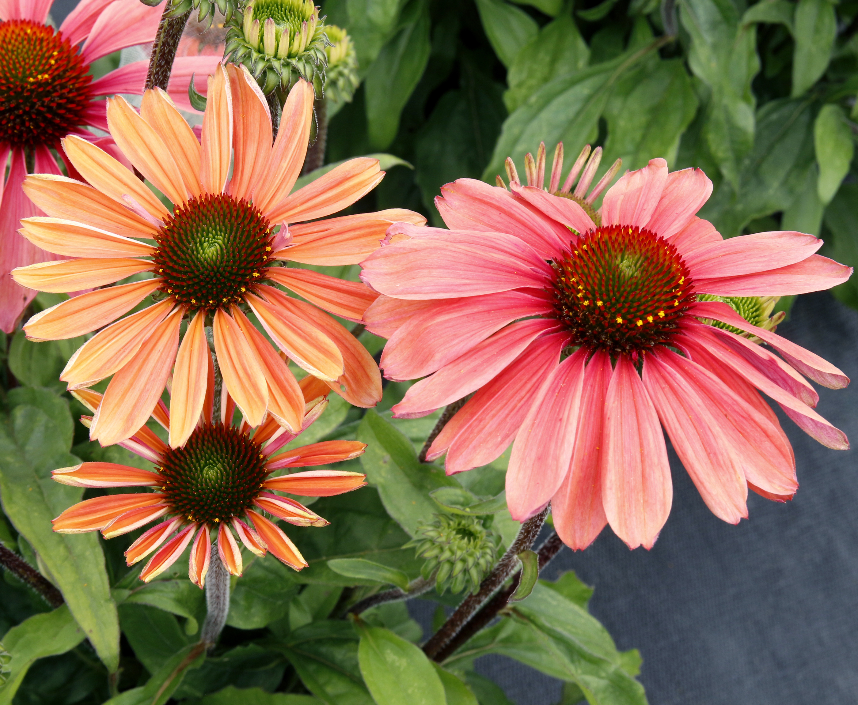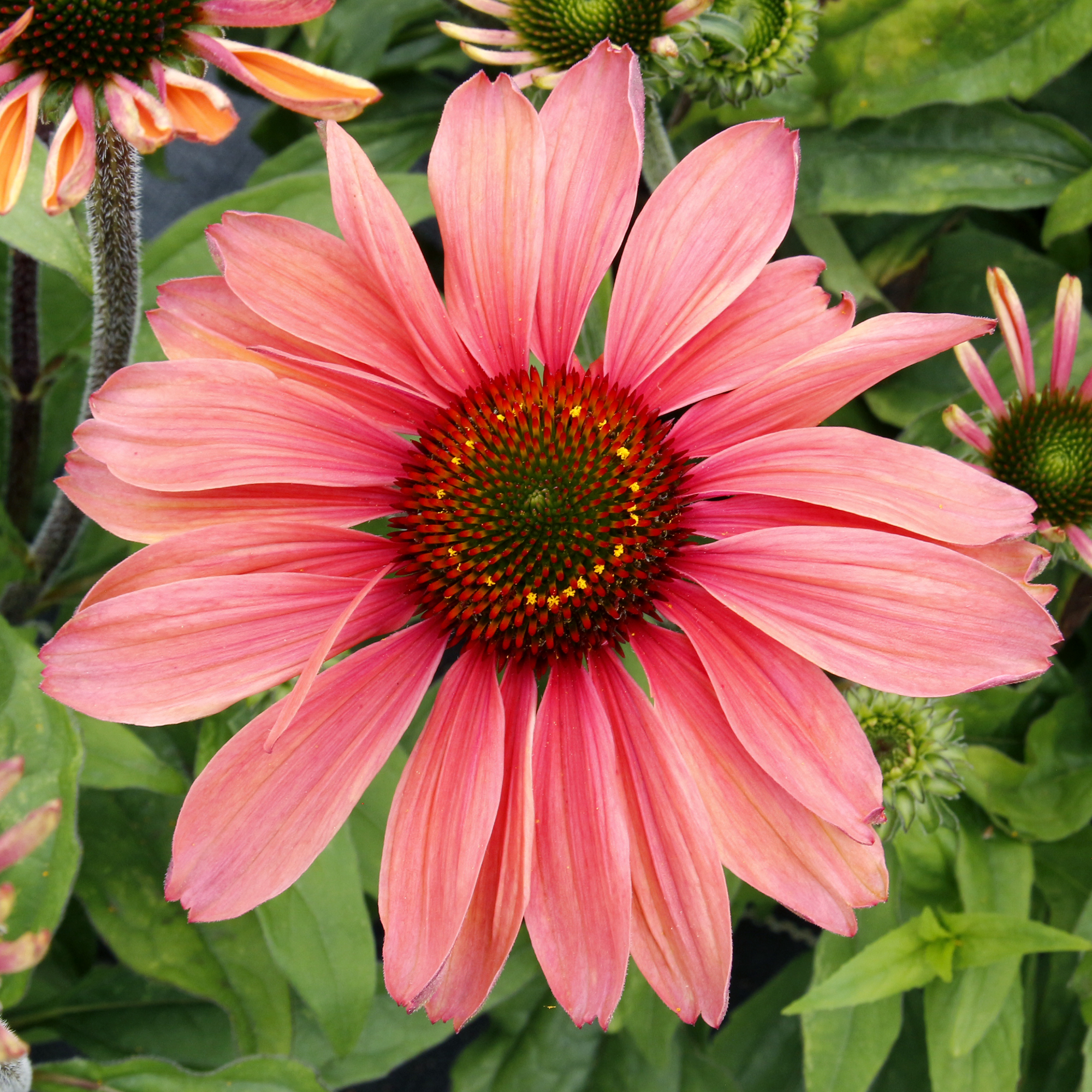 Bred as a landscape plant to have sturdy stems and present a mounding habit with good foliage cover. Like it’s sister, Echinacea REVELATION® ‘Coral’, REVELATION® ‘Monarch’ demands attention inn the garden. ‘Monarch’s’ warm peachy-orange tones light up a garden bed like nothing else. The huge flowers are well scented and attract butterflies, hummingbirds, and all sorts of pollinator insects. The large center cone has hosts of finches visiting in the fall, gathering a snack as they pass through.