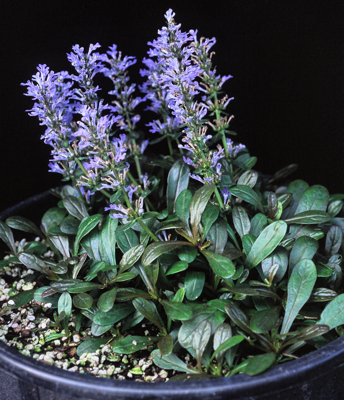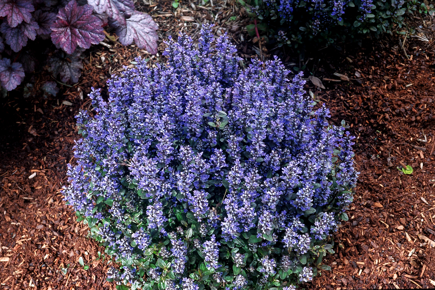 A dwarf, spreading groundcover that creates a tight mat of rich, chocolate brown foliage with dark green undertones. Charming spikes of lacy blue flowers rise above the foliage in the spring. May repeat bloom in milder climates. Beautiful in containers, around shrubs or between stepping stones. An herbaceous perennial.