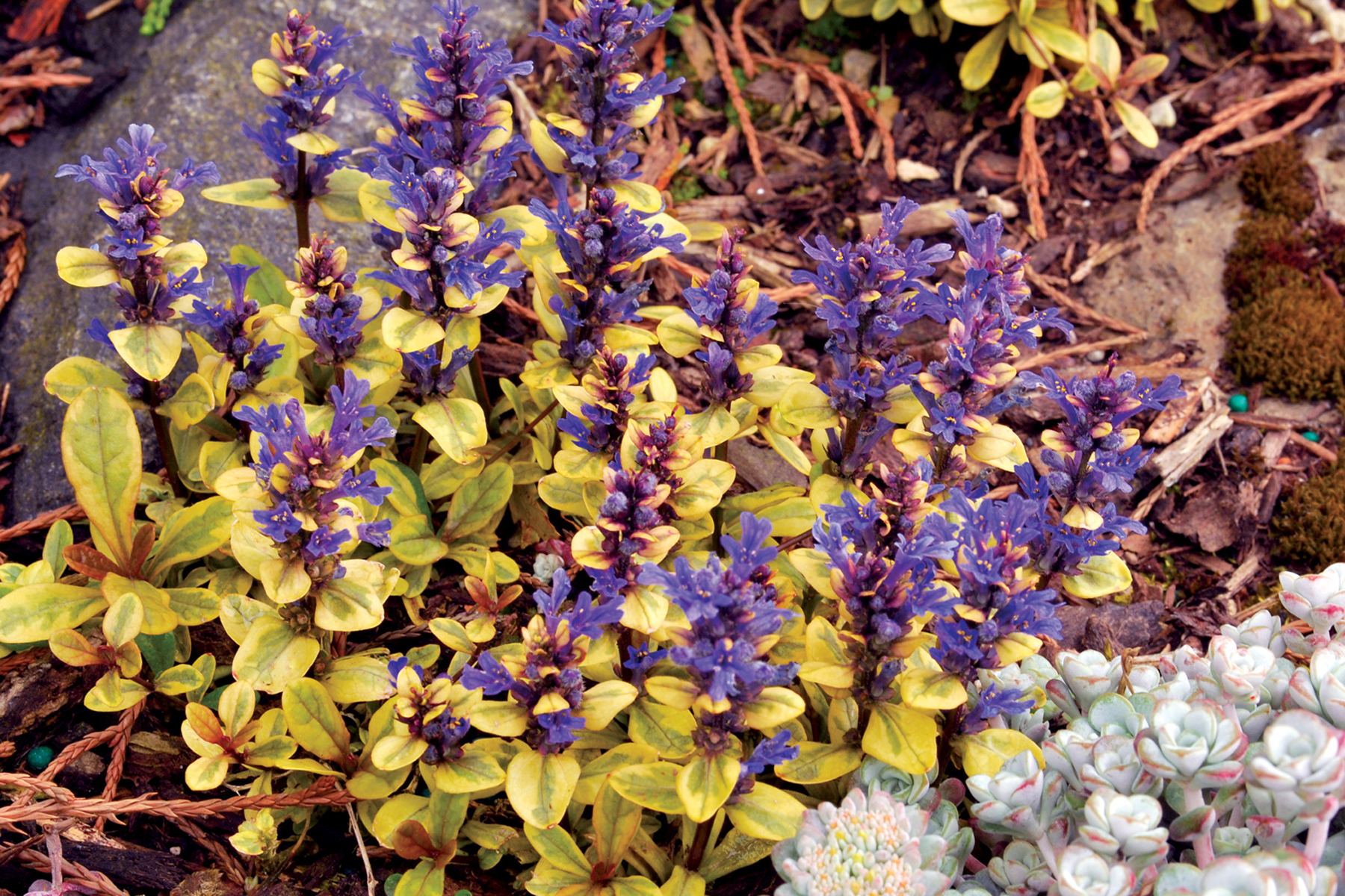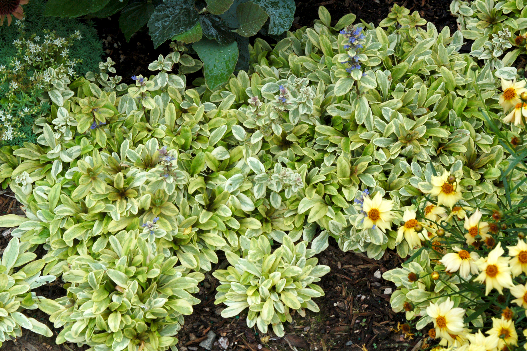 Way cool! This small-leaved groundcover is a fun departure from Ajuga 'Chocolate Chip'. Mature leaves are adorned with creamy gold margins around shades of gray green in the center. New leaves display brown and khaki shades. Blue flowers emerge from eight inch spikes.