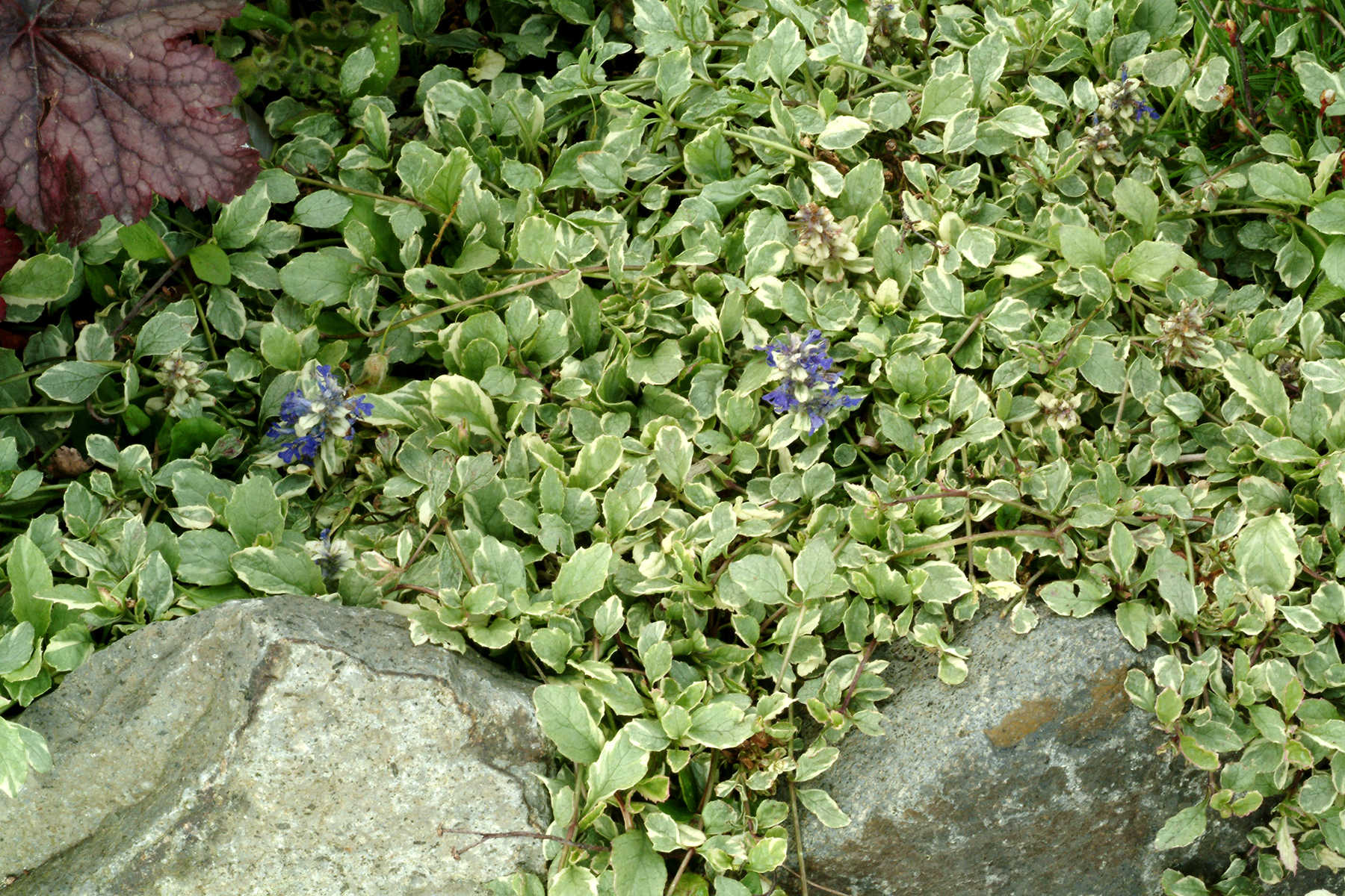 A diminutive, vigorous, evergreen Ajuga exhibiting striking flowers and foliage. Small mint-green leaves permanently retain a prominent, irregular pale creamy-yellow margin. During mid to late spring, dense upright spikes of rich blue flowers provide a brilliant color contrast with the foliage. An ideal low ground-cover in restricted spaces, on rock gardens or in containers with well drained but moisture retentive soils.