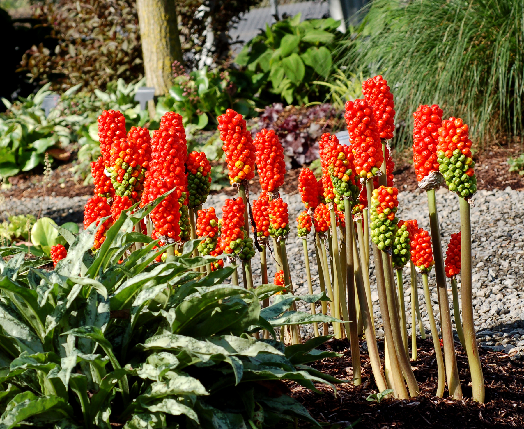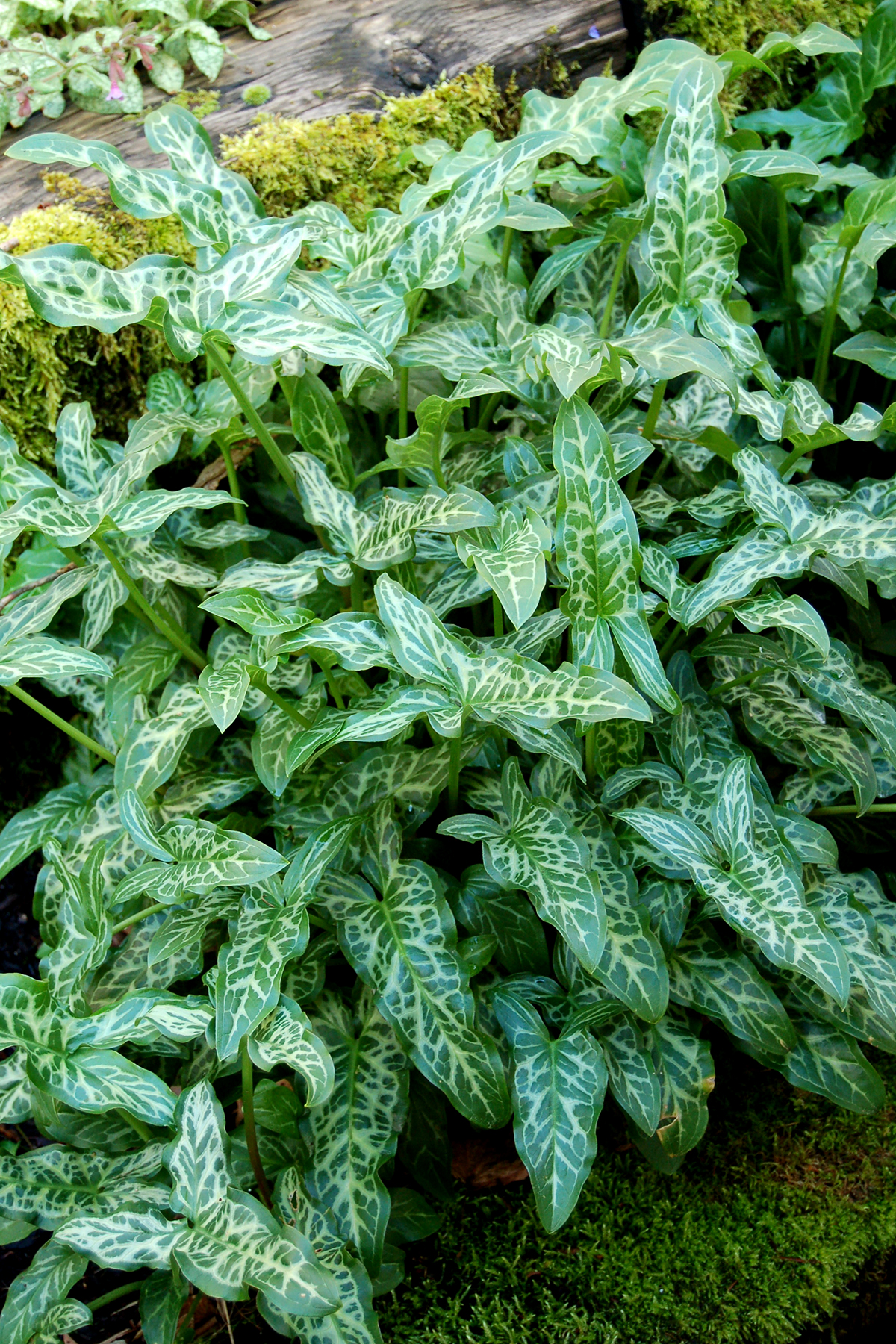 Extremely good markings of bright white on its leaves. The leaves are also narrower and more sculptured than other varieties. The leaves appear in fall until early summer then go dormant leaving orange berries for summer color. The foliage pattern is not fully visible until it reaches maturity in its second year.