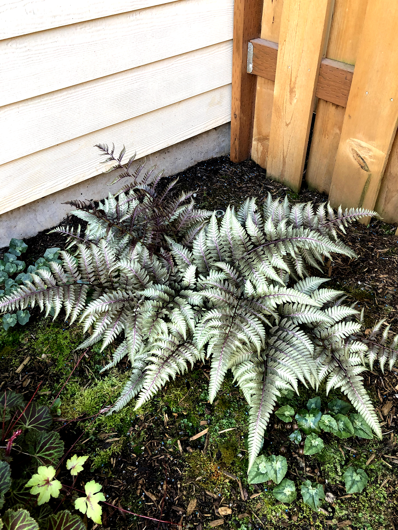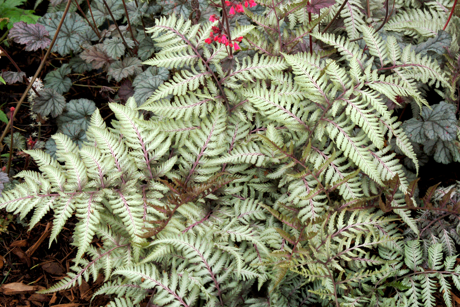 An exceptional Japanese Painted Fern with pewter metallic foliage. The deeply contrasting mid-rib in burgundy-purple is a nice plus. Tolerant of heat and humidity (will need moisture in the south). Likes a rich, fertile soil. Combines well with Tiarella and Hosta.