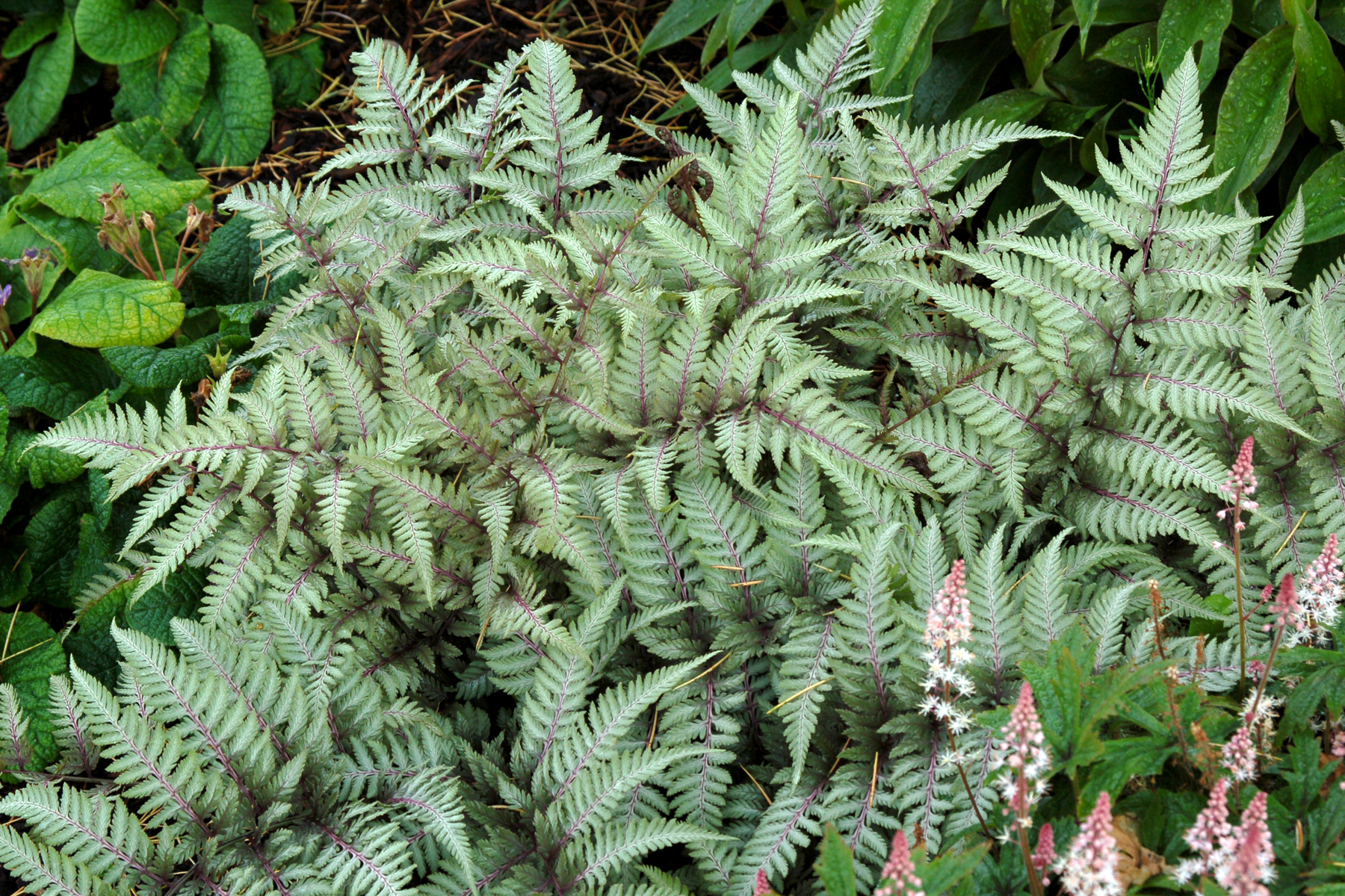 An unusual and silvered hybrid fern, painted in smoky gray and green and standing taller than some of the other Japanese ferns.