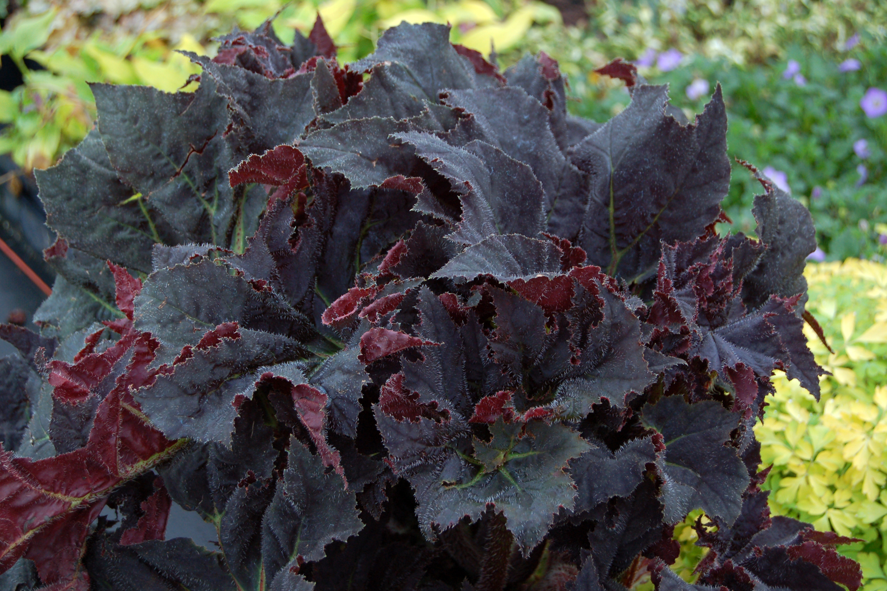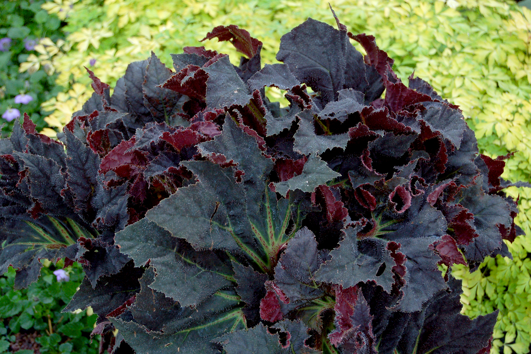 Large, crested, obsidian-black leaves to 8″ wide have a lovely burgundy red reverse. Its sturdy rhizomatous heritage makes it stronger than any Rex Begonia. Great in the house or in the shade garden. Vigorous grower to 18-24″ tall and wide. The breeder describes it: “Very large black star shaped textured leaves. Pink flowers. Most impressive.”