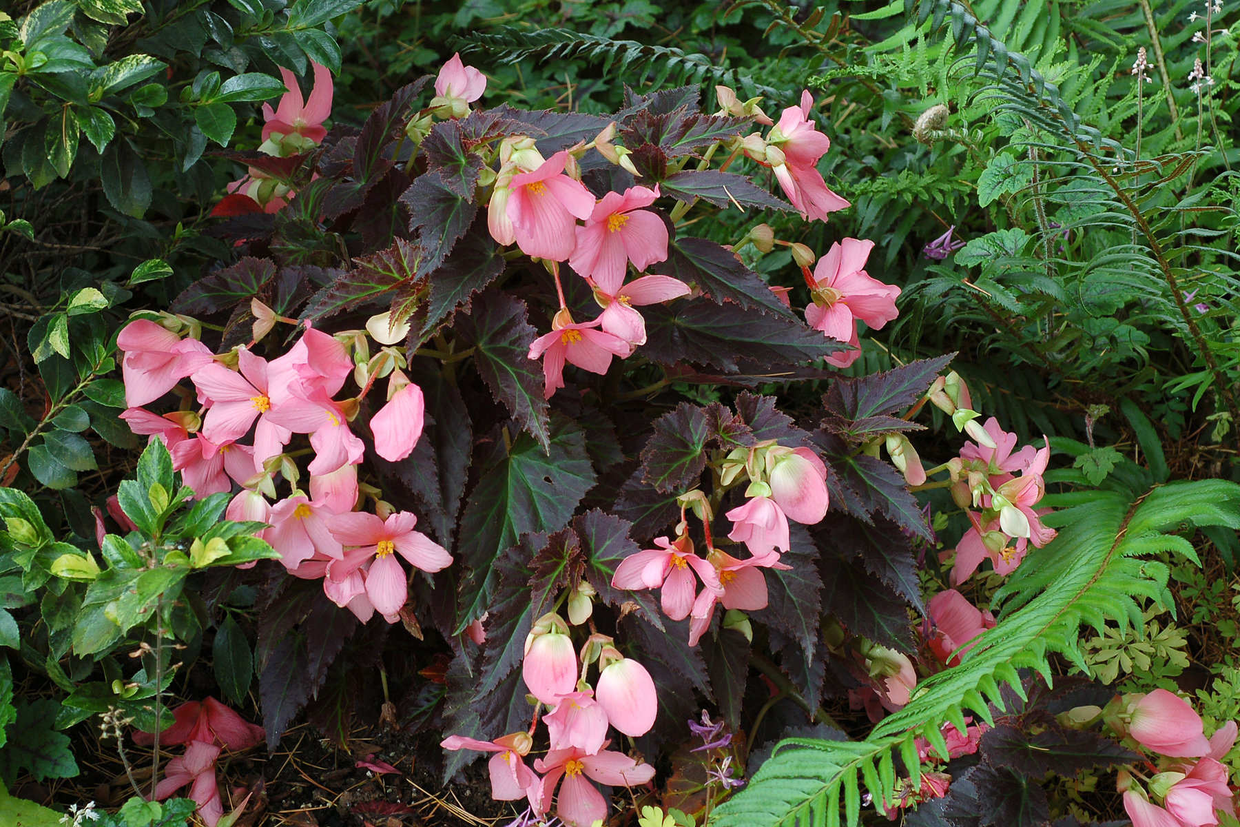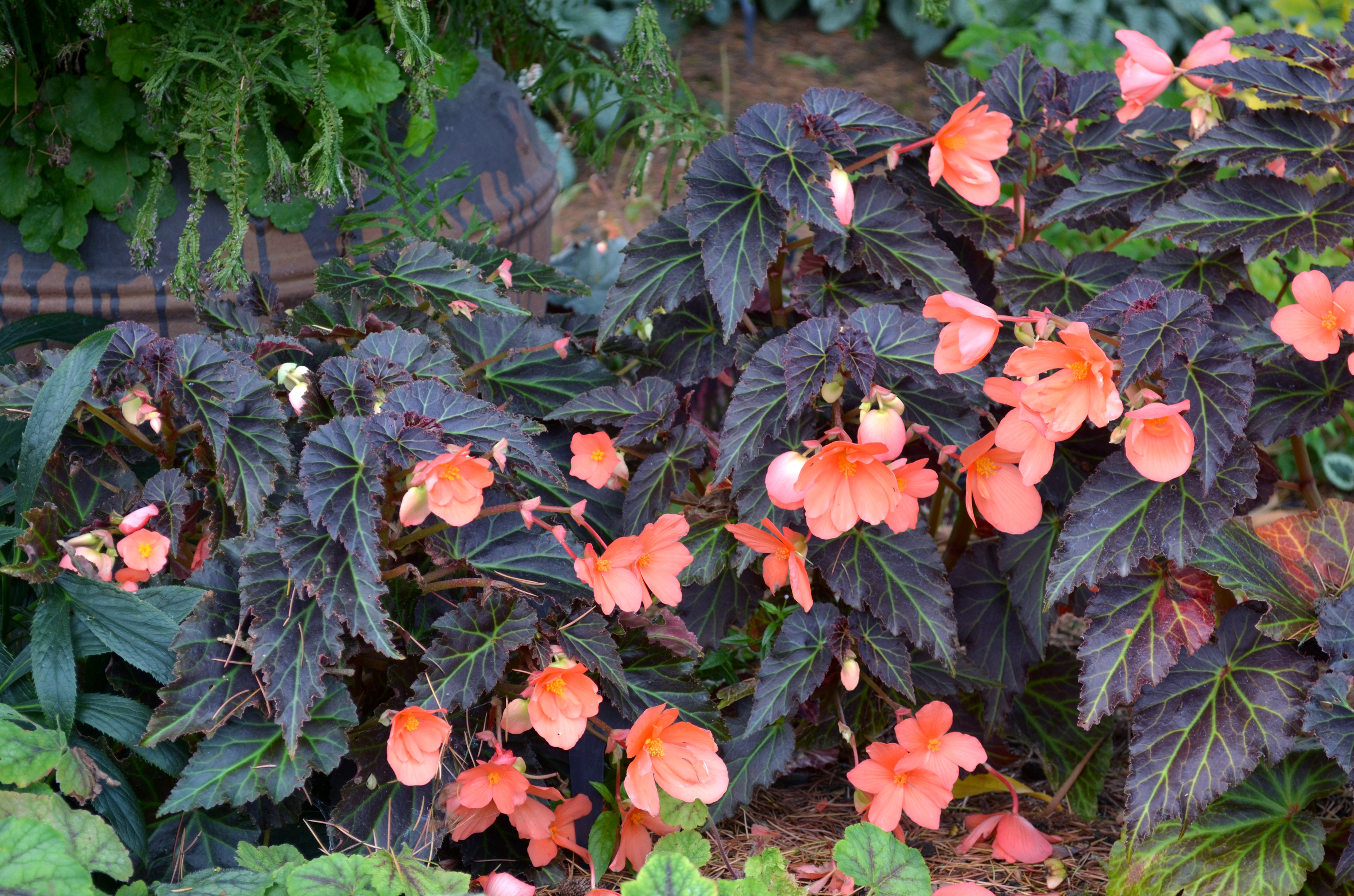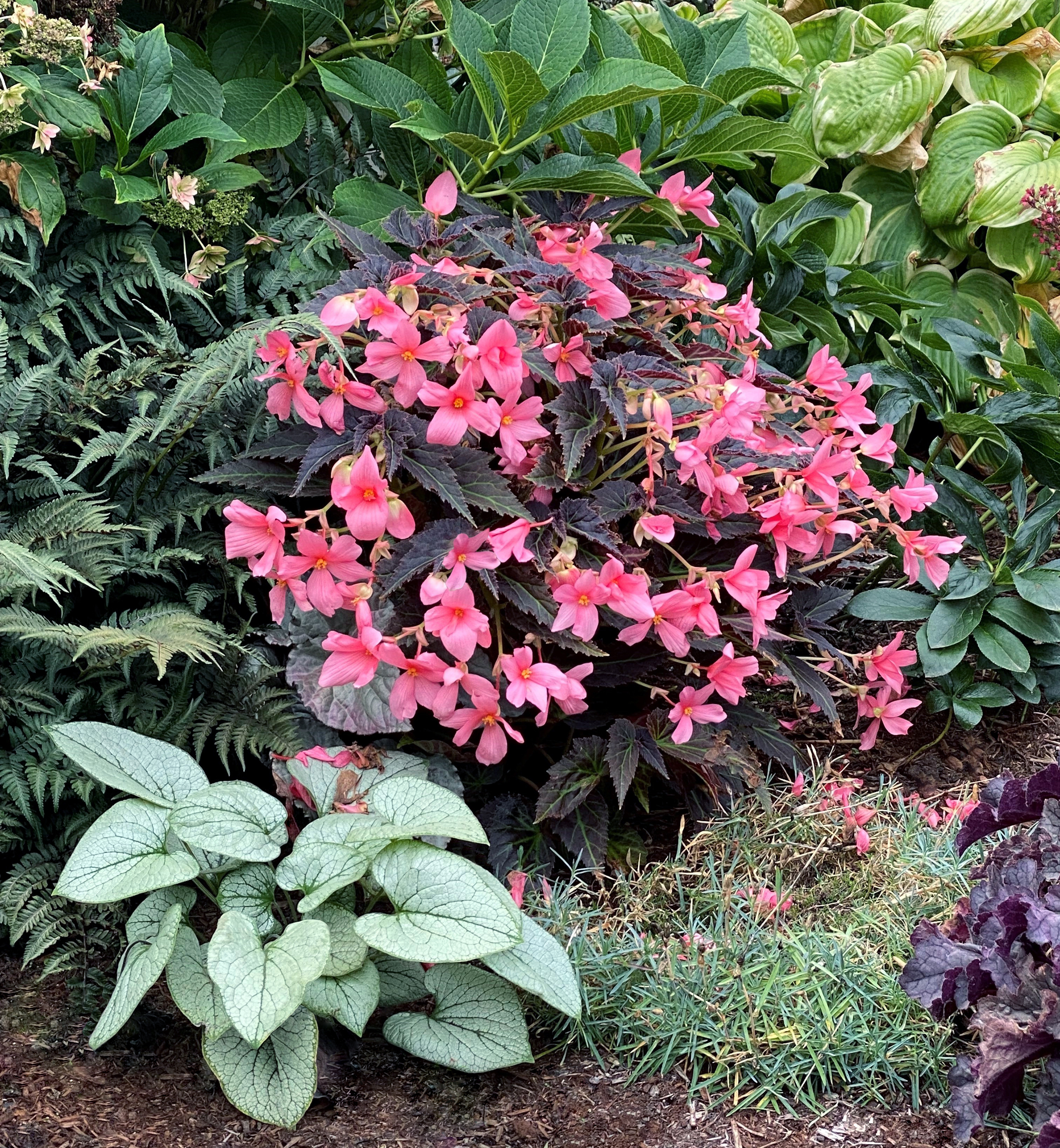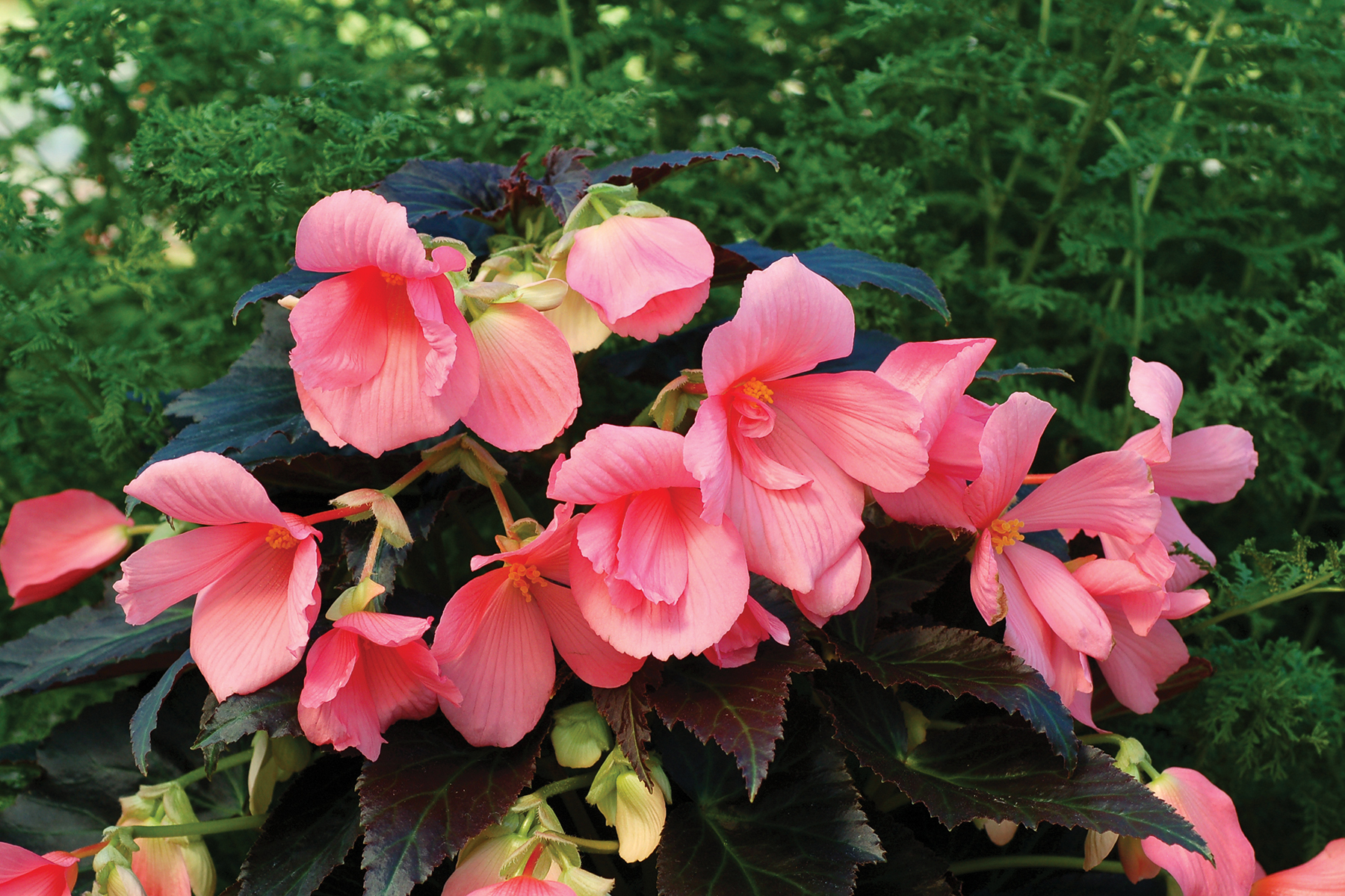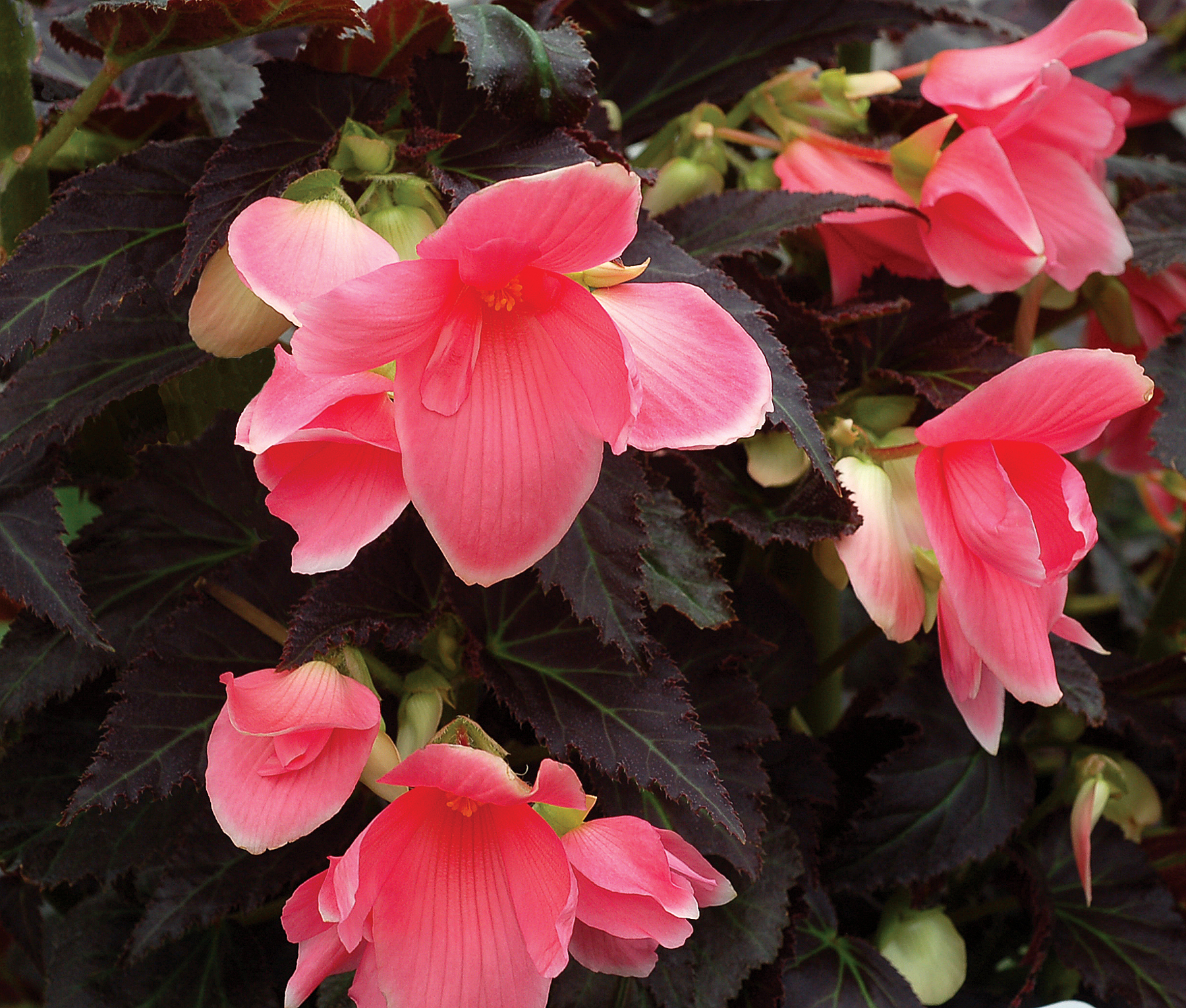 Large, single, shrimp pink flowers resemble hibiscus blossoms. These appear in clusters and face slightly outward on a large, upright plant with dark cocoa brown foliage. It is glamorous and elegant with movie star good looks. It grows with an upright habit to 2' tall. It is impressive in mixed shade containers, as a houseplant and is stunning in garden beds. 'Enchanted Evening' is a selection that just keeps blooming, even during the winter indoors.