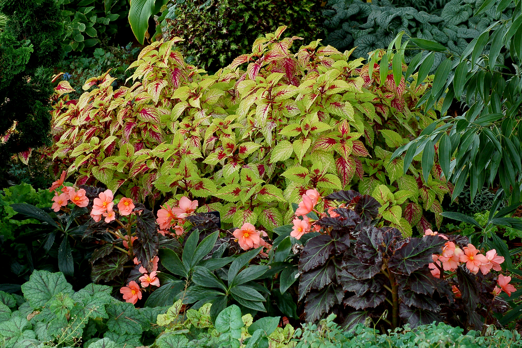 Large, salmon-orange blooms contrast beautifully with the dark chocolate leaves embossed with lime-green veins. Glamorous and elegant in mixed shade containers or in the border. It's also a fabulous houseplant and even blooms during the winter. Upright and great for a patio planter.