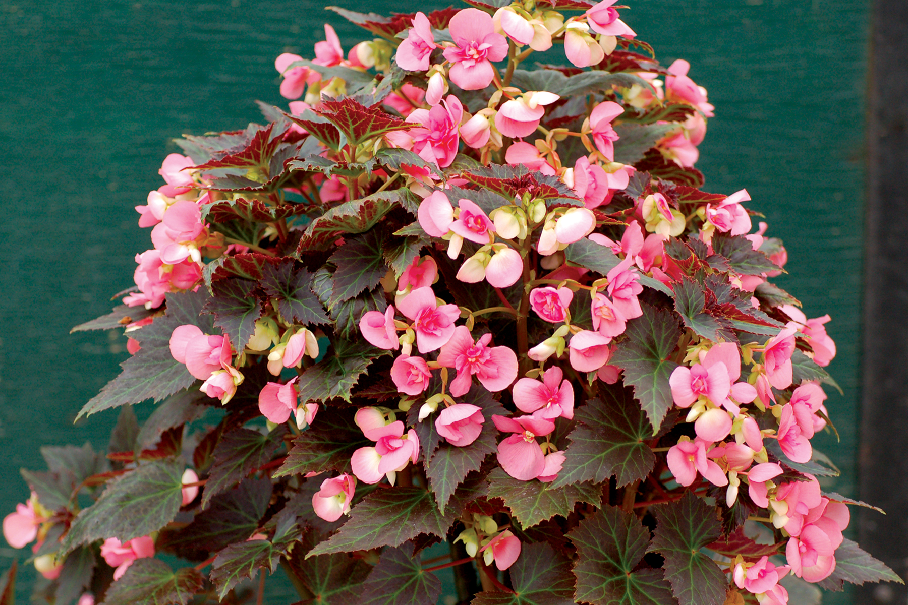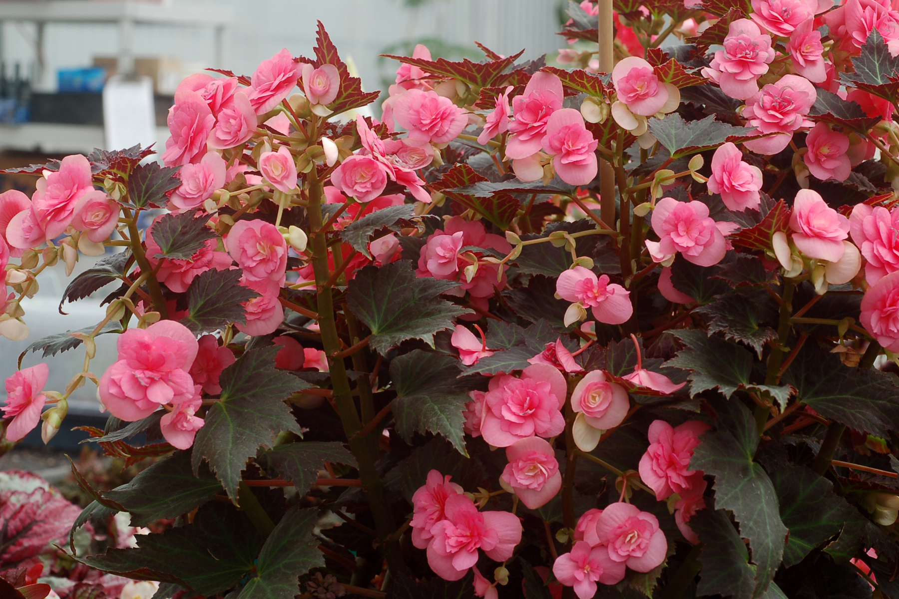 Begonia COCOA™ 'Puff Pink' has fully double flowers in a “puff” of pink over dark foliage. This redo of the Reiger Begonias put the same unbeatable bloomability and even more interesting foliage into a very easy garden and container plant. Cocoa brown leaves with glowing emerald veins are smothered with pure pink powder puffs for months, and as a houseplant, it never stops blooming. Fairly sun tolerant, this upright beauty remains showy in the garden. Sterile flowers drop cleanly.