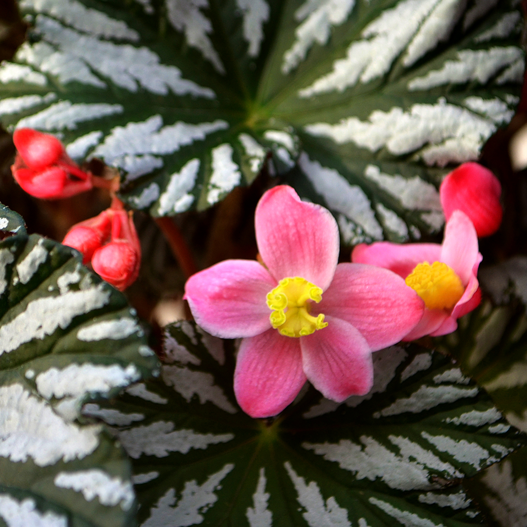 Very vigorous selection shows well; spring, summer outside, and especially in winter indoors. An elegant house plant, it appreciates a cooler home and isn't stunted by coolness, like the older begonias. It grows as a very round mound, perfect for a manicured patio pot, or as a neat garden plant. The leaves are very similar to its siblings, rounded, ruffled and possessing a red back.