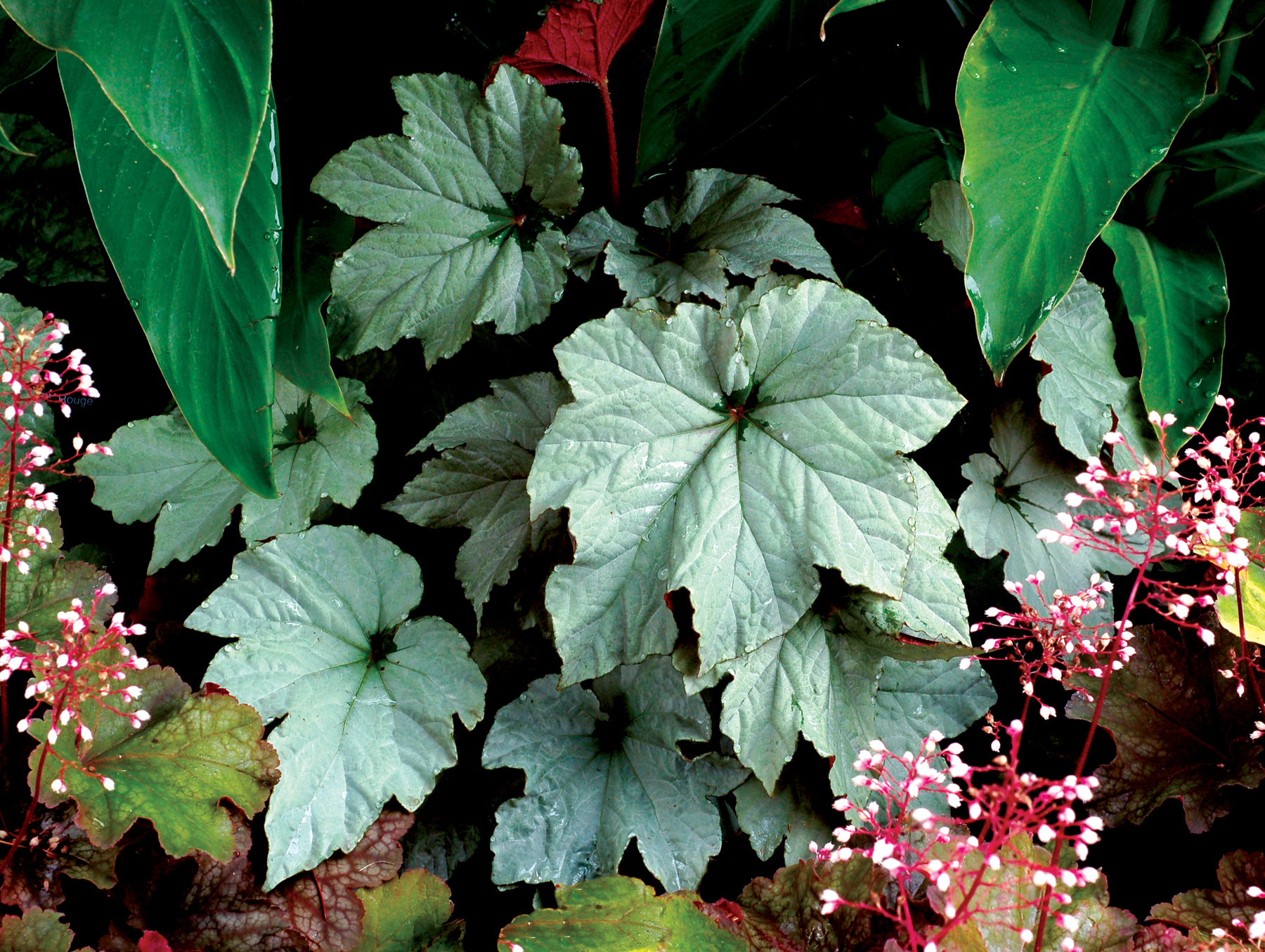 Broad oval leaves, casually fluted, pointed and ruffled, are held on a mounded, stout plant that has a quiet, dignified presence. Satiny, pewter colored leaves are accented by a deep green heart, held in a snowflake pattern at the center of the leaf. As the leaves ruffle and twist, they hint at the dramatic red back. Another cool growing Begonia for smart growers.