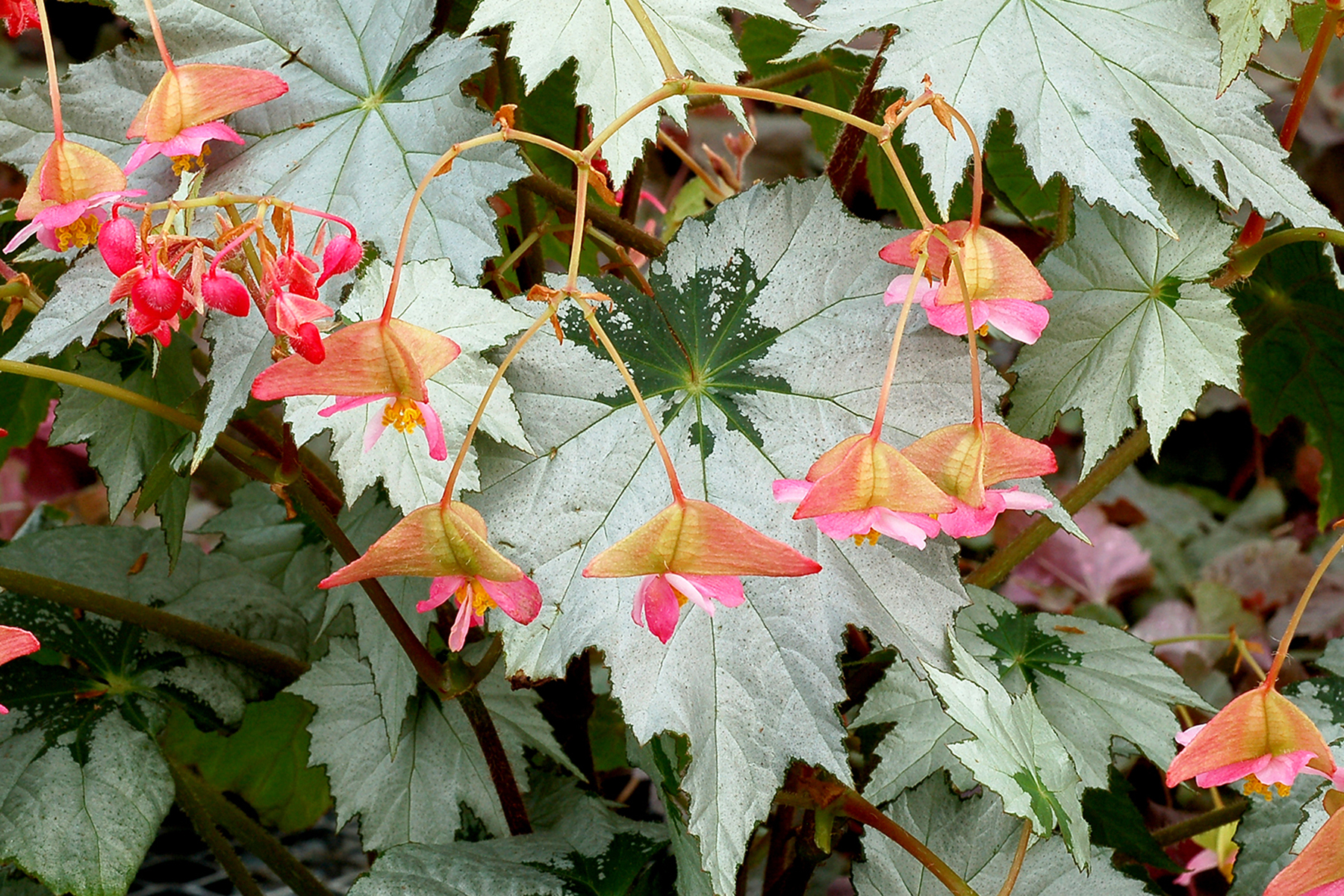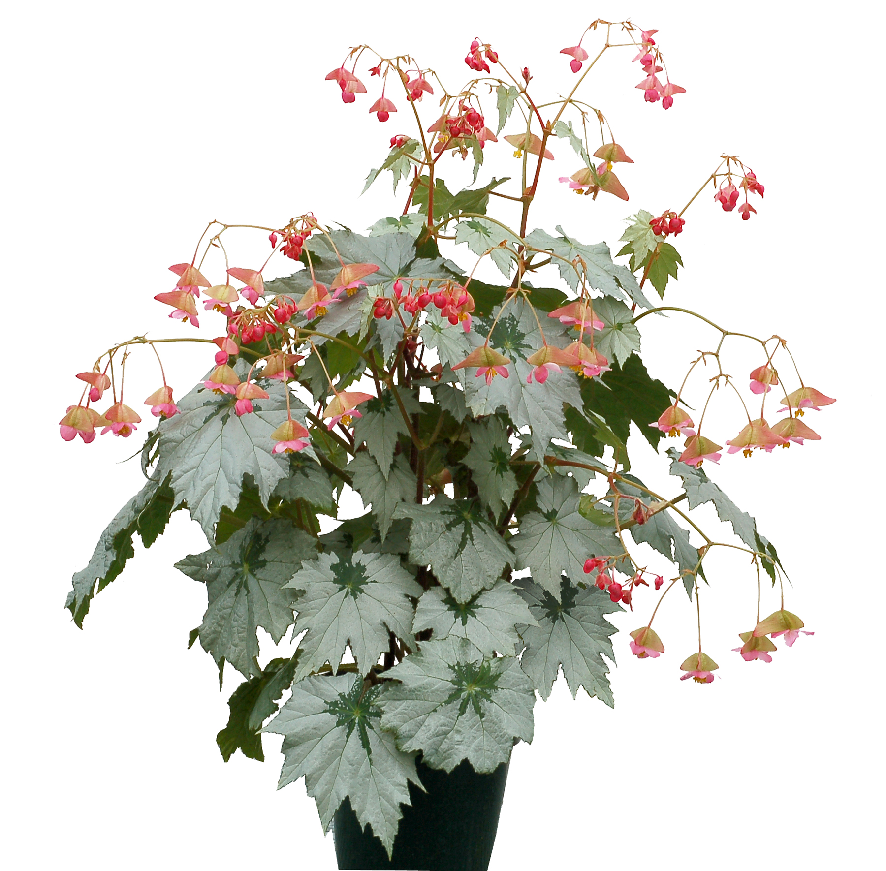 A medium, mounding plant with lush, snowflake-shaped foliage. Leaves are a shiny sterling silver with a mint green center. Showy pink to salmon flowers in abundance. Beautiful in a combo with red and white Poinsettias.
