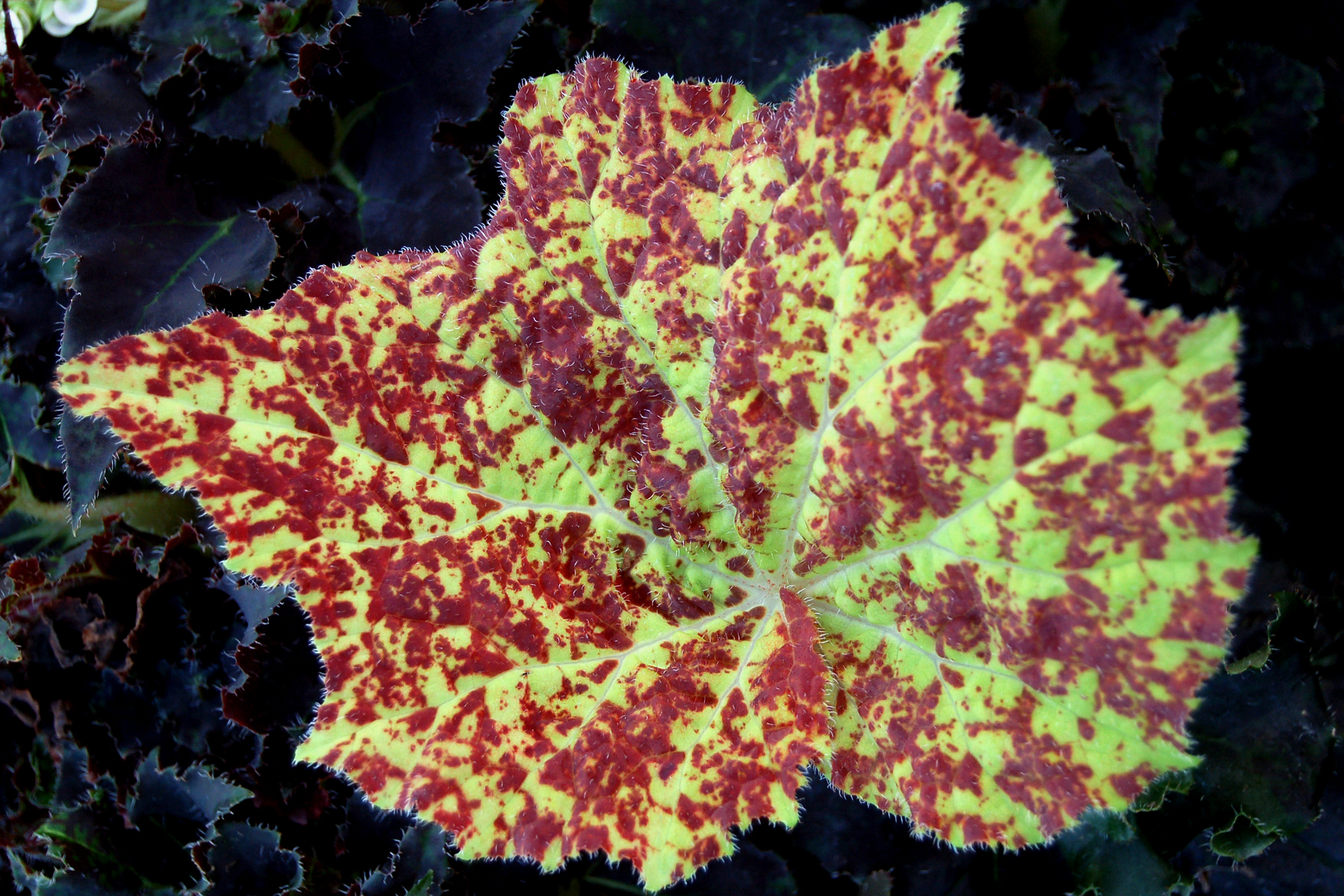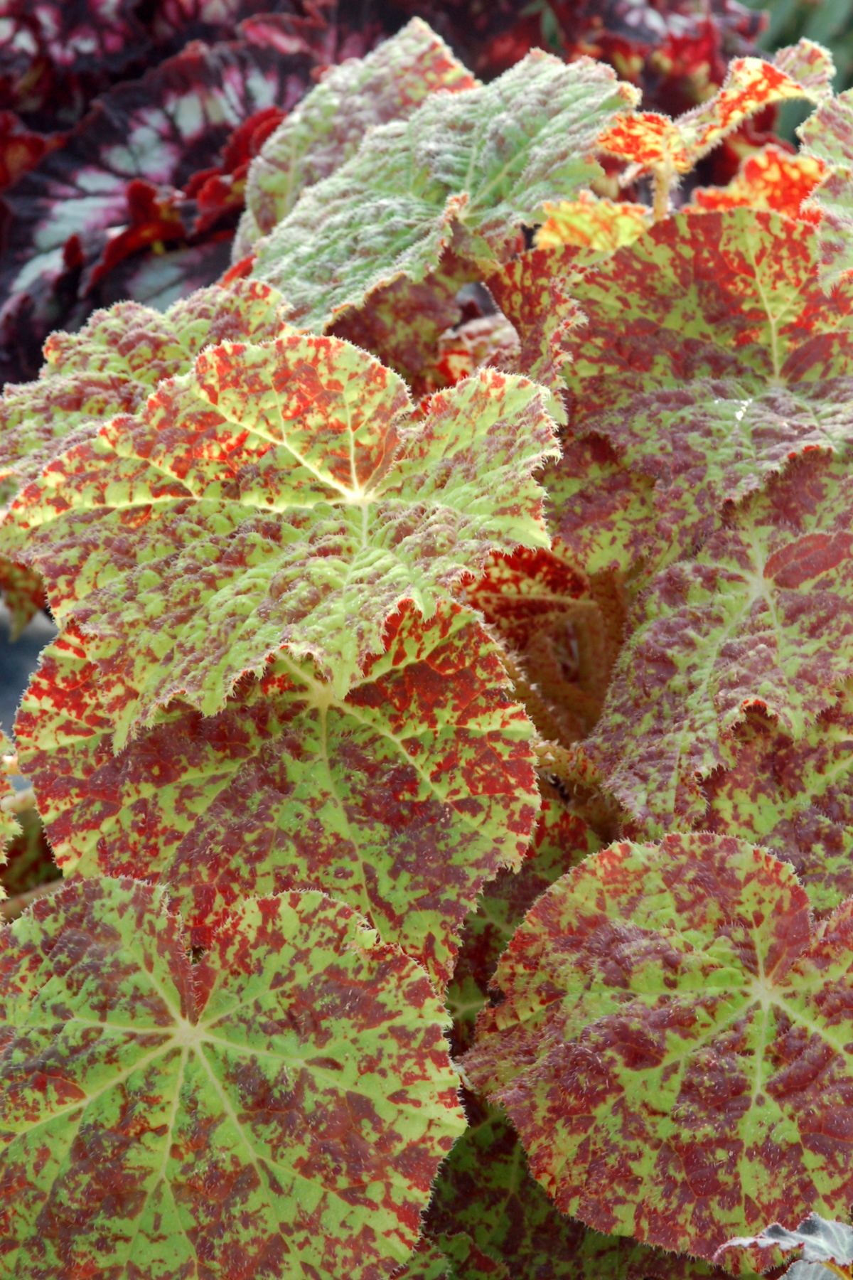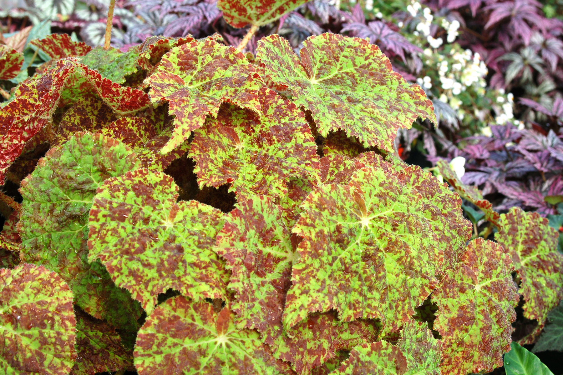 Maple shaped leaves have red splashing over a yellow-green background on this big Begonia. A wonderful summer annual or house plant. Tall white flower spikes add a great bonus in winter. The Royal Horticultural Society was so impressed in this plant's strength and stature, that they gave it an Award of Garden Merit (AGM)! Easy and fast.