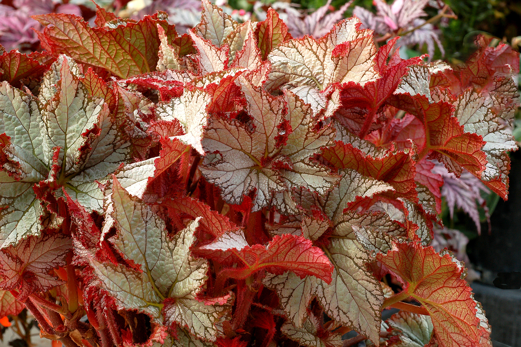 Showy cut leaves with swirling leaf bases. The leaves are silver on top and red on the bottom are making them glow. Forms a medium size plant with a dense, mounding habit.