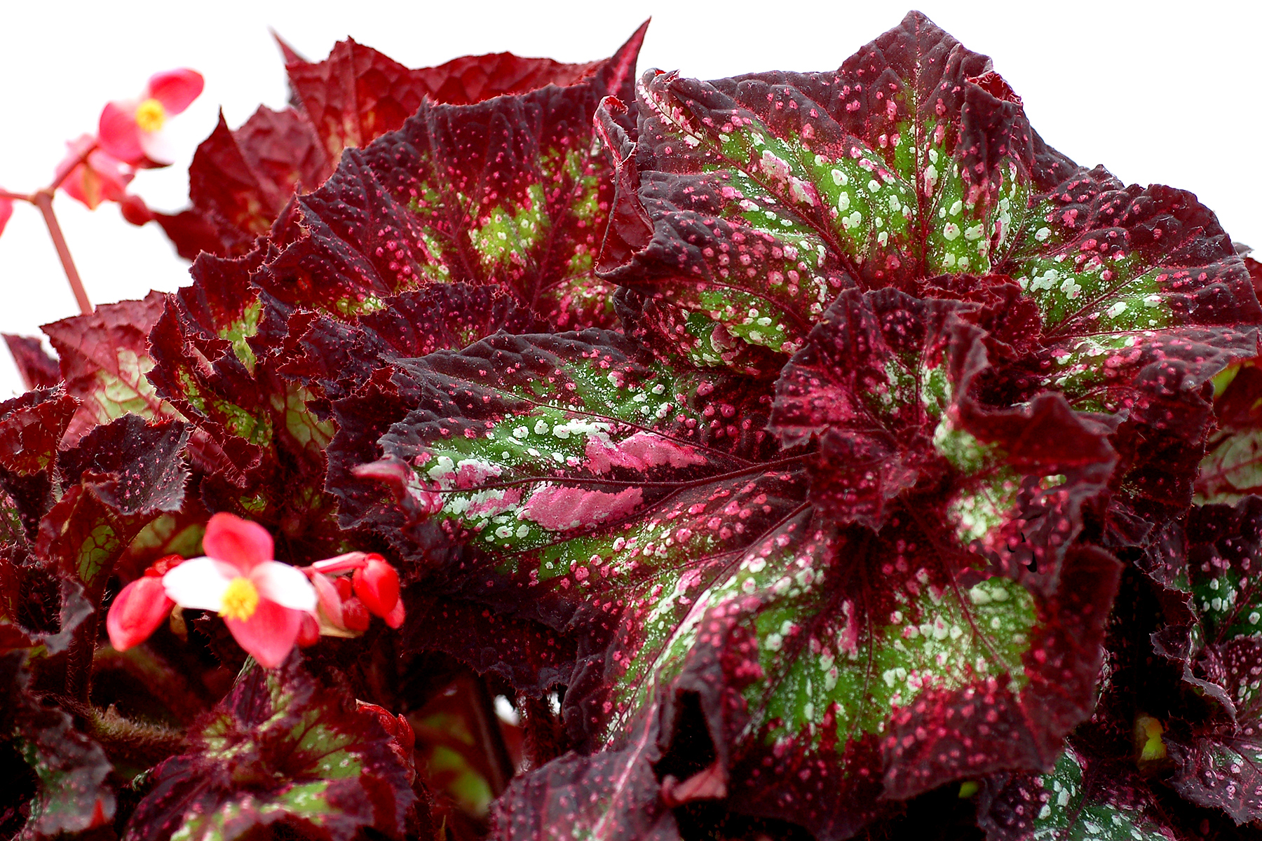 Heavily swirled and pointed leaves. A dizzying combination of emerald green, white, ruby and maroon. Color bands radiate throughout the leaves. Large and easy to grow. Distinctive red and white male flowers.