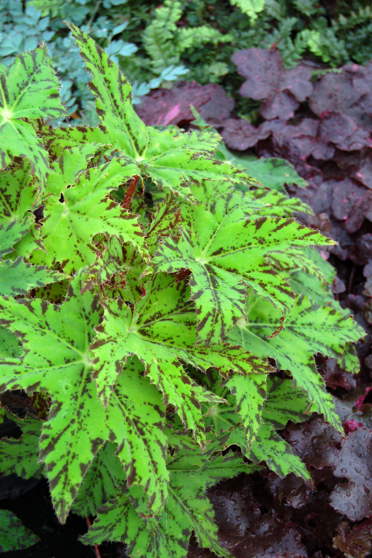 Vivid chartreuse leaves sport mahogany-red splashes. Tough rhizomatous heritage makes it stronger than any Rex Begonia. Thrives in containers, shade gardens, windowsills.