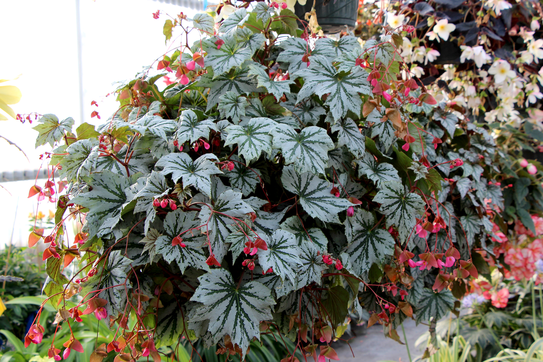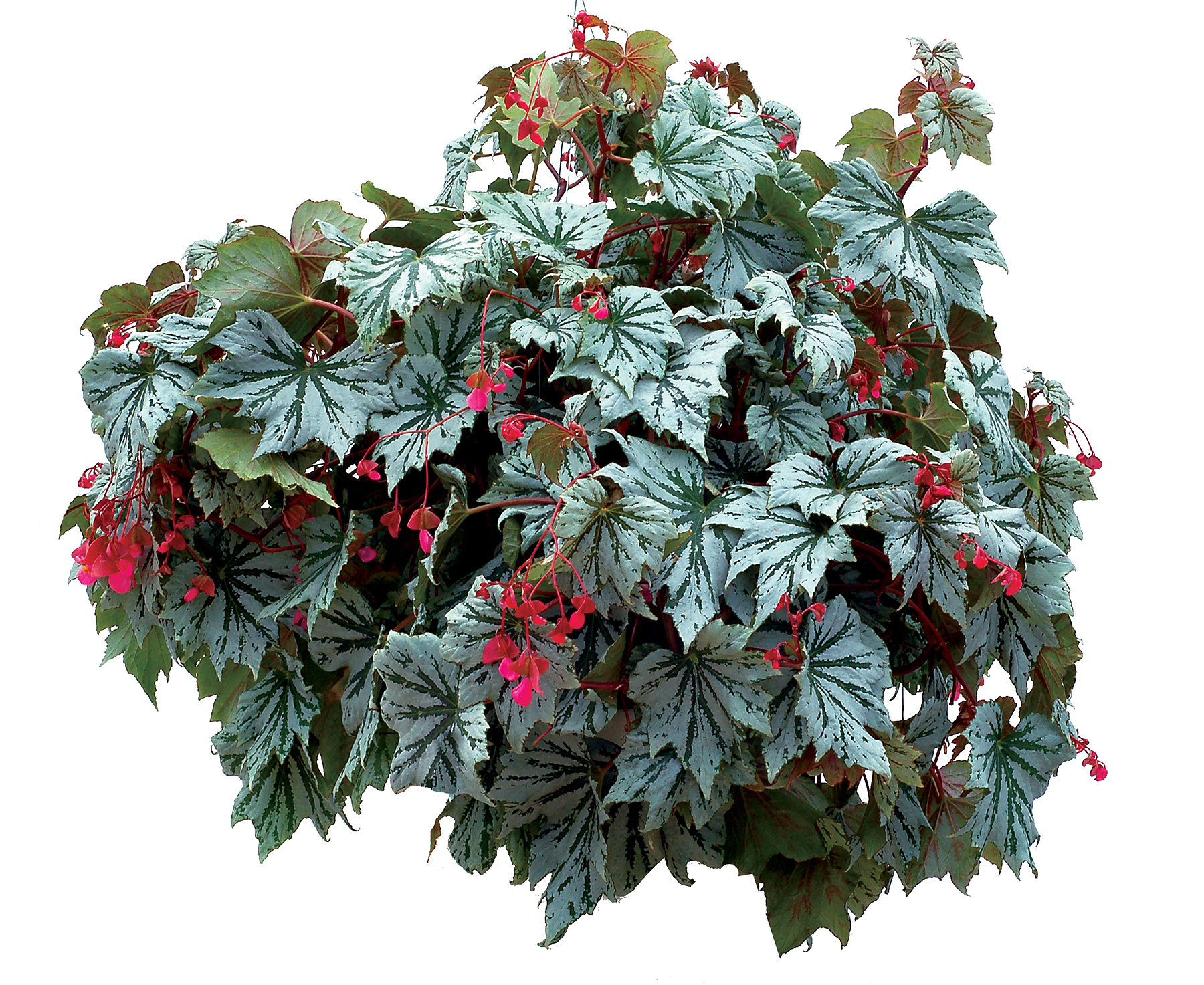 This unusual Begonia has broad, maple-shaped leaves of glowing mint green and silver-white. It is vigorous and well branched and forms an impressive 10″ basket. The flowers are red-pink and are long lasting, pendant, and showy. Easy to grow.