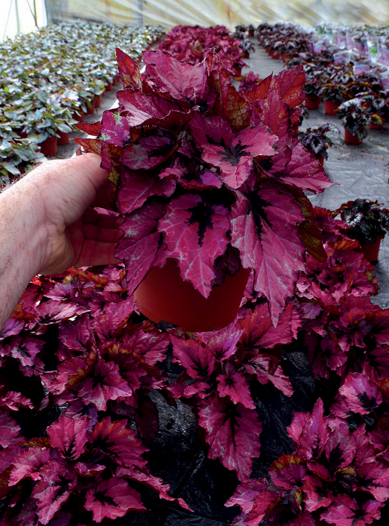One of the most fantastic Begonias we have ever seen! Deep ruby red leaves are super glossy with a saucy, little black stripe on the mid rib. Excellent for a cooler greenhouse, but performs just as well with heat. Selected as 'Best Novelty' in the 2019 Annual Trial at Colorado State University (CSU) based on its vigor, uniformity, floriferousness, and tolerance to environmental and biotic stresses.