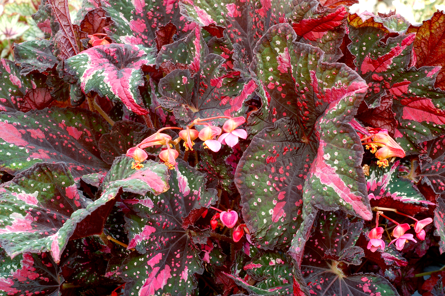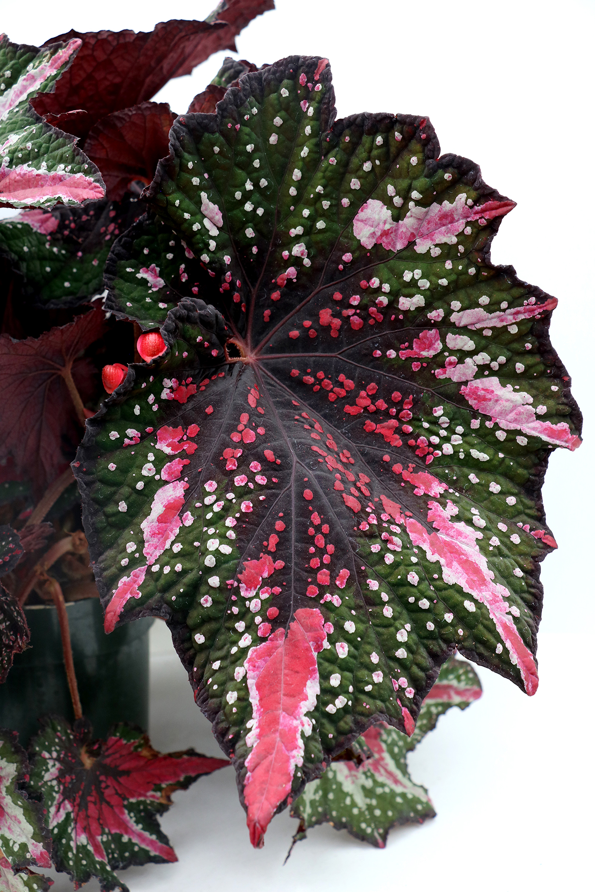 Large, exotic leaves with a jolly red center surrounded by emerald green and white polka dots. With its dense mounding habit and lovely pink flowers, you'll love this one in containers inside or out. Excellent in the landscape.