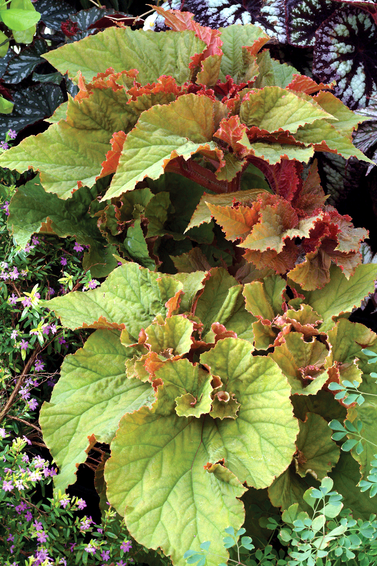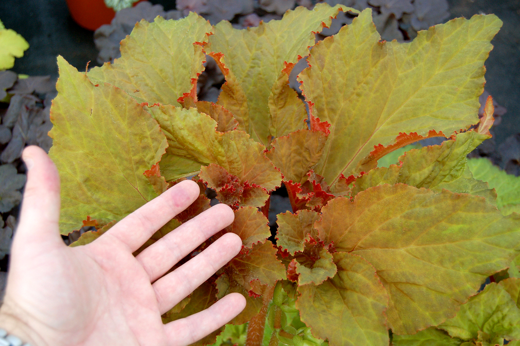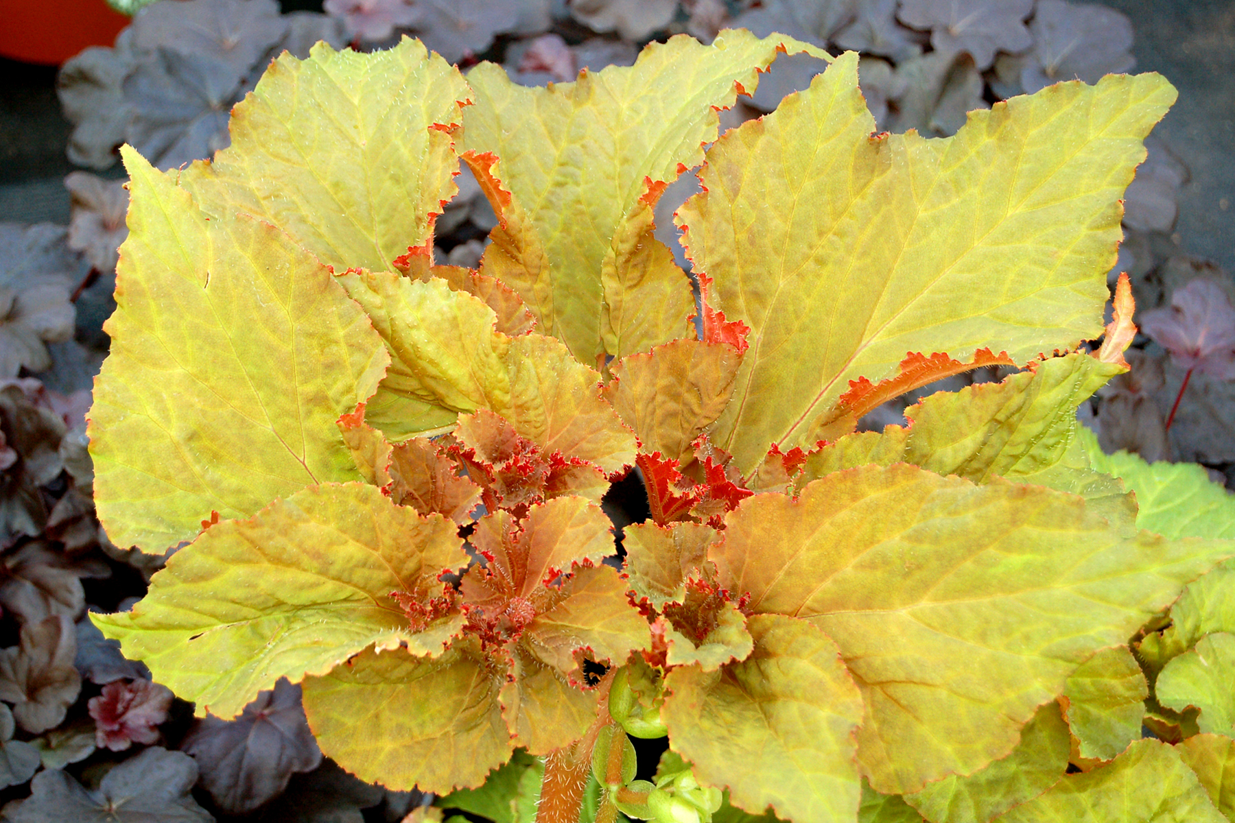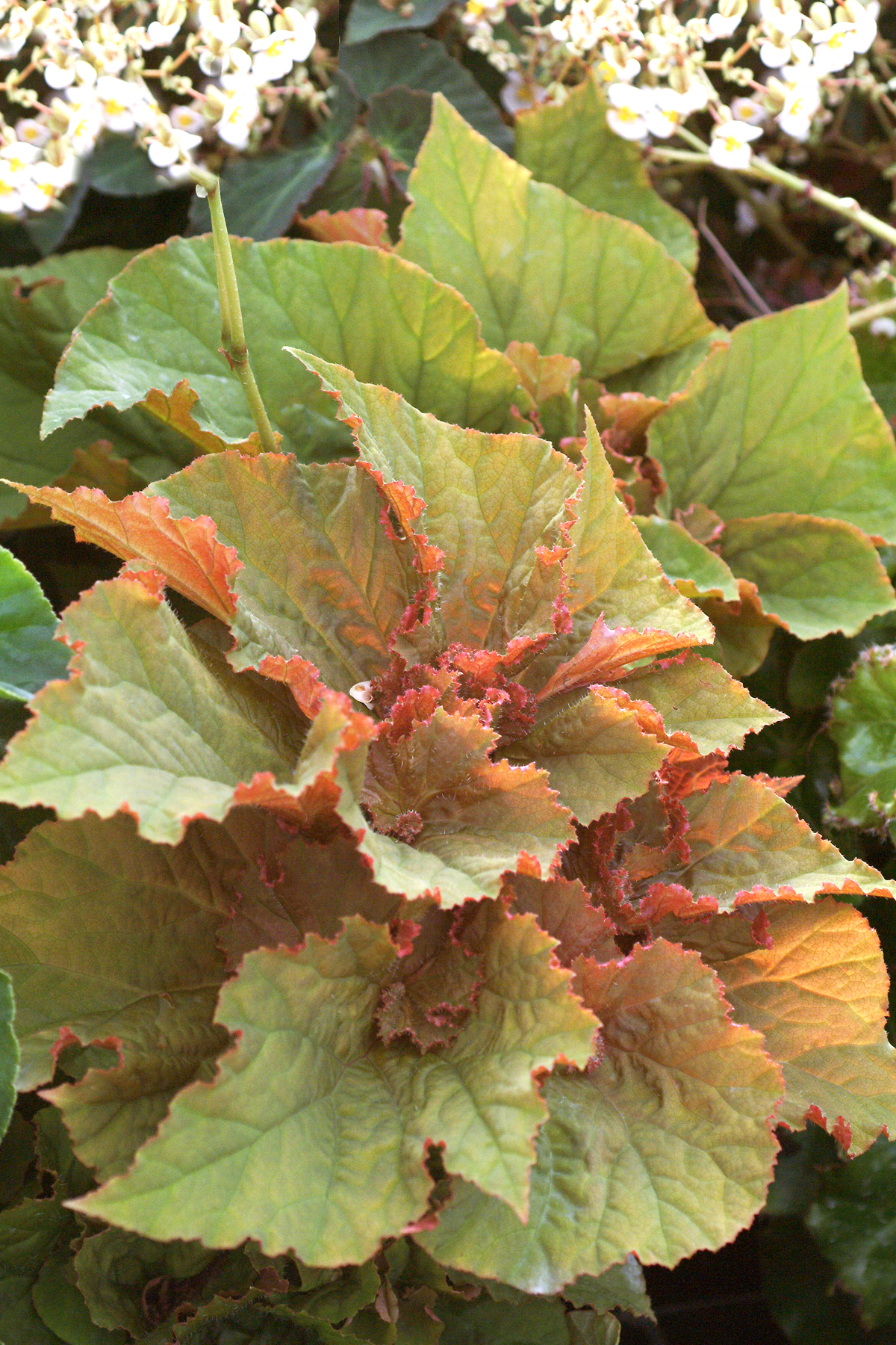 An awesome begonia sporting swirling pumpkin-pie colored palmate leaves. Striking accent plant for containers or the summer garden.