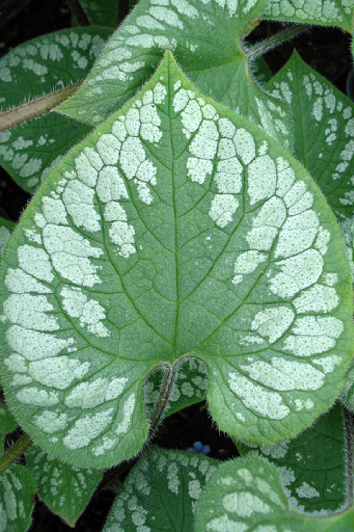 Splashes of antique silver mist over emerald green hearts create a distinctive addition to your garden. Like a jeweler's best work this elegant, NEW Brunnera, is a garden gem. Superior markings over Brunnera 'Langtrees'. Light sapphire blue flowers hover over the foliage.