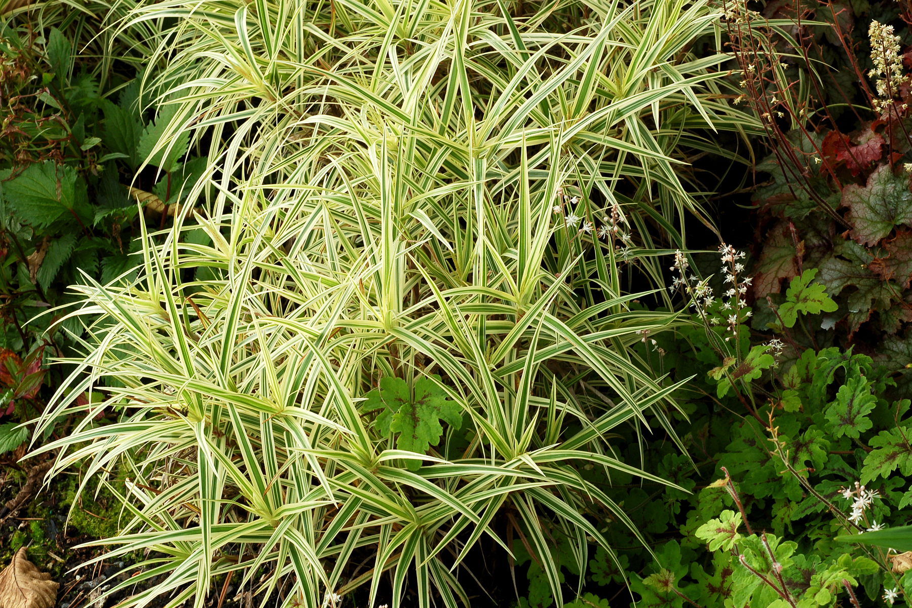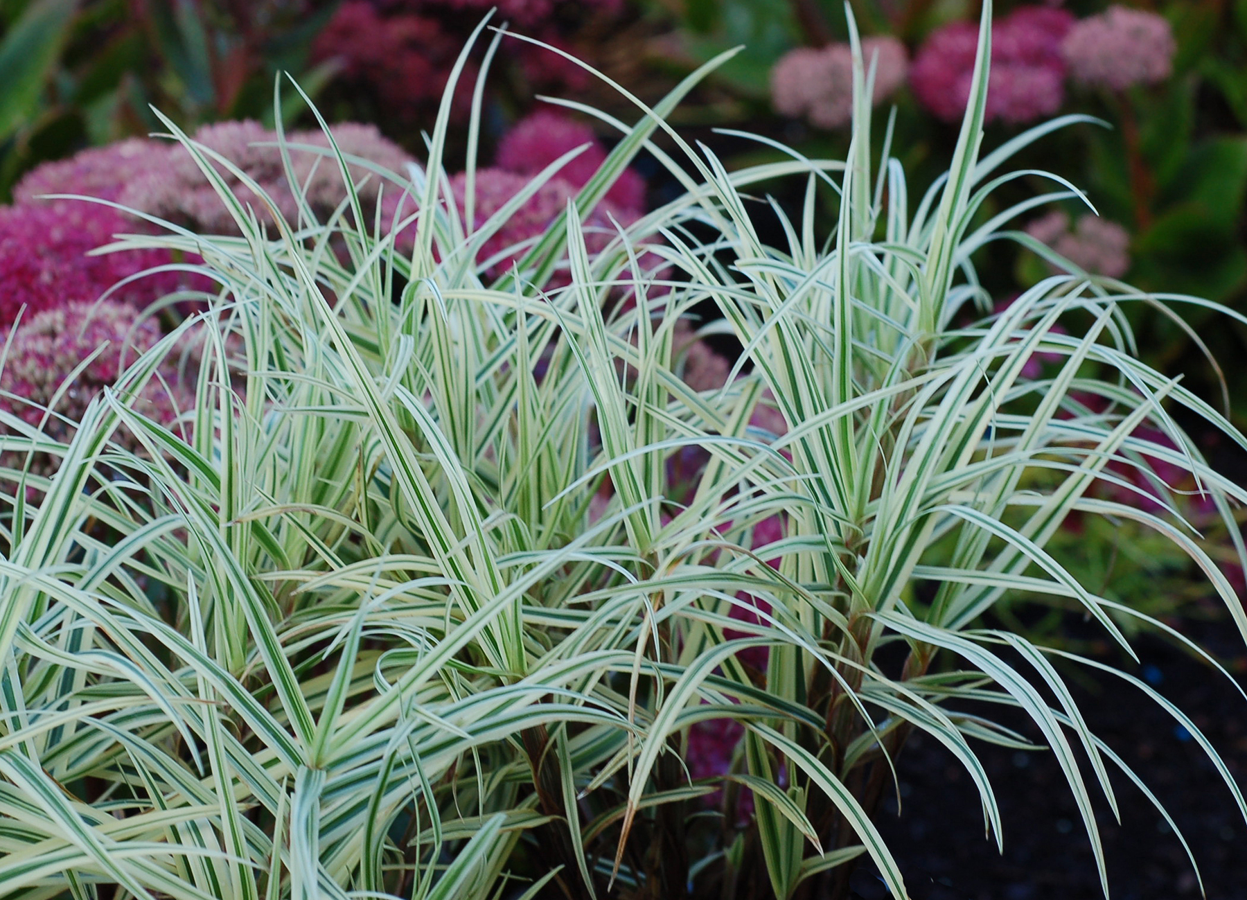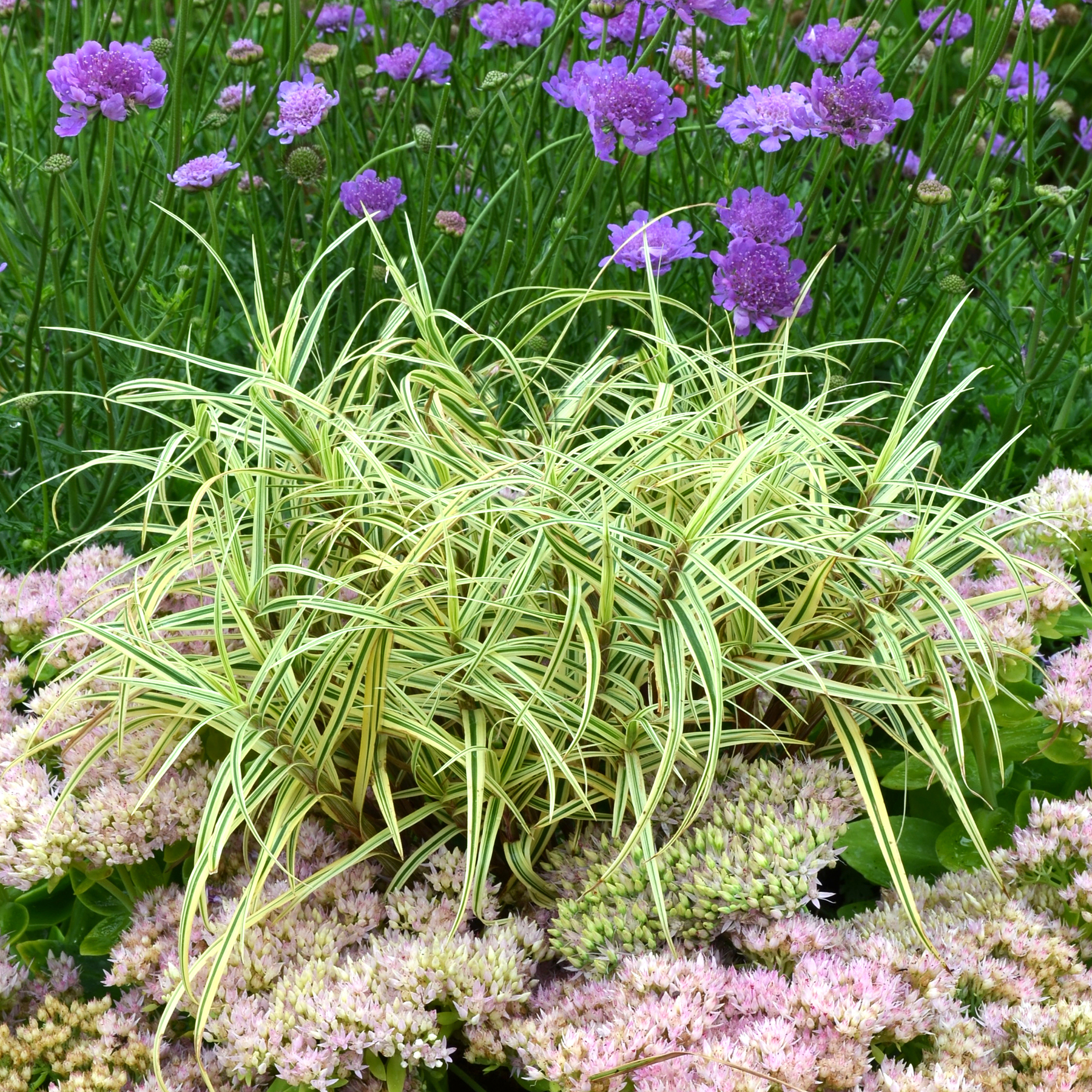 Forms short, tight clumps of spiky, variegated foliage. It's a great blender and filler for the garden or in a container. This deer-resistant, evergreen sedge thrives in moist garden conditions. A wonderful component in mixed containers.