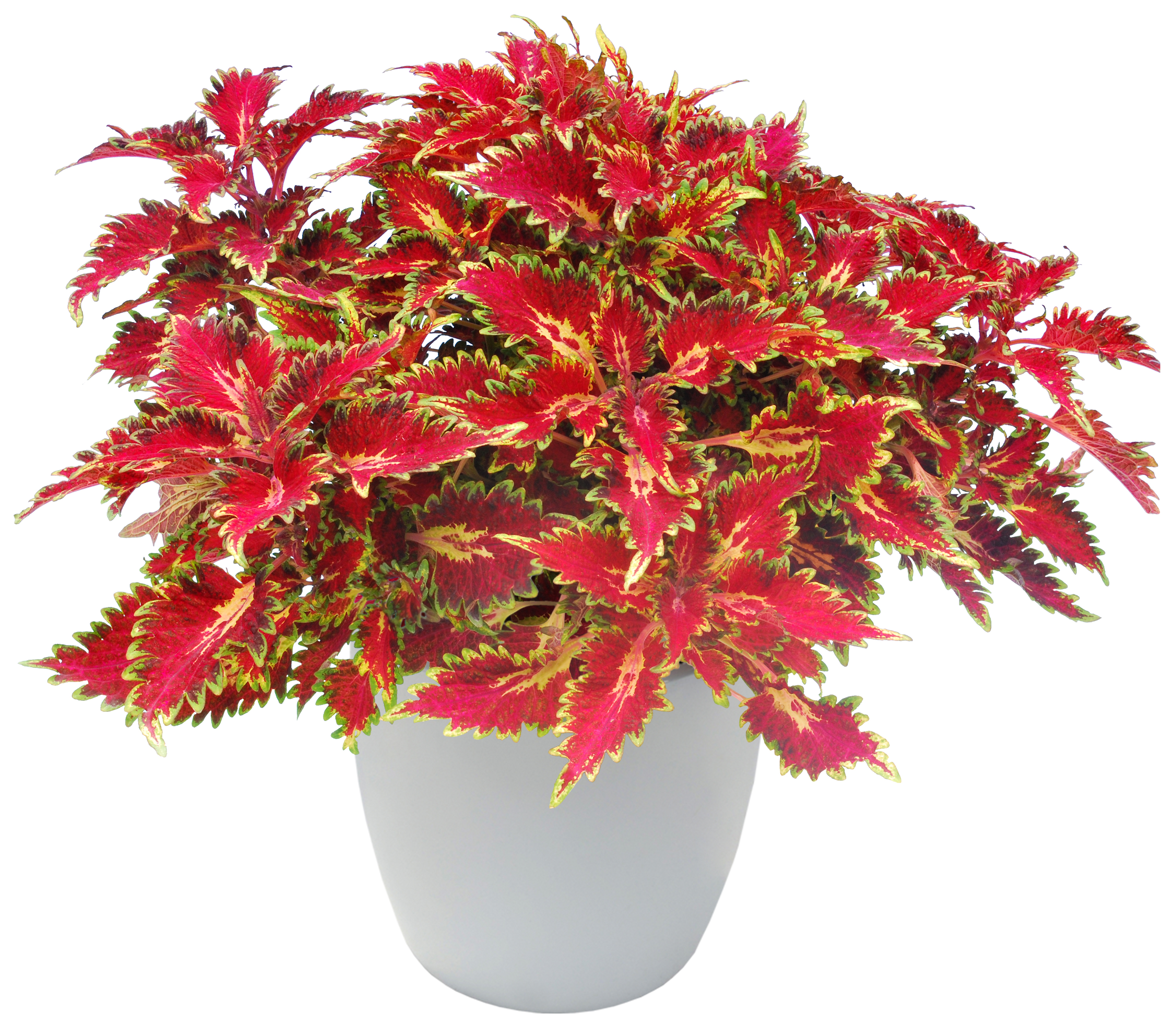 ‘Flamenco Flare’ is a low, self branching Coleus with bright red leaves with yellow to lime green markings. The yellow to lime green markings are on either side of the main vein and accent the jagged leaf edges.