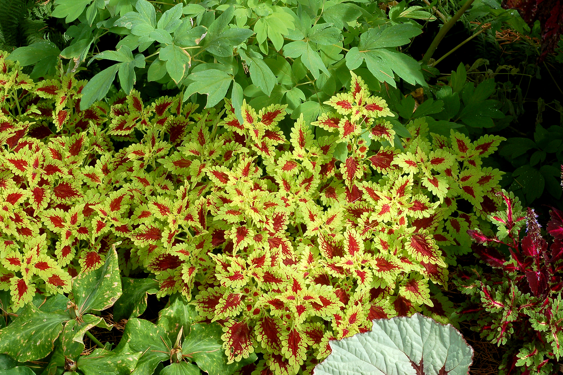 Vivid lime-gold leaves are bordered by a cherry red center which changes to burgundy-red as the foliage ages. Prominent red veins reach out to the leaf edges. Foliage is mid-sized and dense; fills a container very quickly.