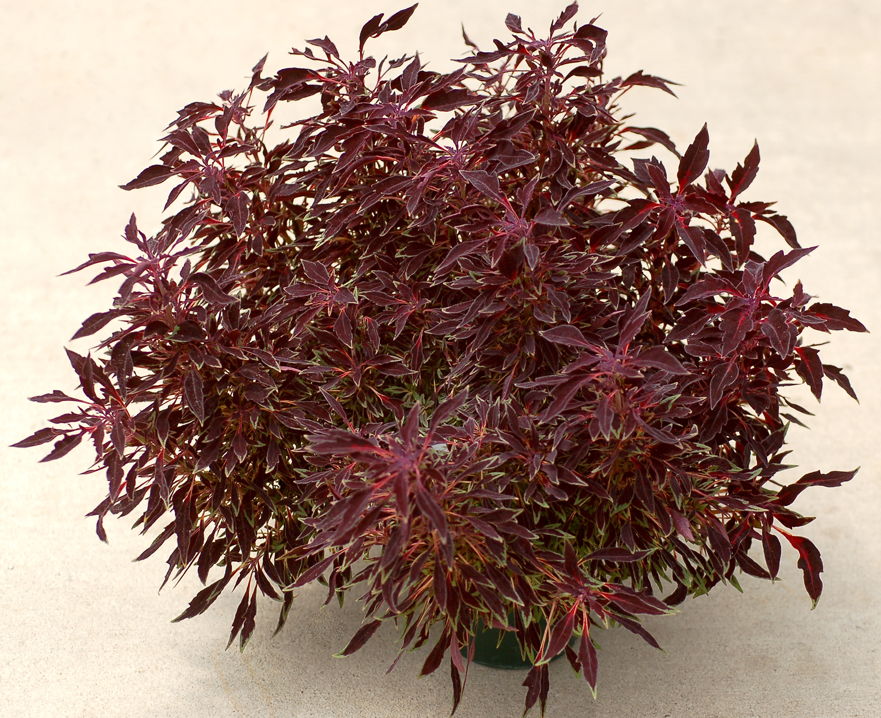 Grows beautifully in a container or as a summer annual mini-shrub. Its dramatically decorated leaves of deep burgundy splashed with red and contrasting lime-green tips are quite showy. Vigorous branching from the base makes this plant perfect for containers and hanging baskets. An easy one to grow.