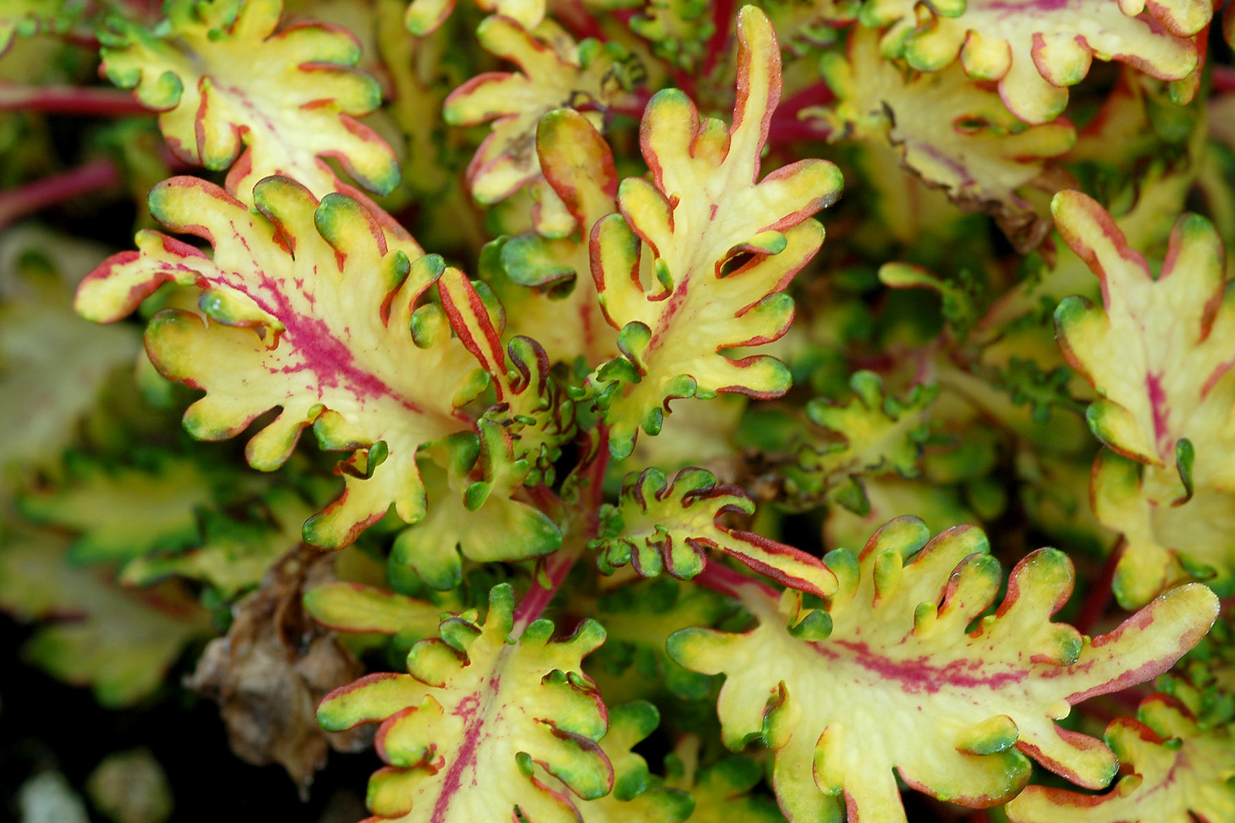 | How Different? | Lobed leaves with lemon yellow, magenta and lime green foliage, Finely cut, lemon yellow foliage lined with red - plus a central red stripe. |