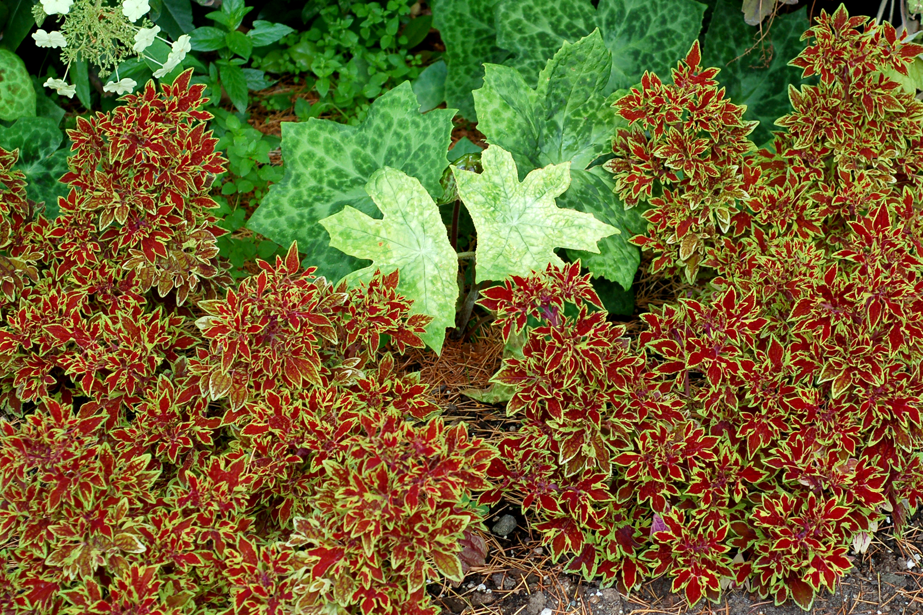 'Cuckoo' has the most uniquely lobed foliage; nearly palmate with a few extra fingers here and there. Each crazy leaf has an deep red base and a brilliant gold-lime border. Its natural form is a full, eye-pleasing mound, without a single pinch or drop of PGR. Baskets, bowls, beds – it's all the same if you're 'Cuckoo'.