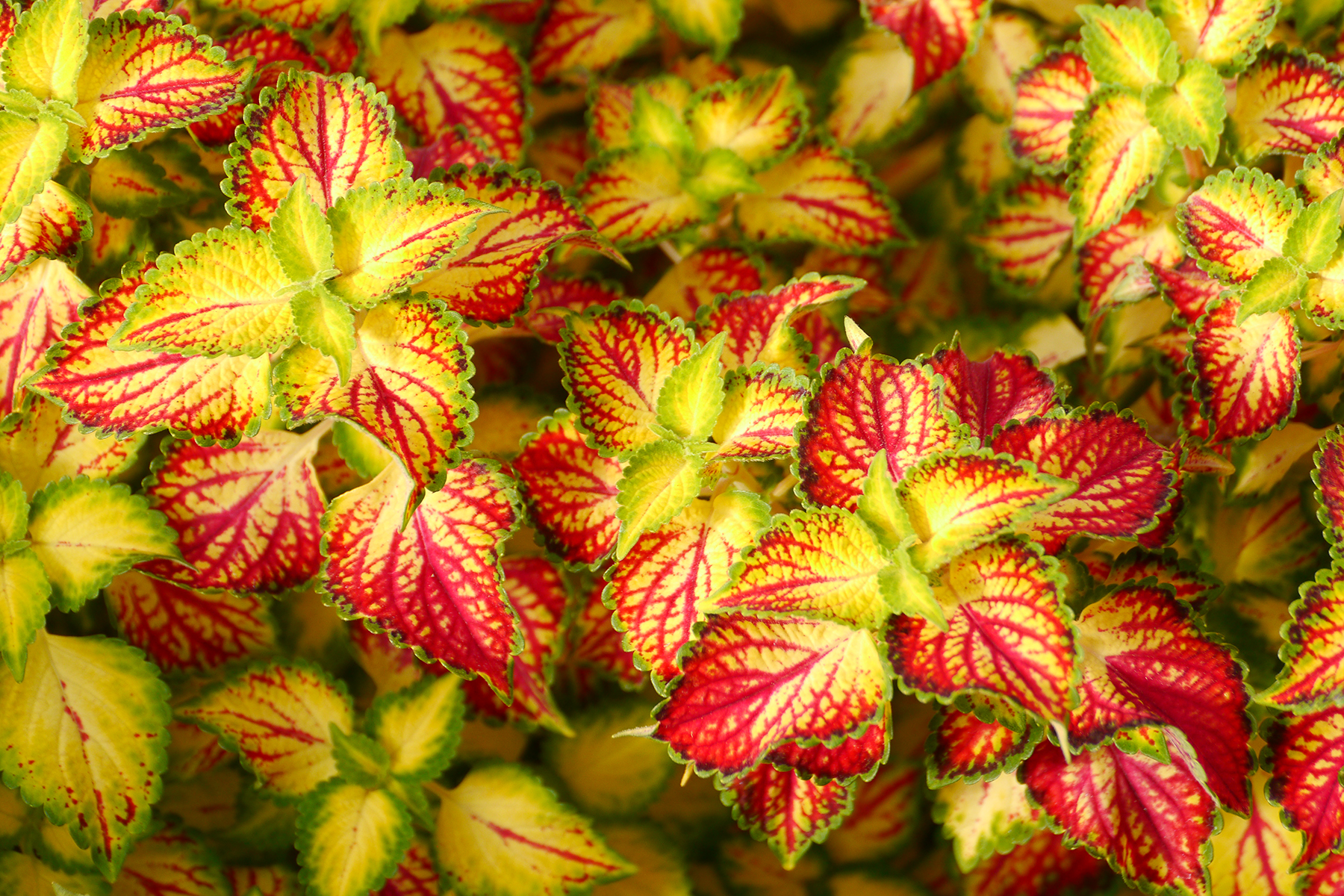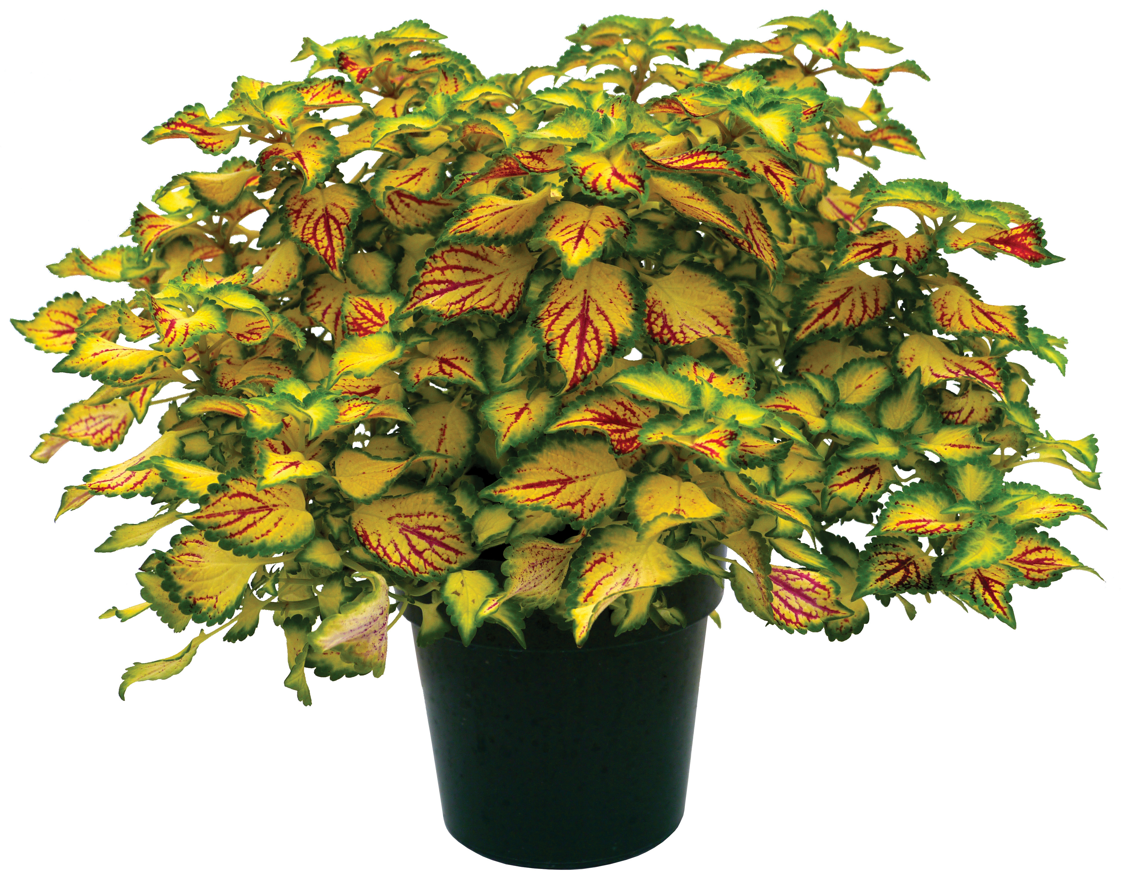 What could be better than an easy to grow Coleus that is equally at home in a bed or a hanging basket? With a strong, canary-yellow background, shocking red veins and a ruffled emerald edge, it's hard to keep your eyes off. Naturally neat and compact, very shy flowering with short violet blue flowers late in the season.