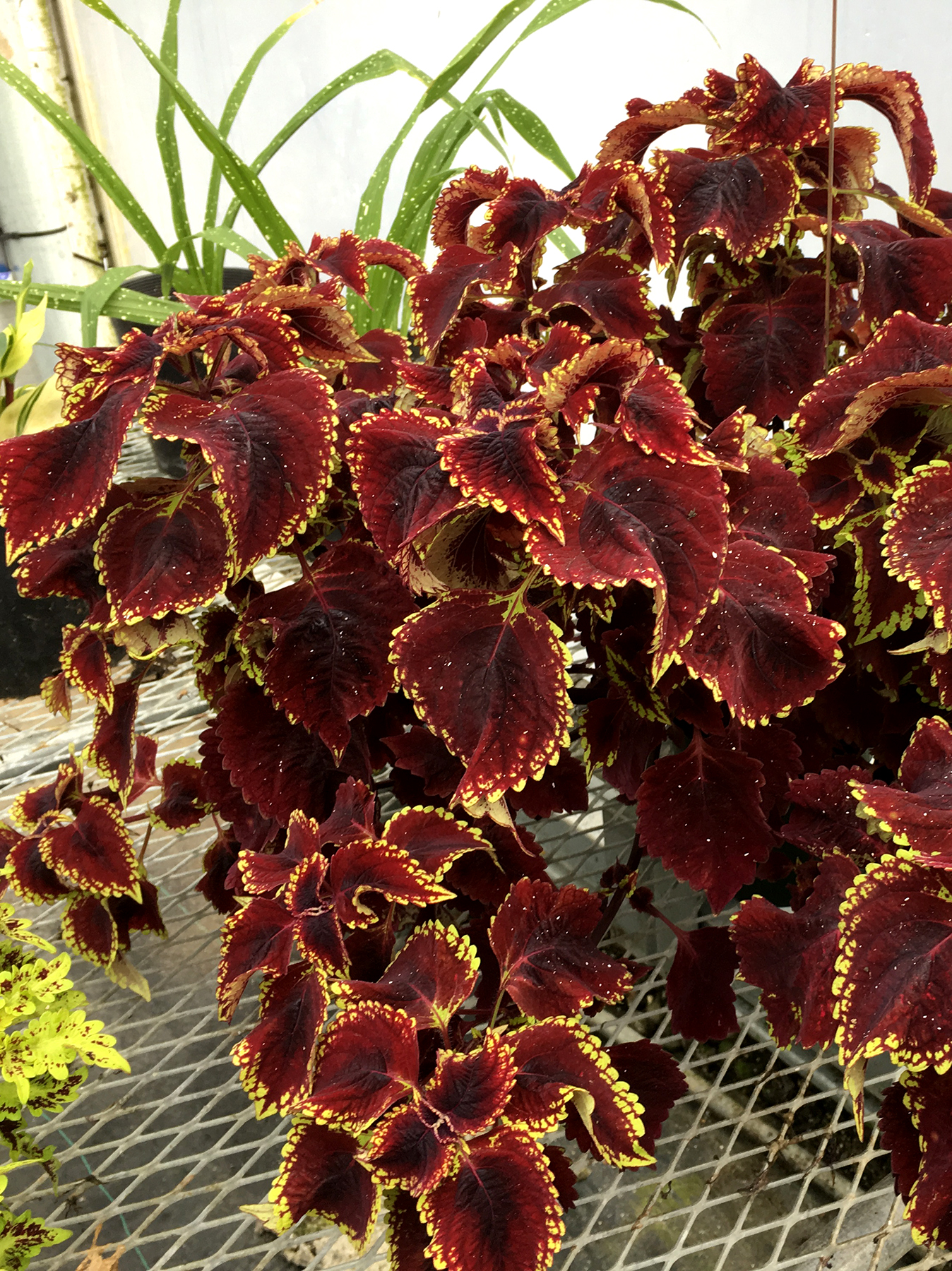 Performs beautifully as a large hanging basket or as a summer annual shrub. Its dramatically colored leaves of deep burgundy to red with a contrasting lime green edge are very showy and the additional twist on the end of each leaf adds a wonderful texture. Easy to grow.