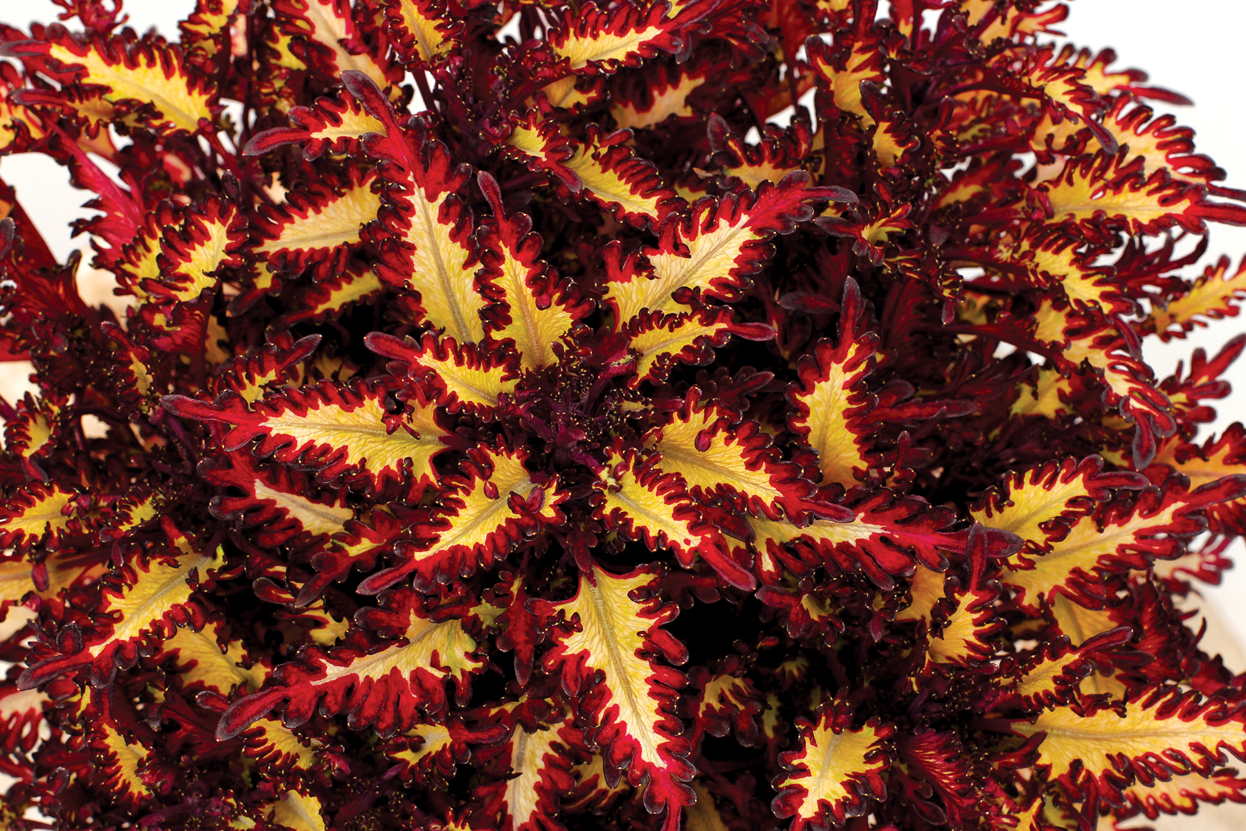 Coleus TERRA NOVA® 'Macaw' has a compact, tight habit and leaves that are maroon and lobed with cream centers. Makes a cute, small container plant. Self-branching.