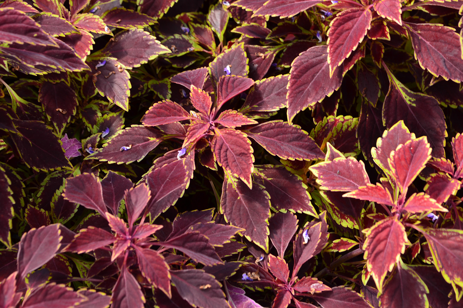 Coleus TERRA NOVA® 'Maharaja' is a vigorous spreader. It has leaves of a deep red burgundy with a slight gold edge. It is a multipurpose plant that is great for hanging baskets, groundcovers and large mixed containers. Self-branching.