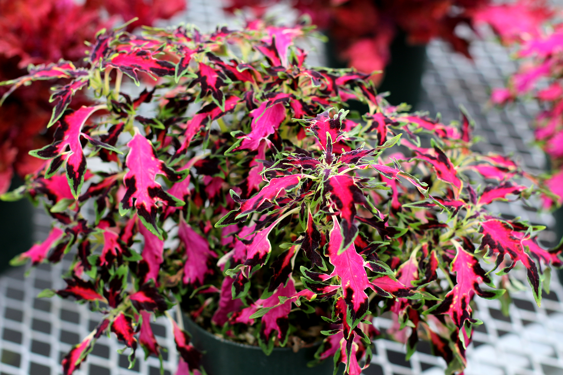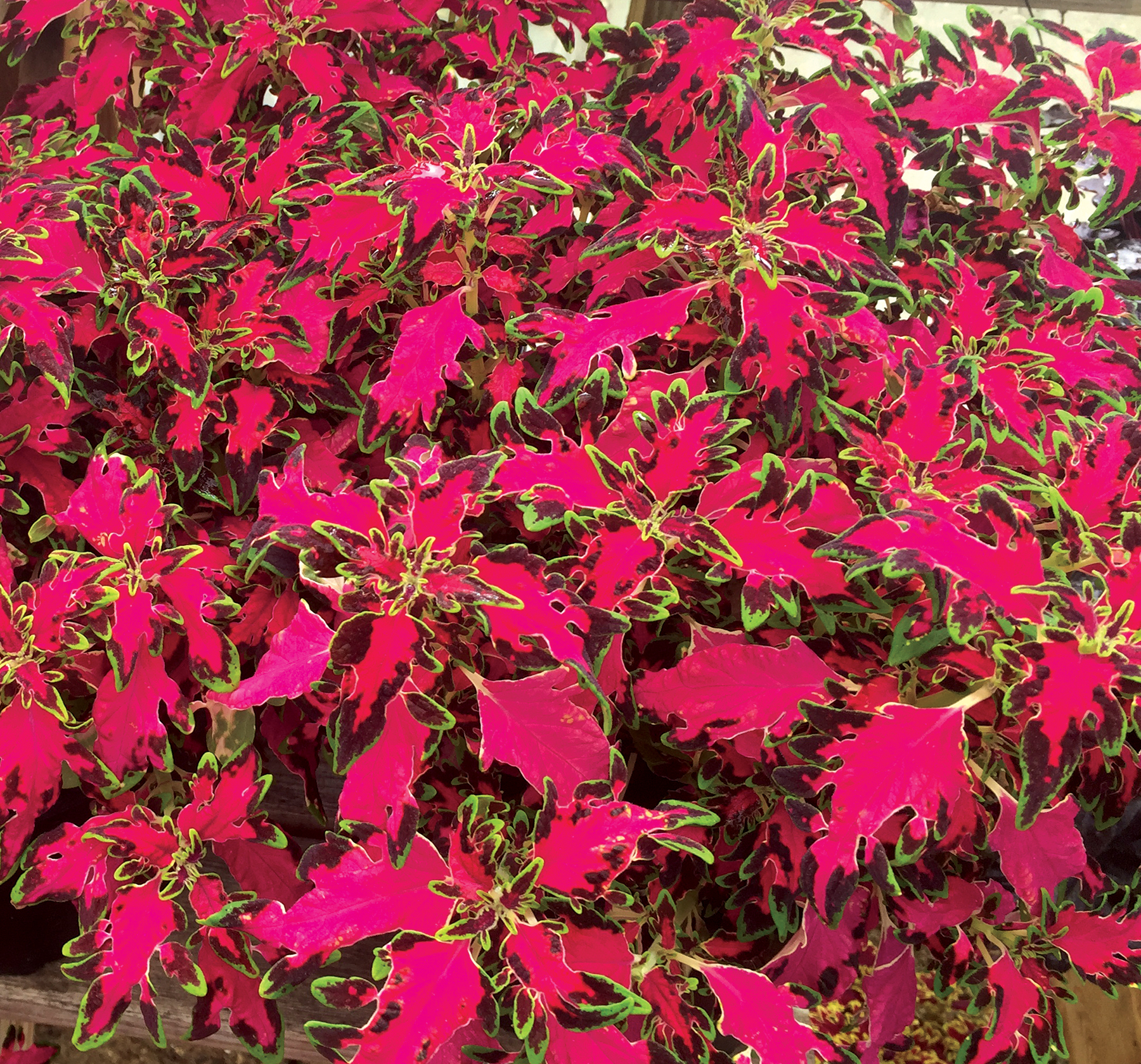 TERRA NOVA® 'Pink Poodle' is a self branching Coleus with a low, dense habit. It has hot pink leaves that are edged in green and black. Very showy. Use in containers, hanging baskets, or borders, and masses in the summer garden.