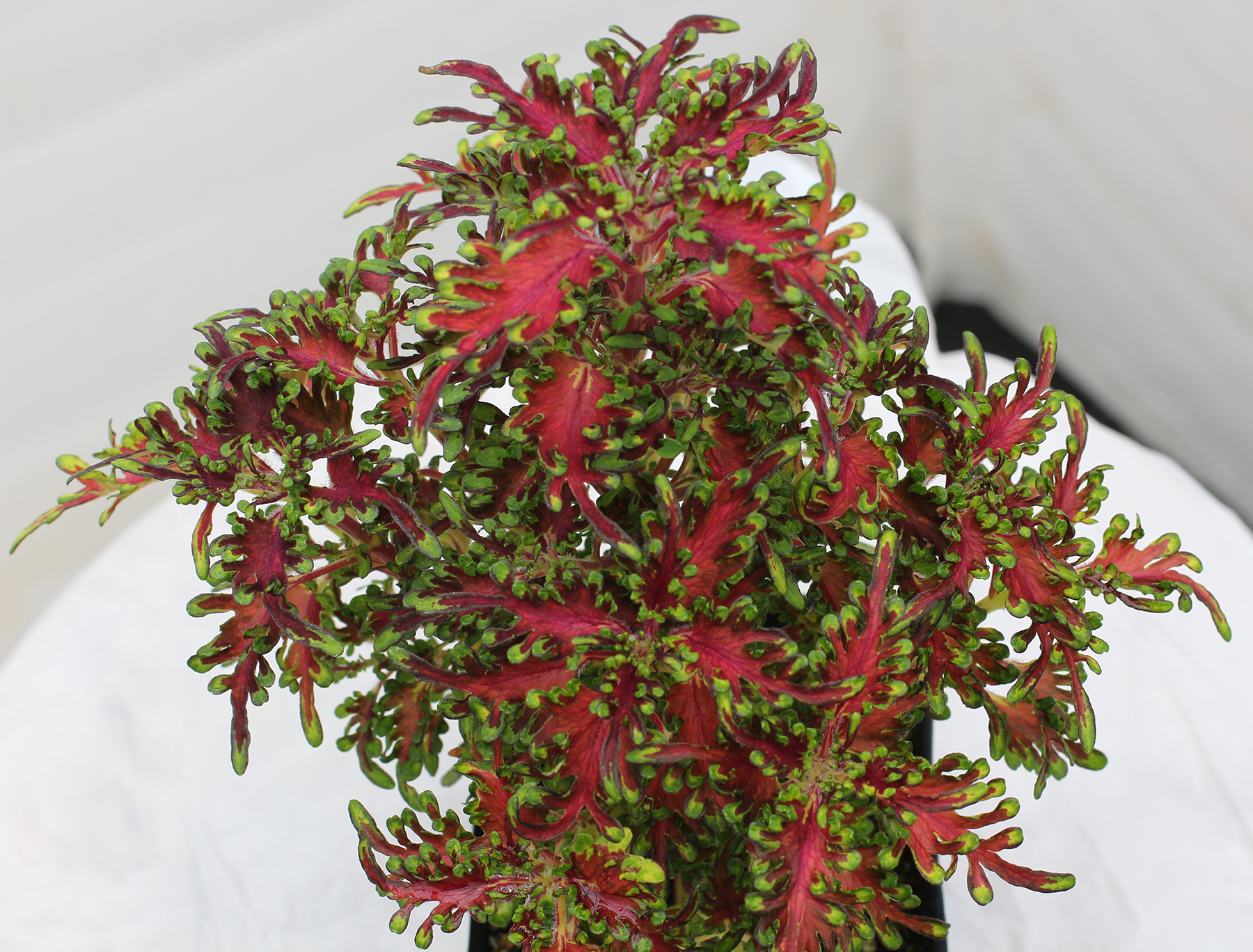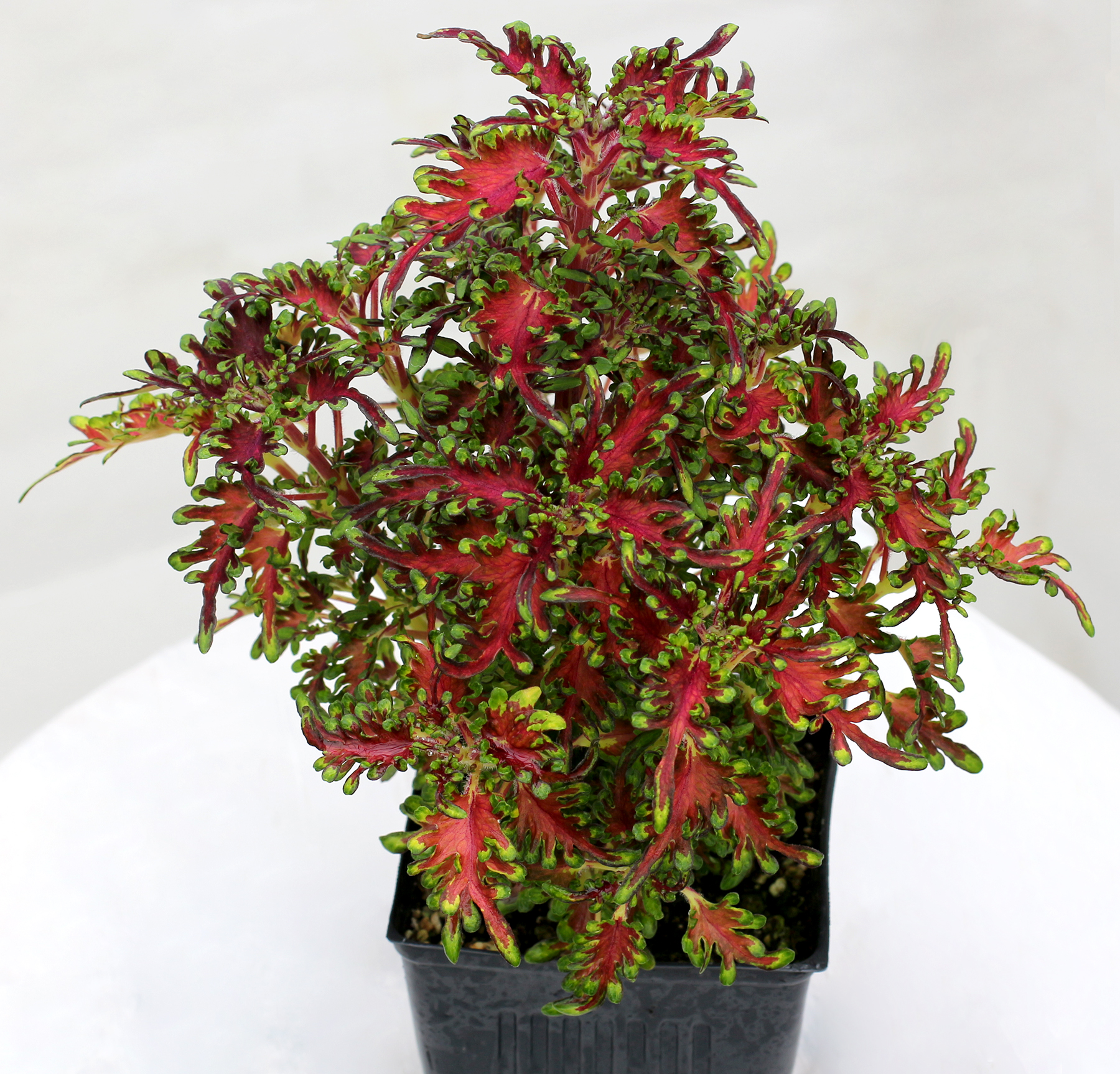 Coleus TERRA NOVA® ‘Scarlet Ibis’ has a small habit with small, narrow, fingered leaves that are red, edged green to gold. This adorable plant forms an upright, tight habit. No pinch, do NOT use PGRs. Use in small containers, small mixed plantings, or as a summer border.