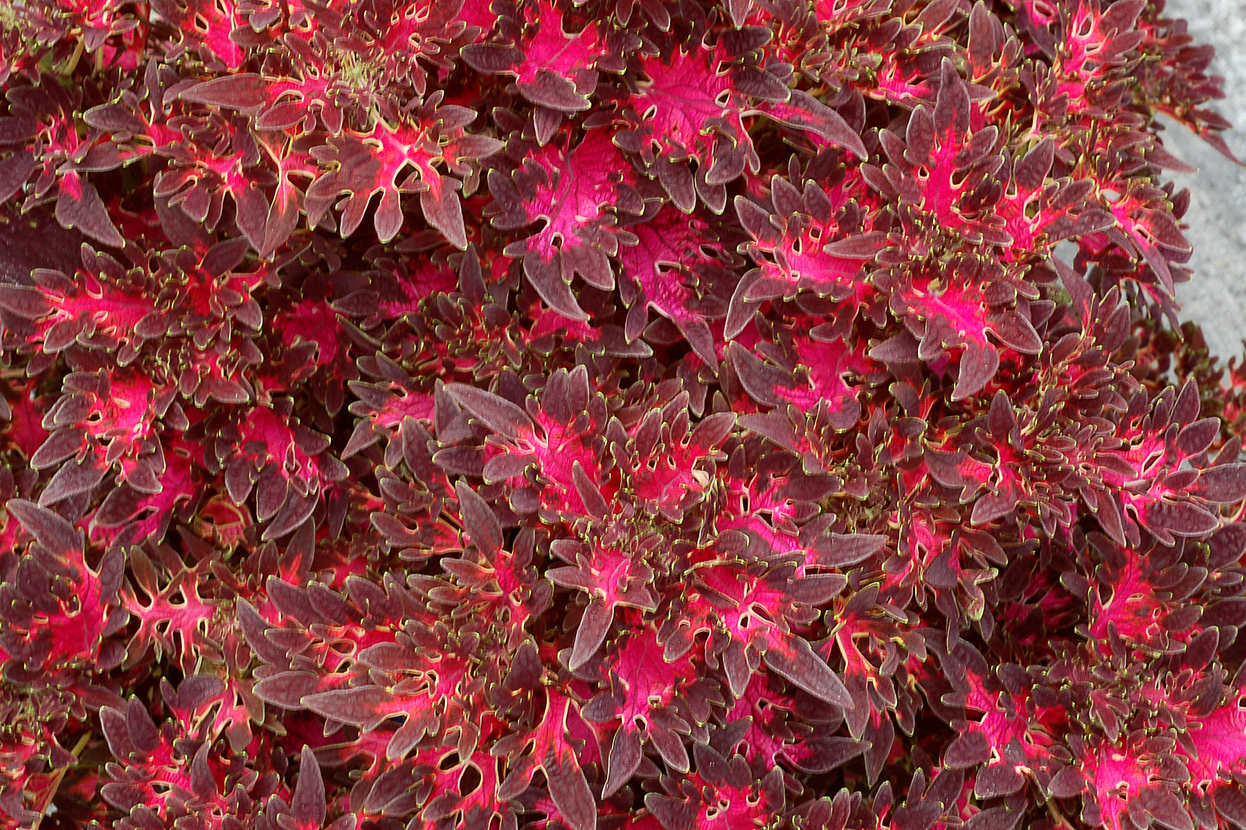 This low spreader has dark leaves with hot pink centers. It has a short mounding habit with bushy, dense foliage with dramatically cut leaves.