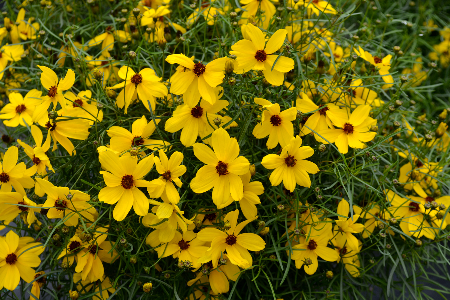Amazingly bright, sunny gold flowers cover this plant in masses and waves of continuous color. Clean, deep green foliage is the perfect foil for the flowers… when the foliage is visible. Blessed with a perfect habit, this extra hardy garden marvel is very much at home in a container or a long lived garden feature. Coreopsis verticillata breeding makes this mildew resistant selection ultra-hardy.