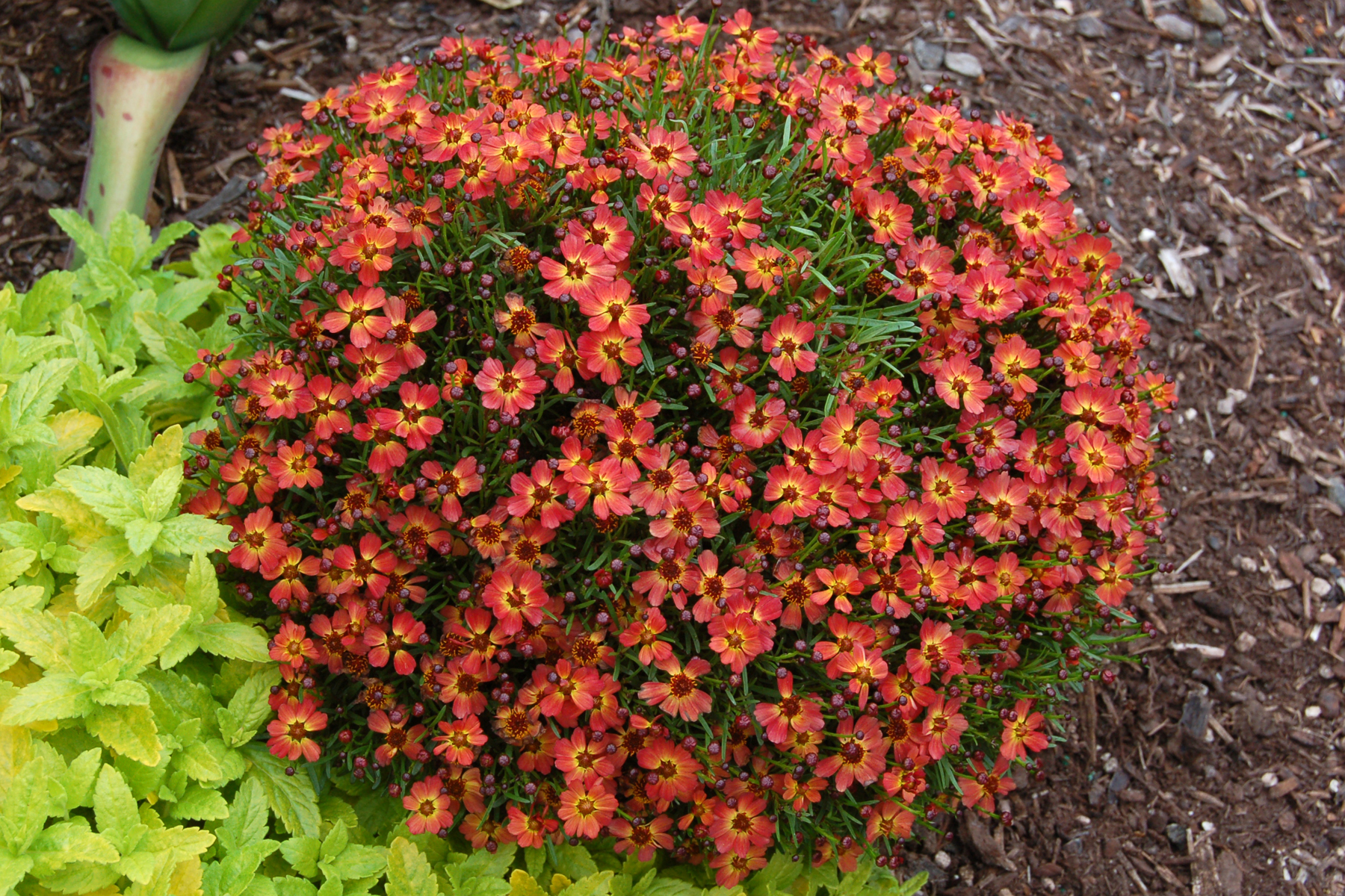 Our most compact mounding Coreopsis is a flower machine! Numerous, small copper colored daisy-like flowers emerge freely over a low pincushion. Blooms continuously all summer. A great one for summer pots!
