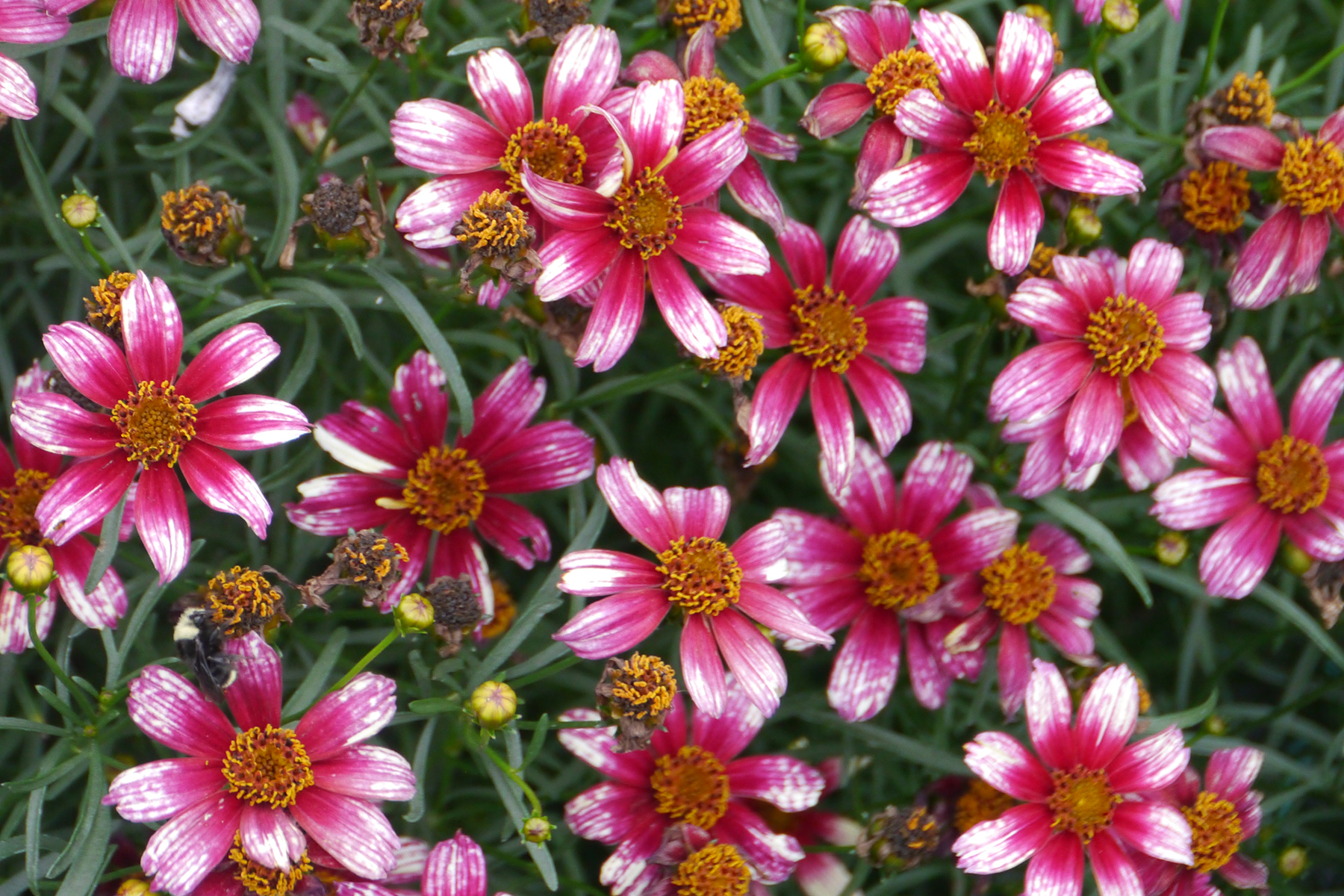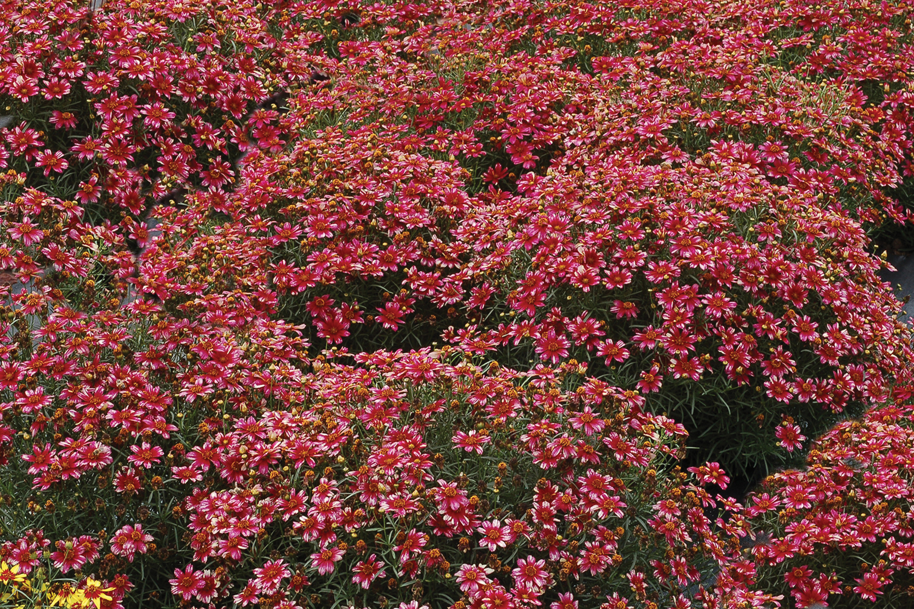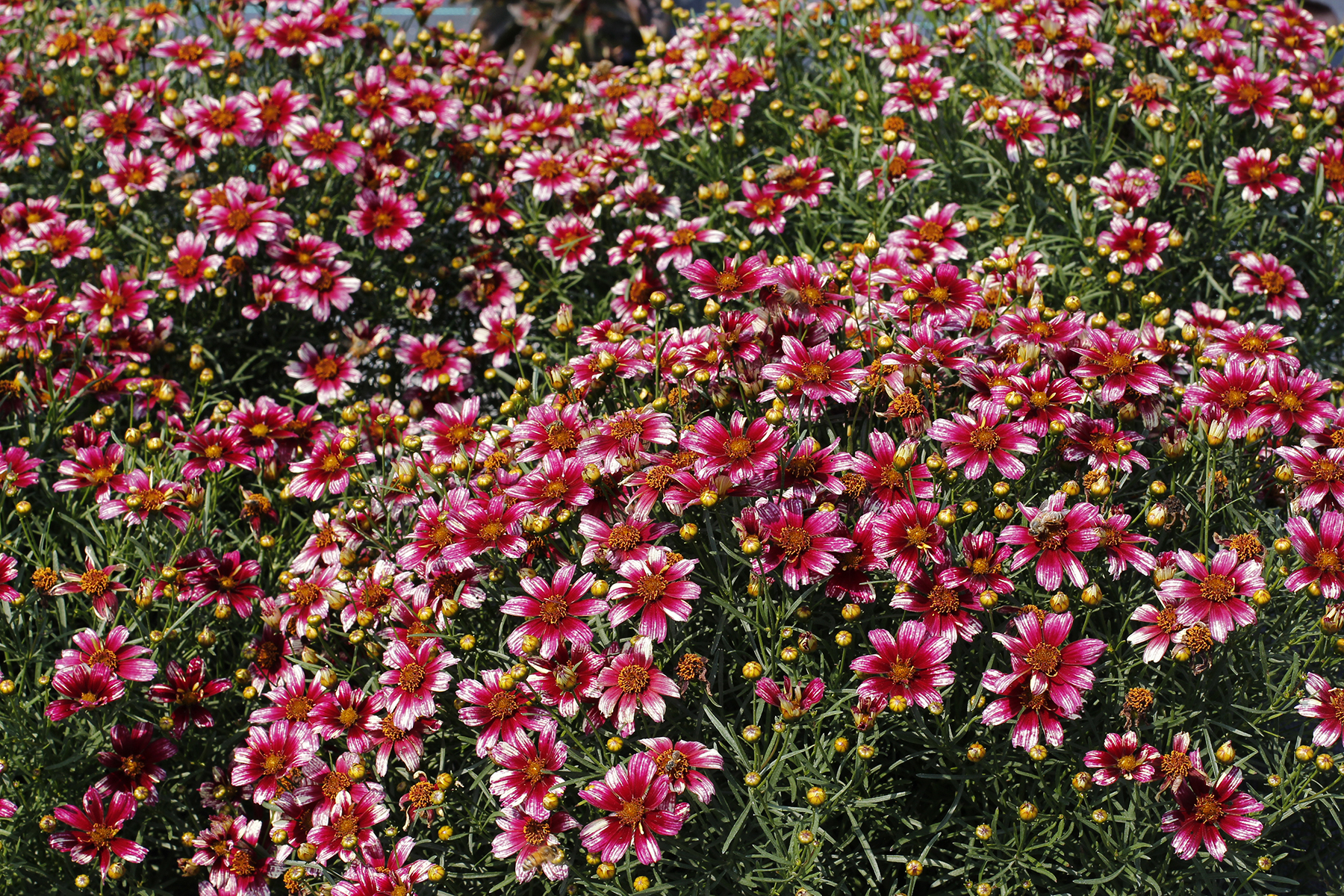 This newest introduction to the MAJARAJA™ series of C. verticillata type Coreopsis has flowers that are two-toned burgundy with light pink tips. The advantages are the hardiness, the clean, manicured habit, the extremely long bloom time, and the feathery, mildew resistant foliage.