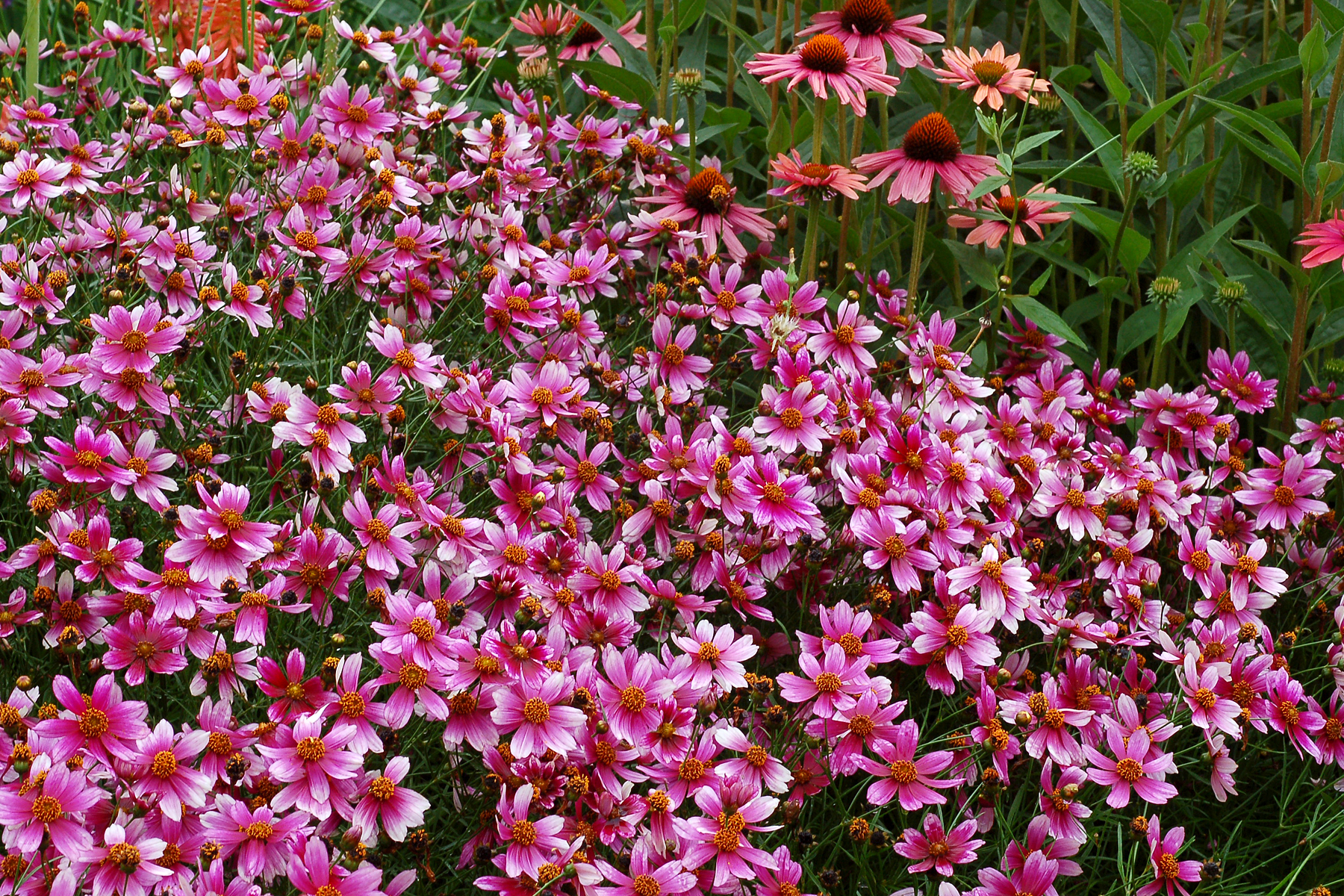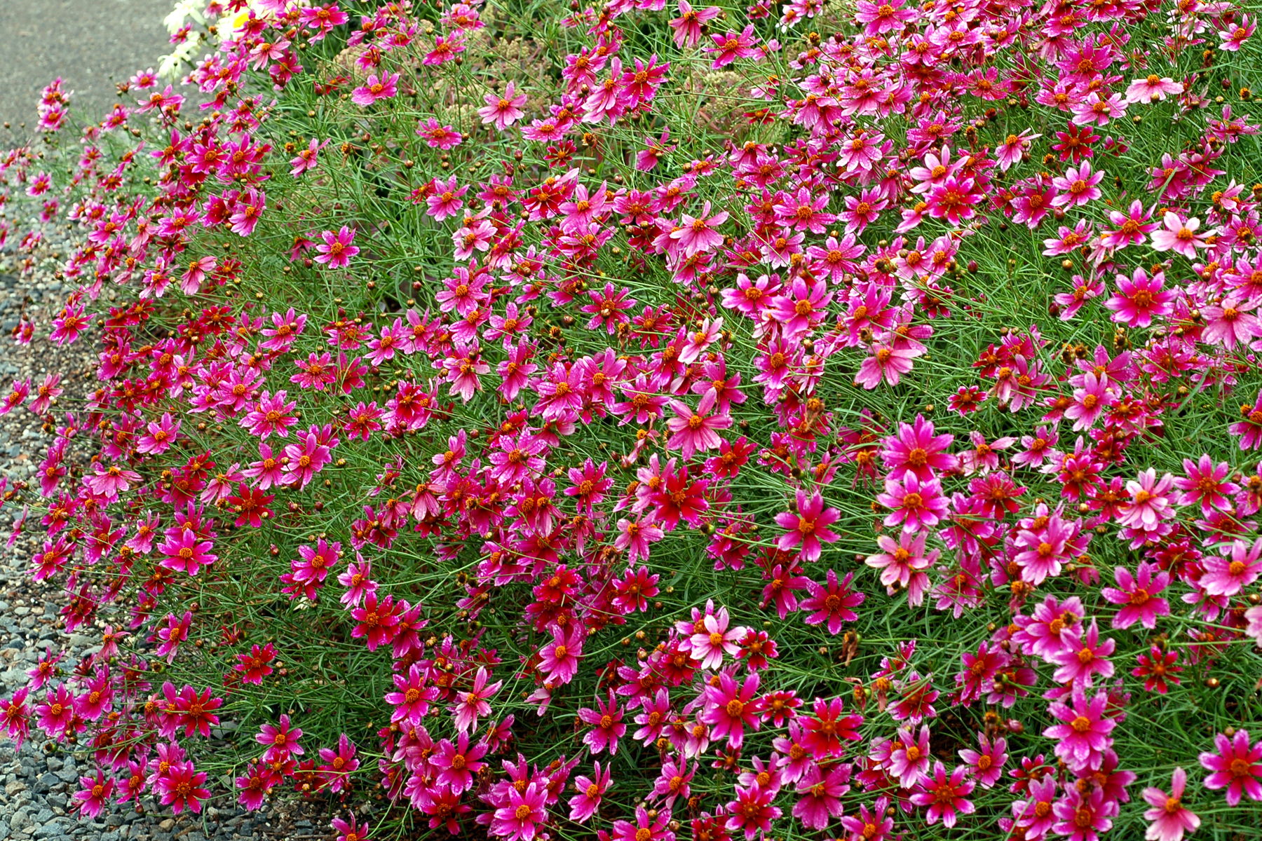 Covered in bright rose-pink flowers from late spring until frost, Coreopsis 'Show Stopper' makes an impressive mound in the garden. This hardy Coreopsis blooms and blooms all summer long. No deadheading is needed. Good drainage is necessary. A visitor favorite at the Mt. Cuba, Delaware, Coreopsis trials in 2012. C. verticillata breeding makes this selection ultra-hardy.