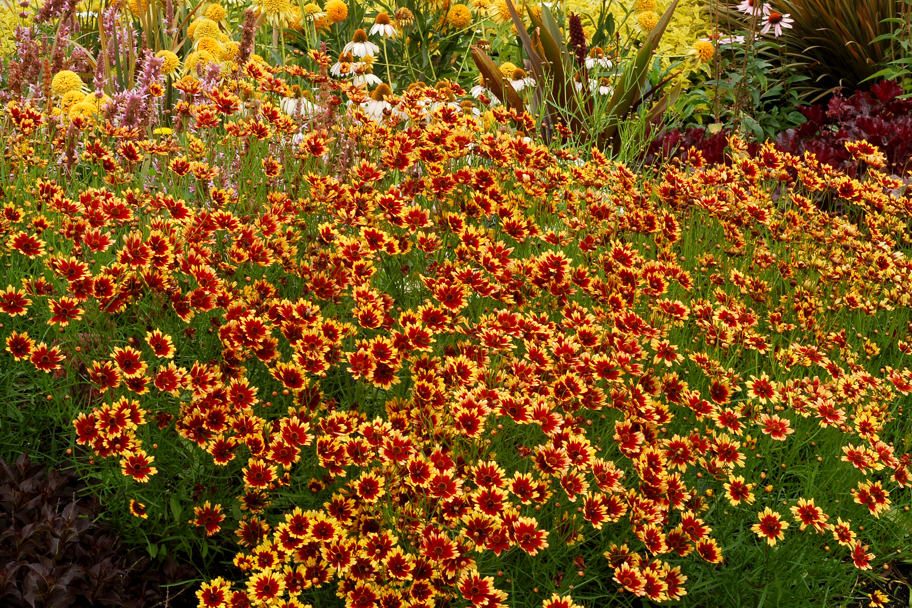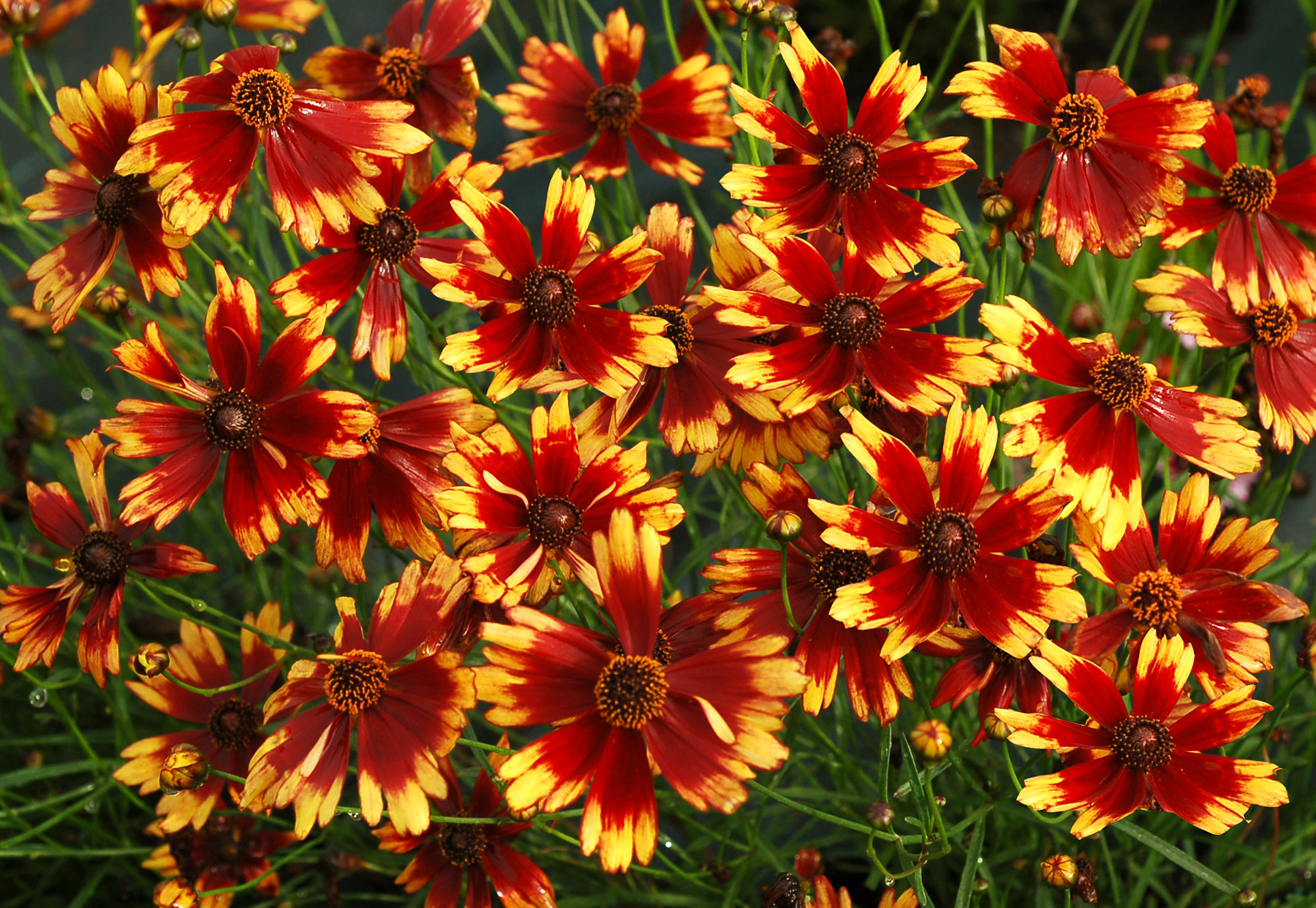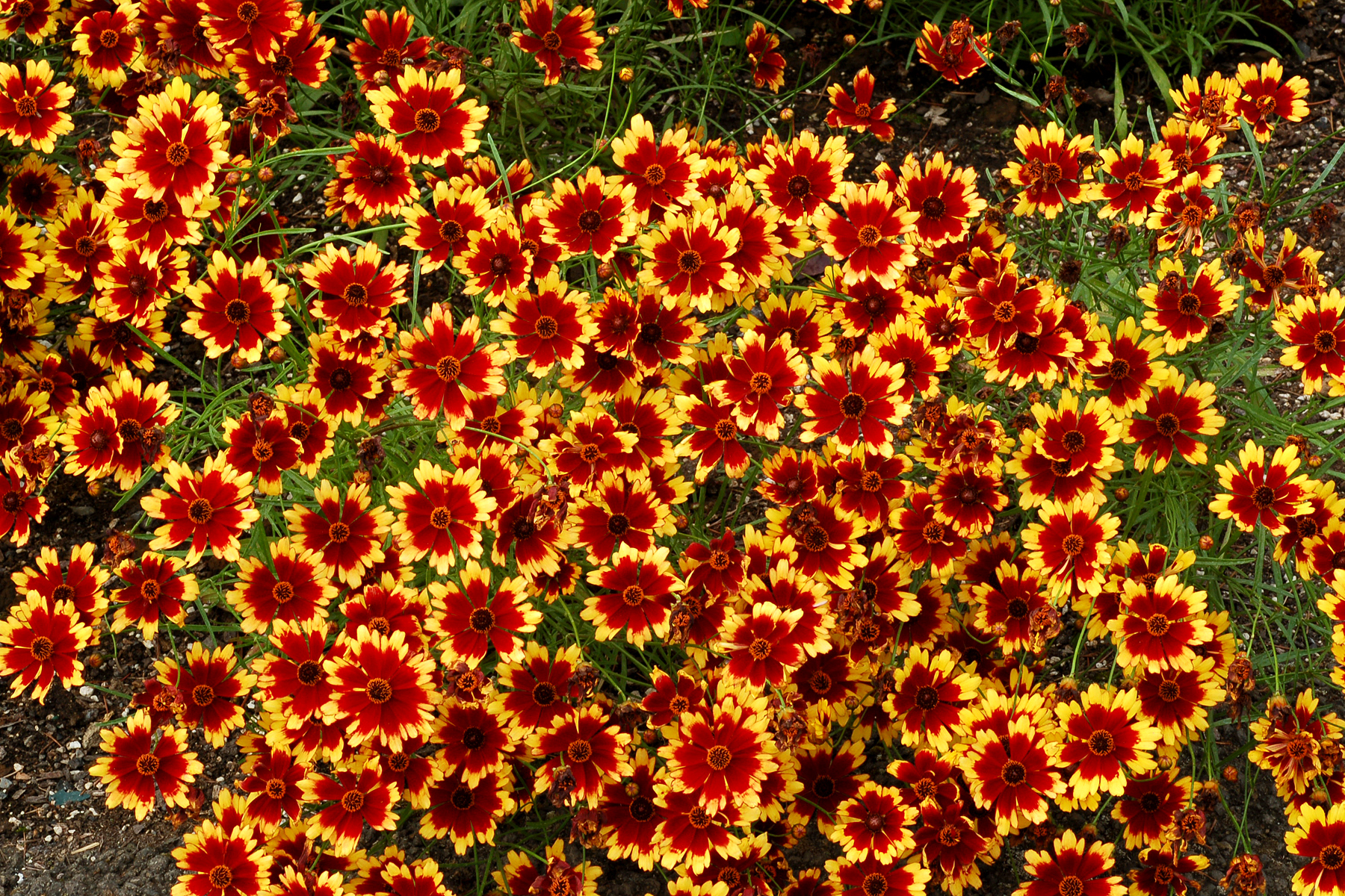 Large bi-colored flowers of deep crimson and lemon-gold blanket this Coreopsis from the very start of summer, and then change as they age to deep ox-blood and burnished bronze before the petal drop cleanly away. A very handsome and dramatic annual; low spreading habit, tons of flowers and long easy care life.