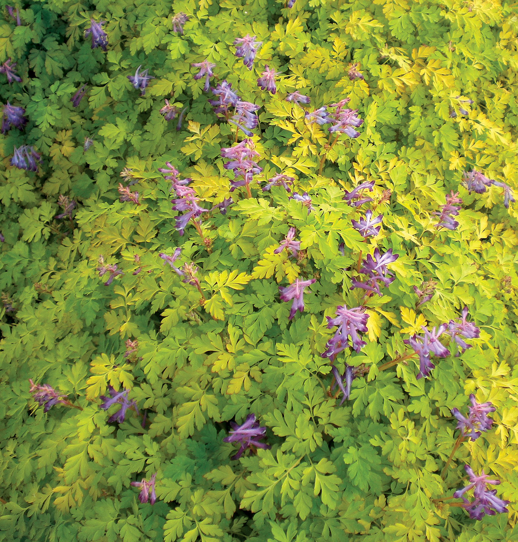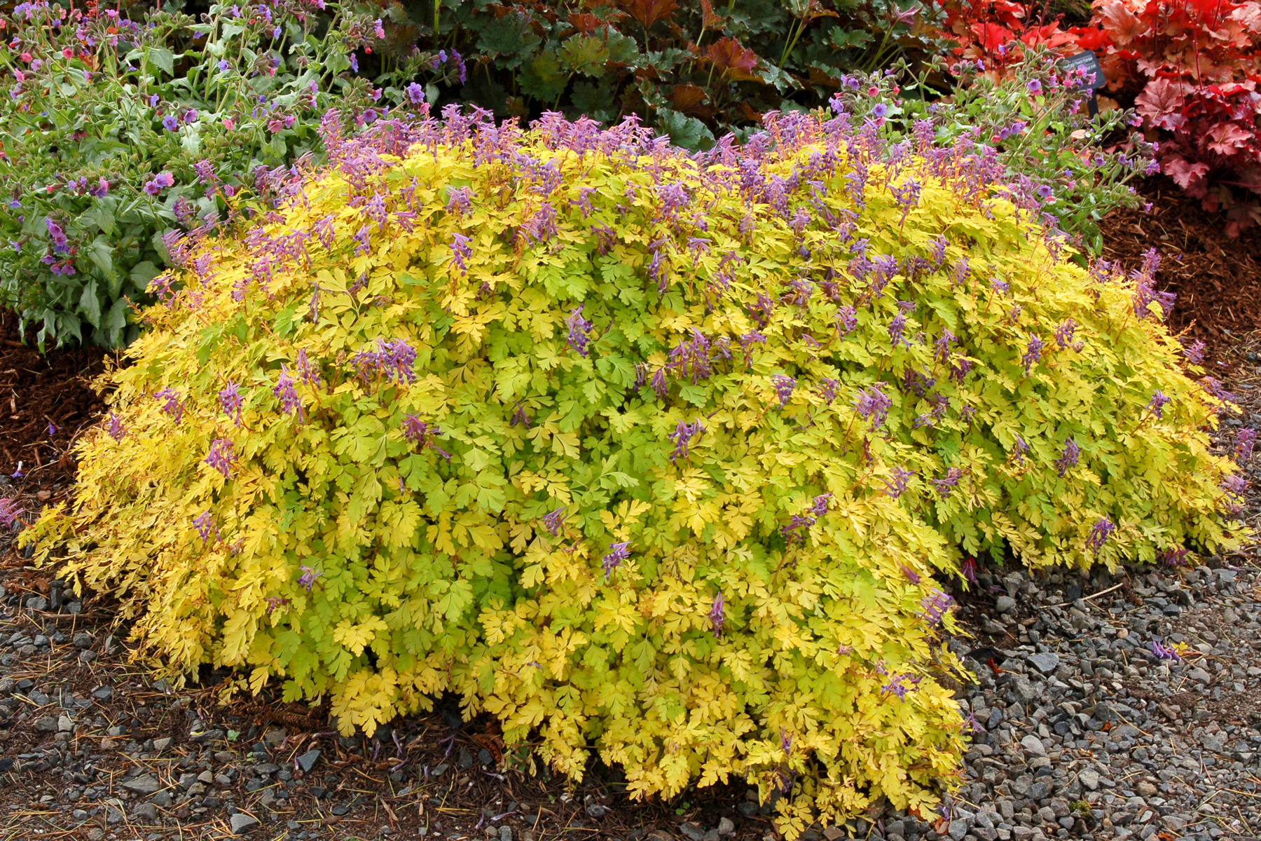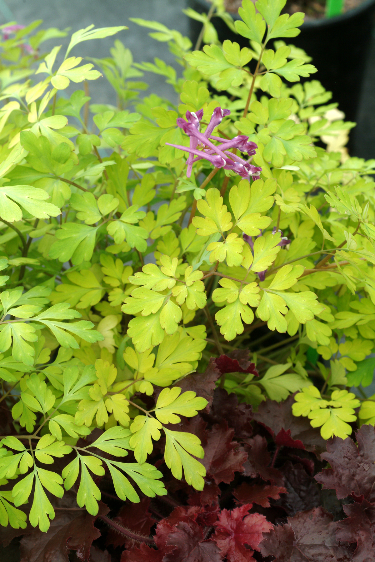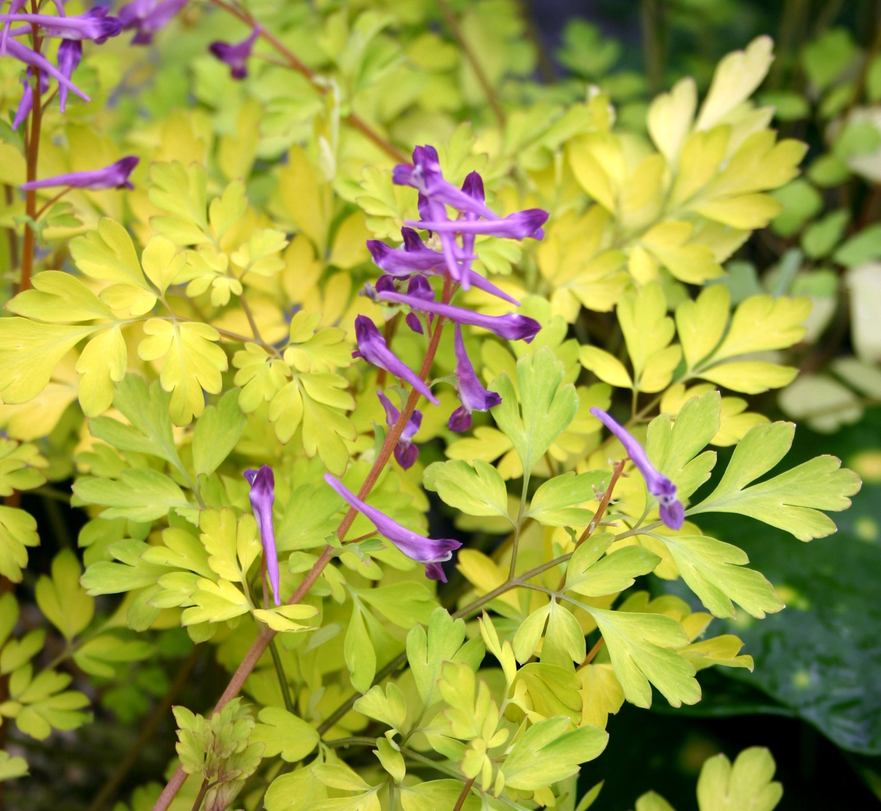 Brilliant yellow, fern-like leaves are streaked green and erupt in fragrant purple flowers. This wonderful mutation of C. 'Blackberry Wine' is one of the few Corydalis that does not go summer dormant. Its vigorous cascading habit makes it an excellent groundcover and looks great spilling out of baskets and over banks. We've seen it used as a different component plant and it’s always a stunner in the spring garden! Takes heat and humidity!
