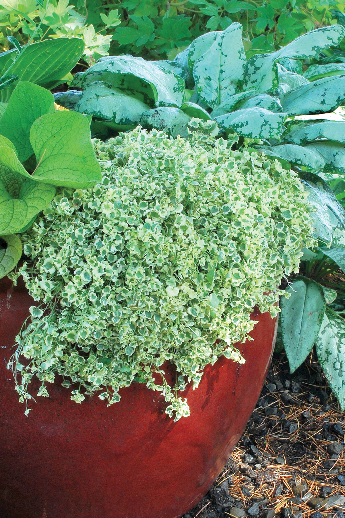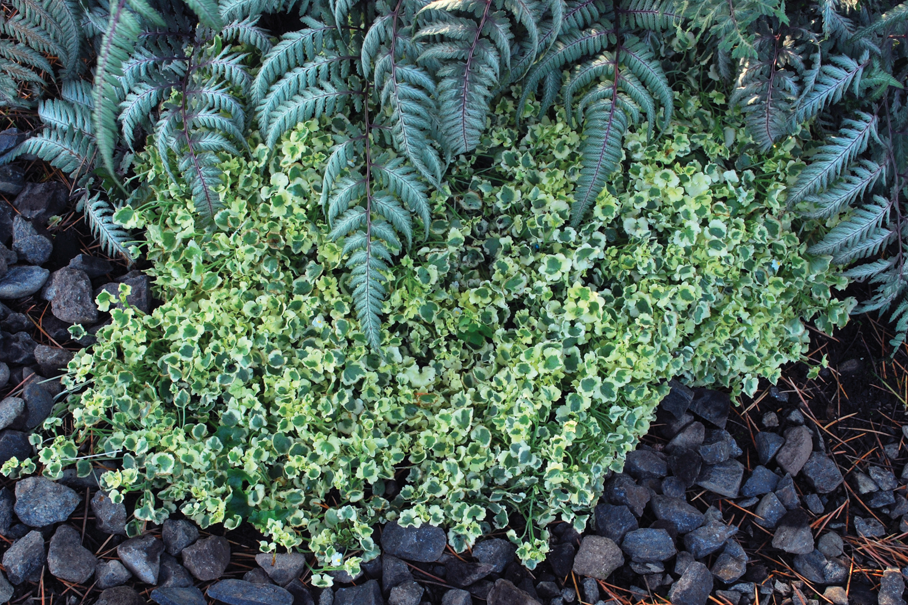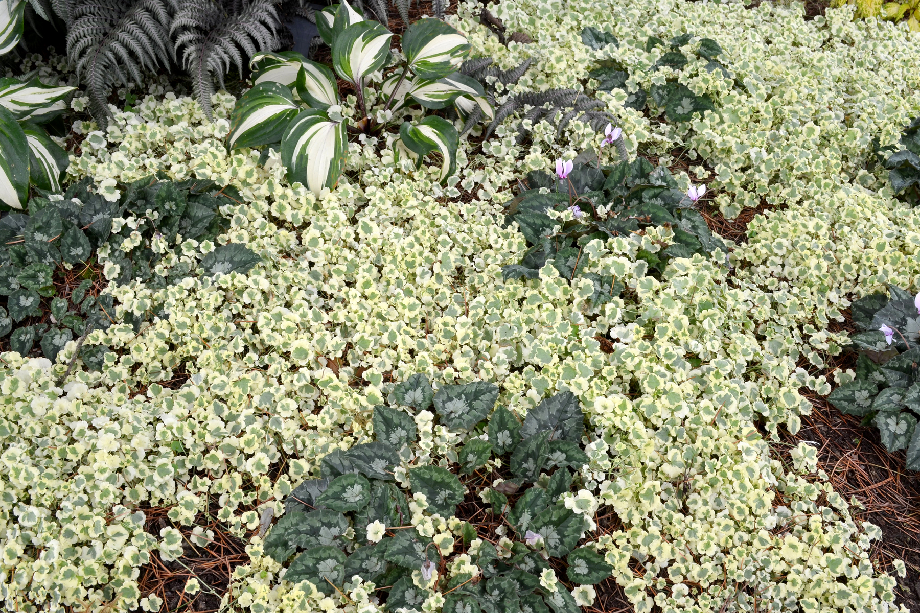 The first variegated Kenilworth Ivy! 'Snow Wave' has leaves with a broad creamy white margin. Its small white flowers complement the margins. This charmer was found by Mr. Nagamori in Japan. Use as a groundcover between flagstones, in a hanging basket or as a component in containers.