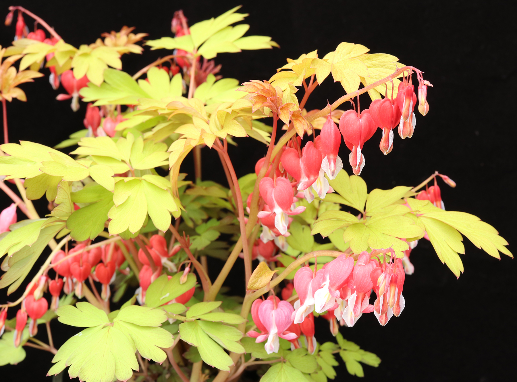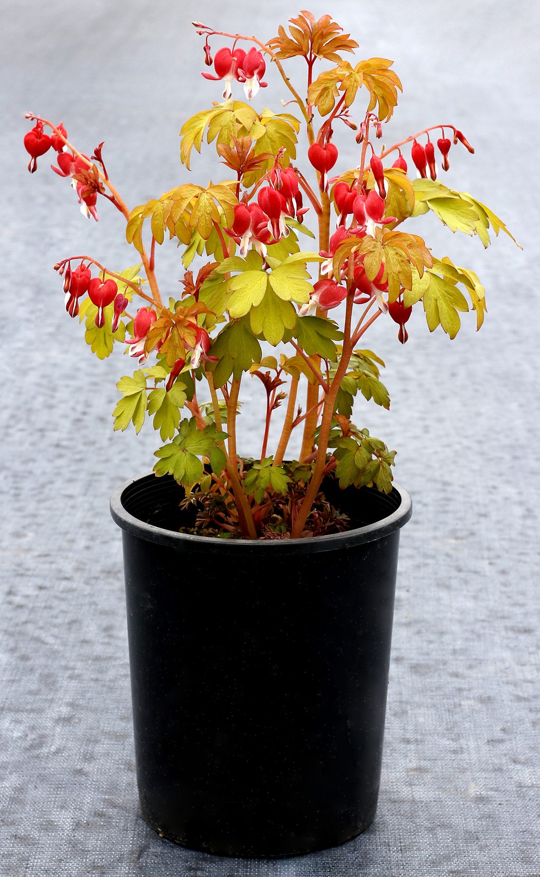 The first gold foliage Dicentra spectabilis with true red flowers. Developed from purposeful breeding, all other gold foliage varieties have been mutations. The stems are strong and upright, the flowers are large and numerous but the color… WOW, brilliant red with a touch of unusual orange! A great container habit and is long lasting in the garden; a great improvement over the still popular 'Gold Heart'. Exceptional vigor.