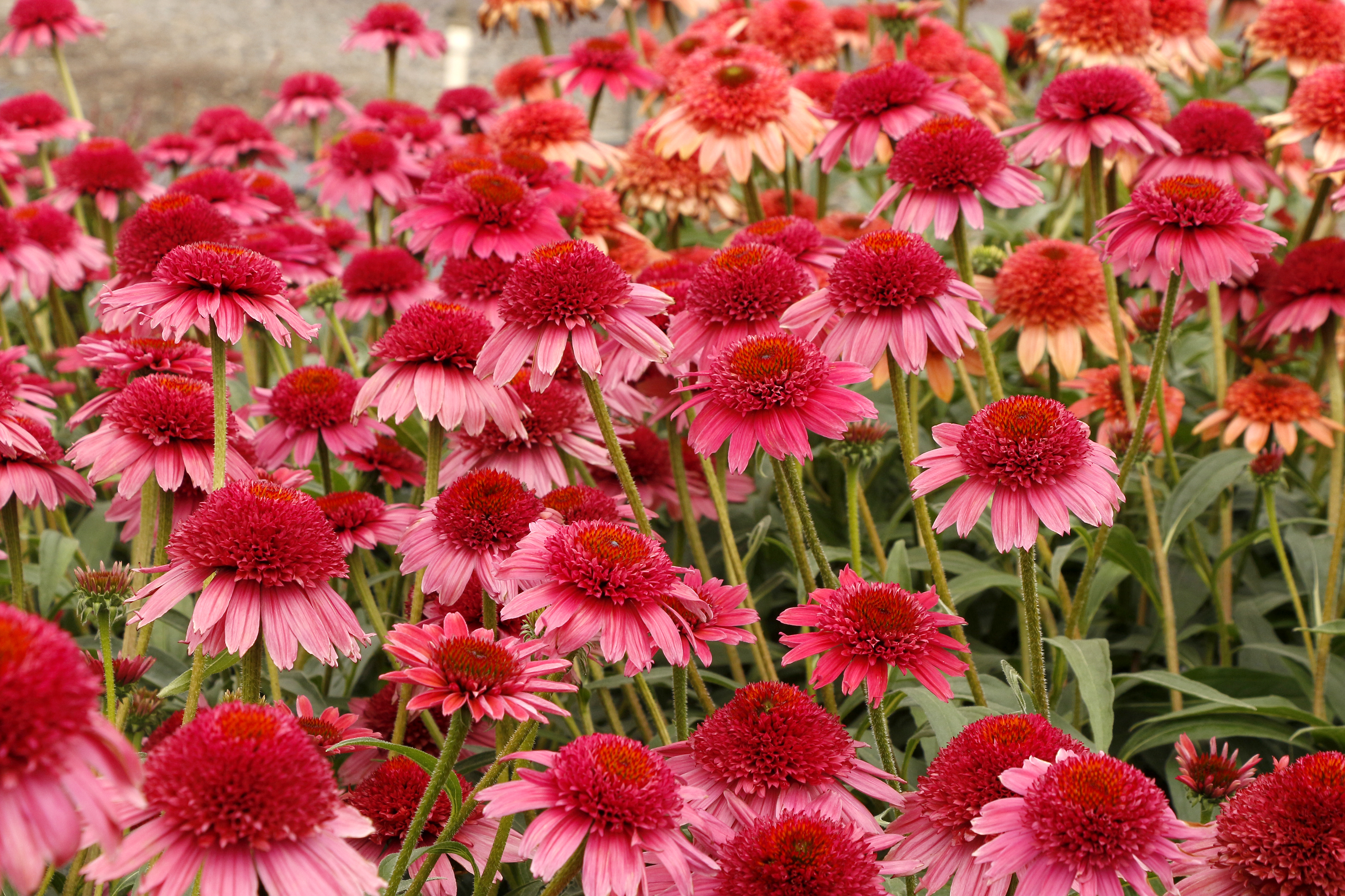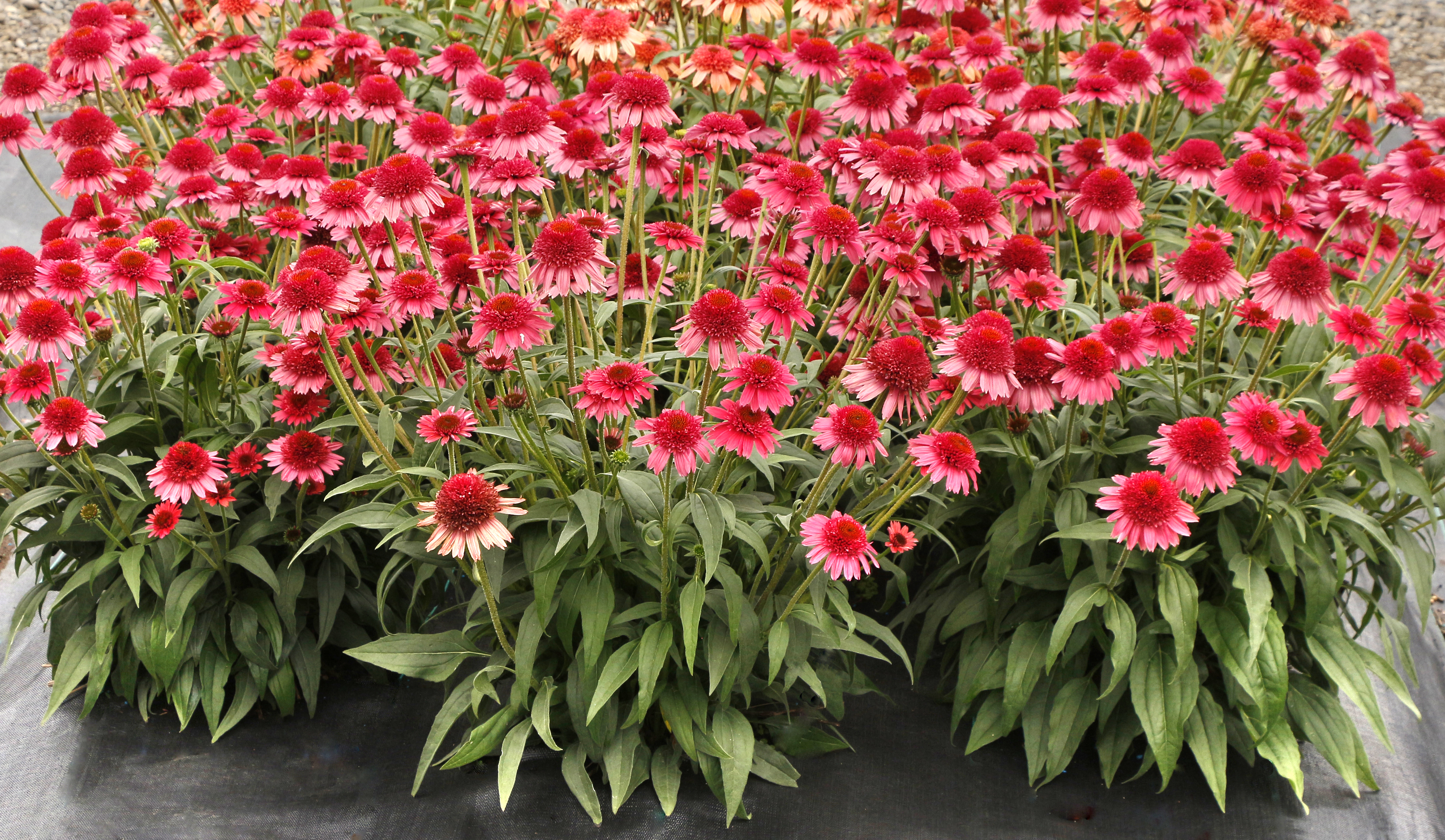 Very bright, fuchsia cherry-colored double flowers are a spectacular companion to its sister Echinacea CARA MIA™ 'Coral'. Dark eyed, anemone flowers fill out to be one of the strongest colored Echinacea's to date. Combine the flowers with the great habit and dense pine-green foliage and you've got an instant consumer favorite. Fantastic in the landscape, high crown count, and bright unique double flowers make the CARA MIA™ series a standout.