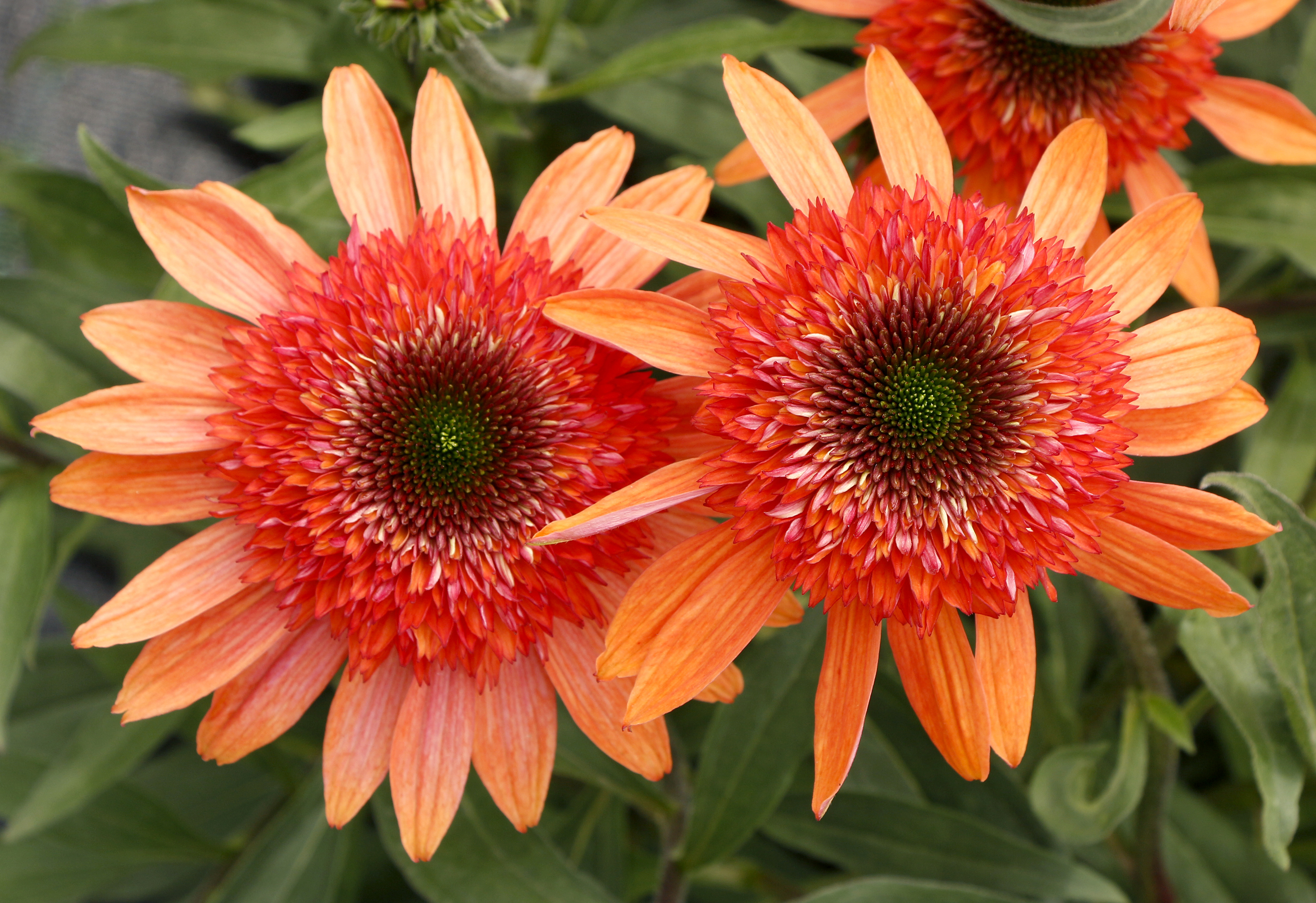 Conch shell peach and coral are blended to form the fantastic flowers on this garden worthy plant. The double flowers first start off as a green-eyed anemone type and then burst into their true double form. Upright, compact habit plant features healthy mid-green foliage, right to the ground, making this plant very versatile and a pleasure to grow. Spectacular companion to its sister Echinacea CARA MIA™ 'Carmine'. Fantastic in the landscape, high crown count, and bright unique double flowers make the CARA MIA™ series a standout.