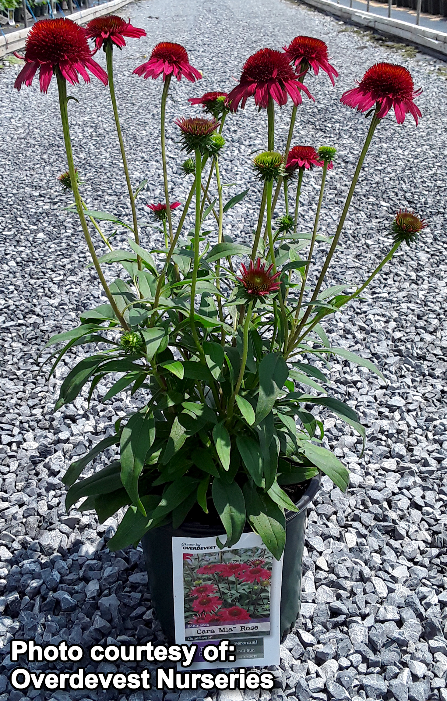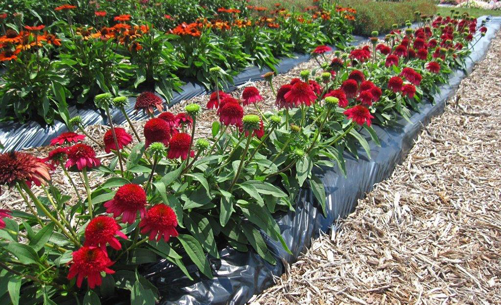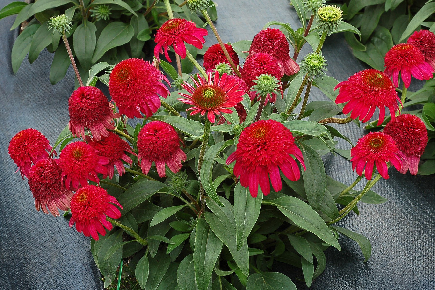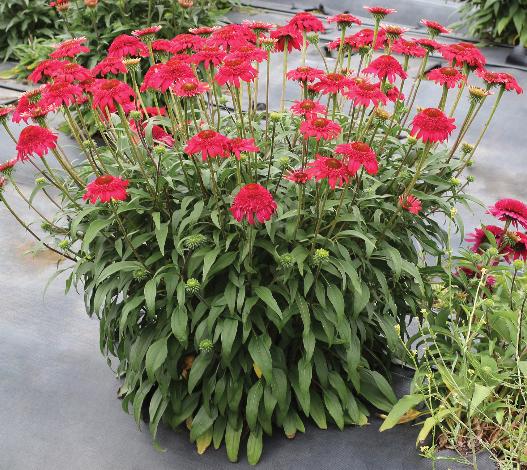 Plant one liner per 4-inch or gallon pot. Make sure not to cover the crown with soil by planting too deep; incorrect planting depth is the most common cause for losses in Echinacea. The soil levels of the pot and the liner should match up evenly. A broad-spectrum preventative fungicide after transplanting is recommended – check labels for desired rates and application intervals, and (as with any chemical) test on a small group of plants before applying to the entire crop.