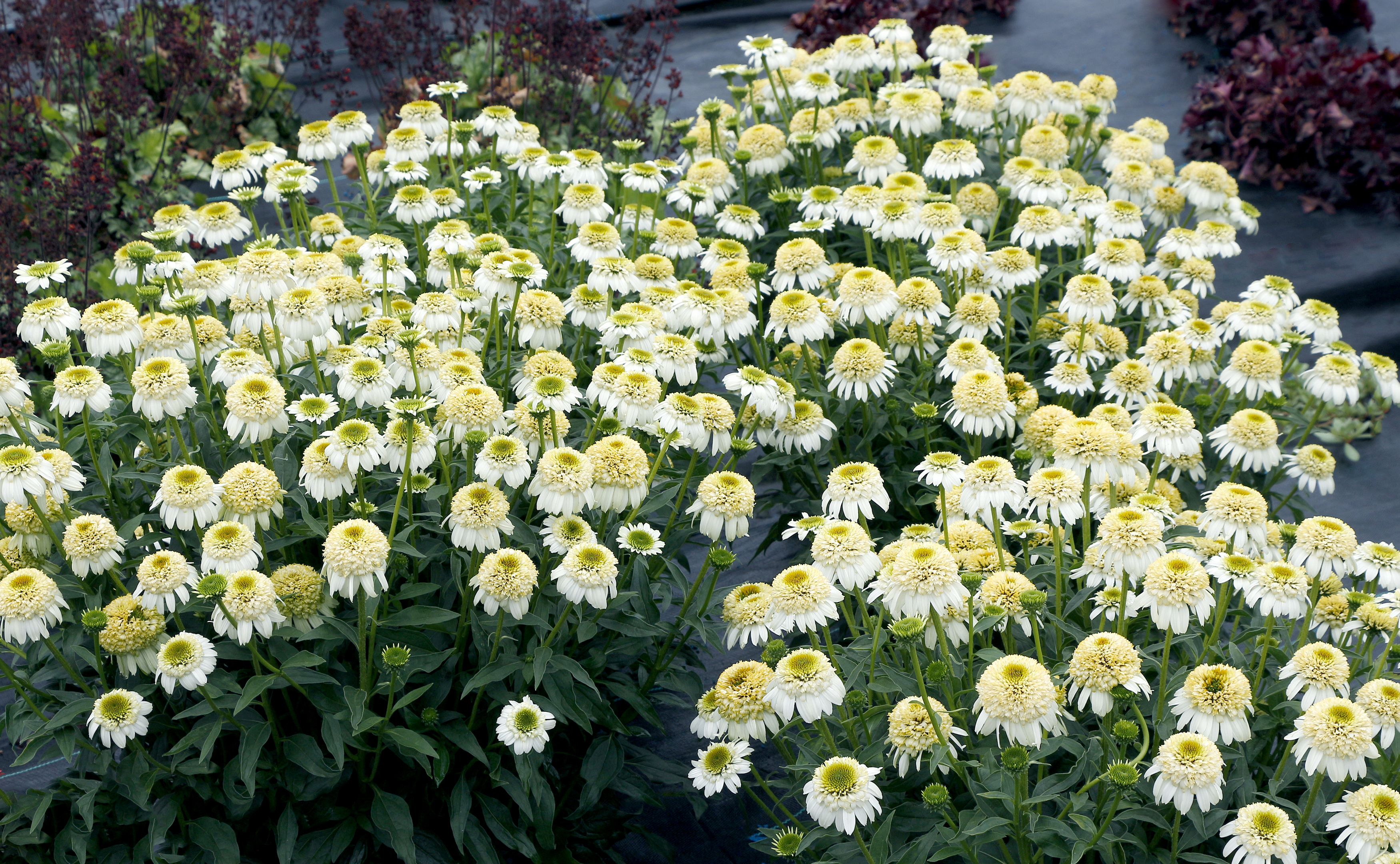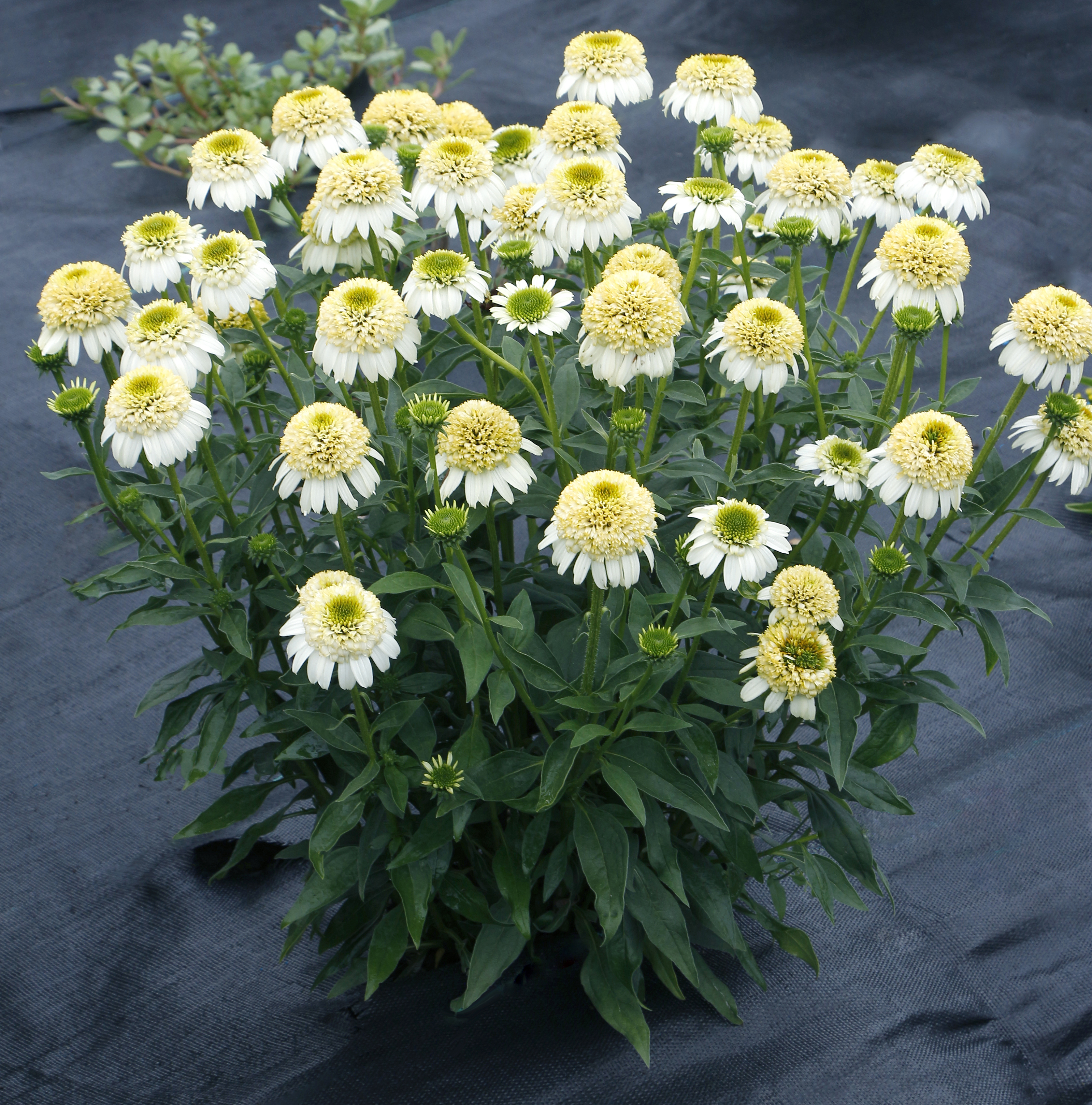 Incredibly heavily flowering, beautiful double echinacea, CARA MIA™ 'Sands' reminded us of a gorgeous white sand beach with its clean crisp look. Compact, but dense foliage support abundant flowering with glowing white petals, cream colored cone, and bright green eye. Well balanced, does not flop despite substantial bloom size and count. Fantastic in the landscape, high crown count, and bright unique double flowers make the CARA MIA™ series a standout.