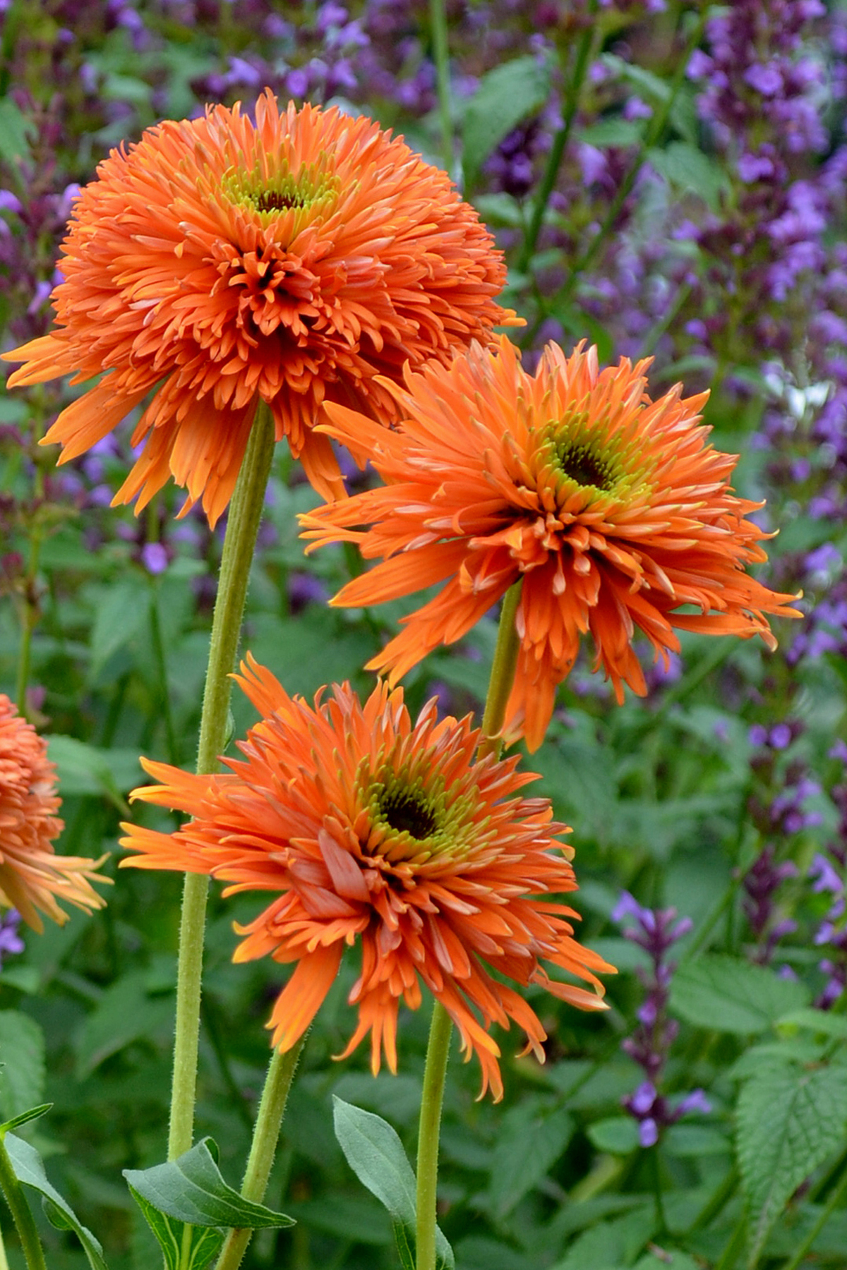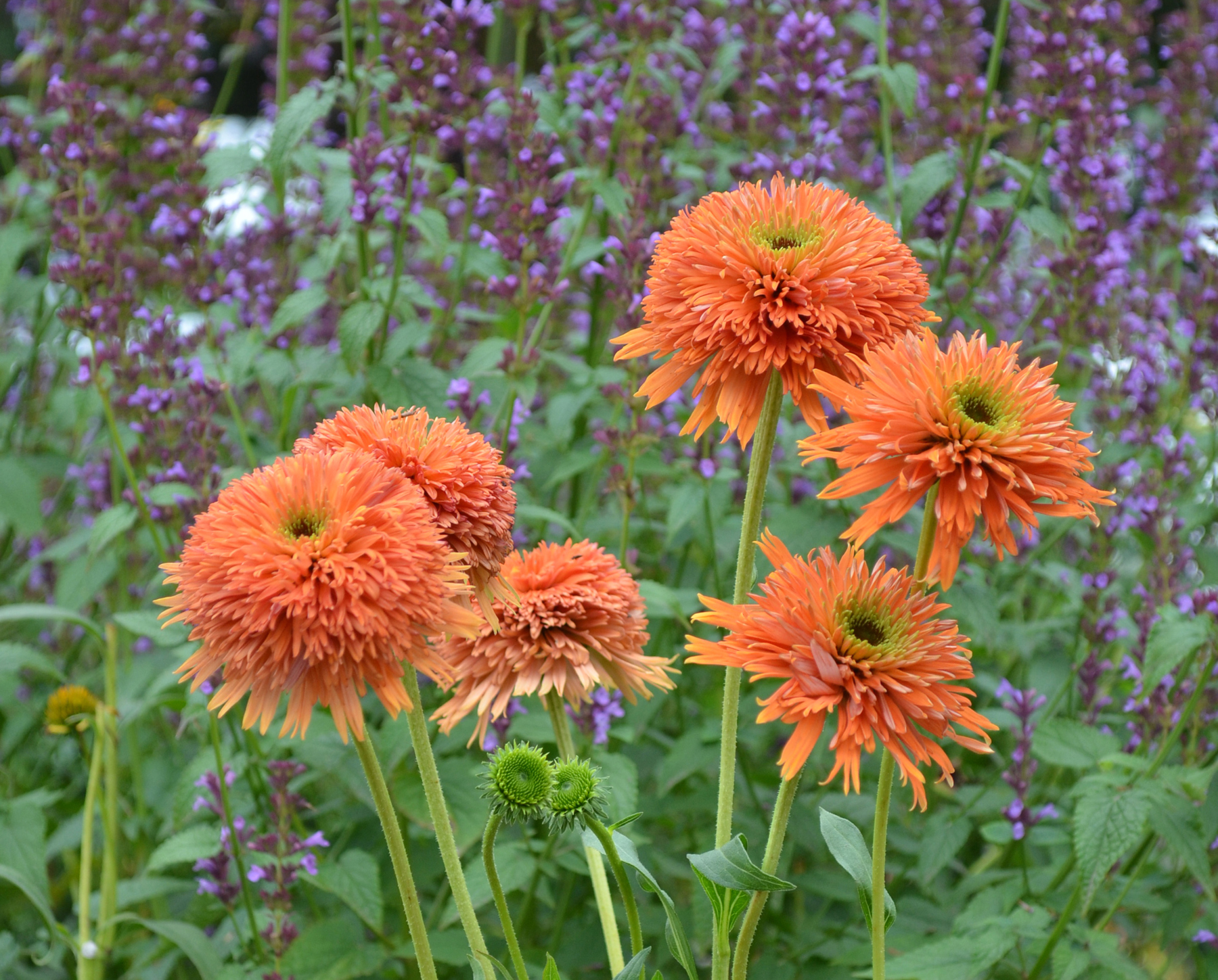 This plant has it all – lovely double orange flowers and a medium short, well-branched habit. The anemone type double flowers open with centers that are dark green, then more lime-green, and then orange. First year plants are multi-stemmed. Excellent vigor. Flowers are very large and stems are extra strong. A very exciting Echinacea.