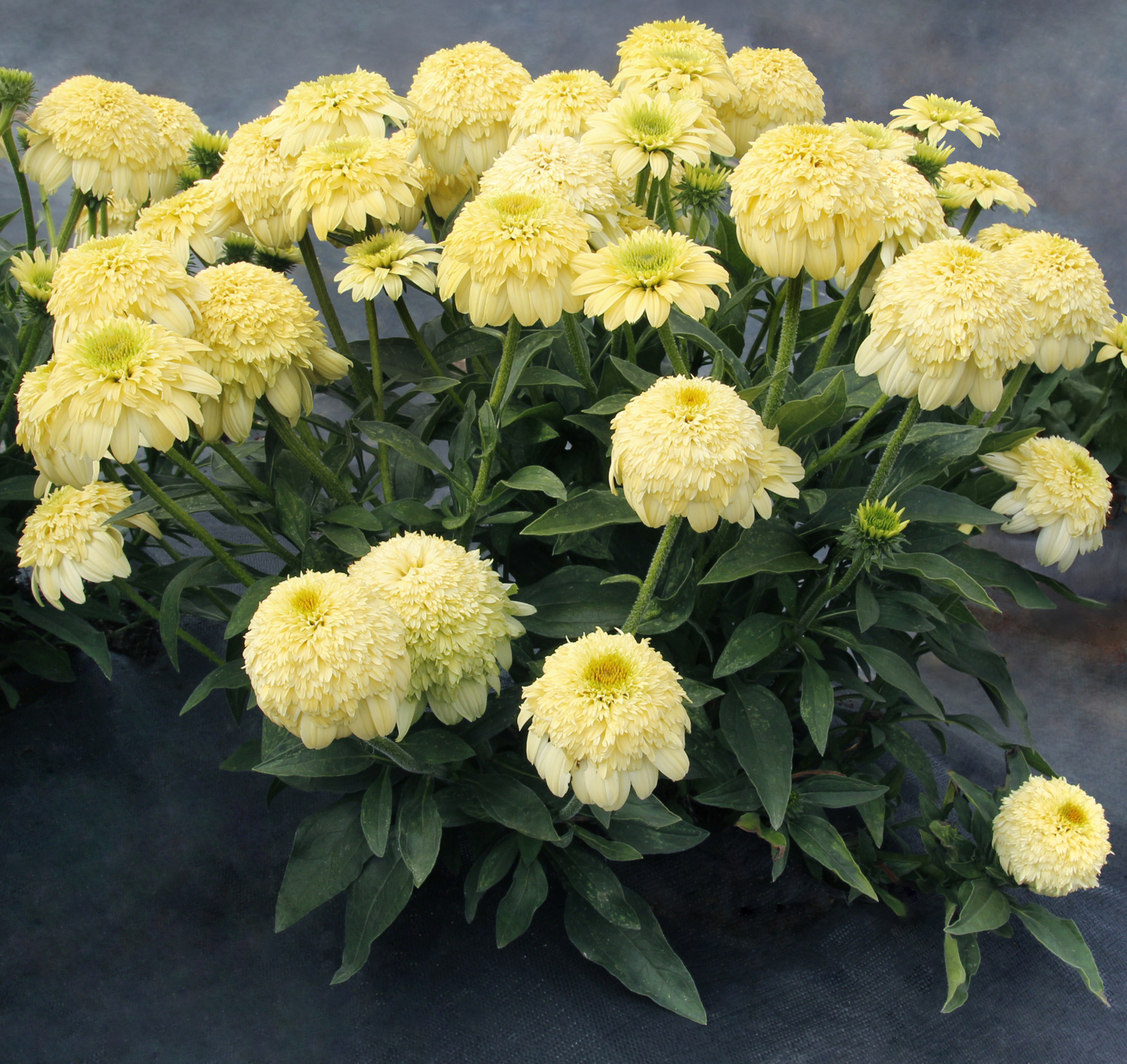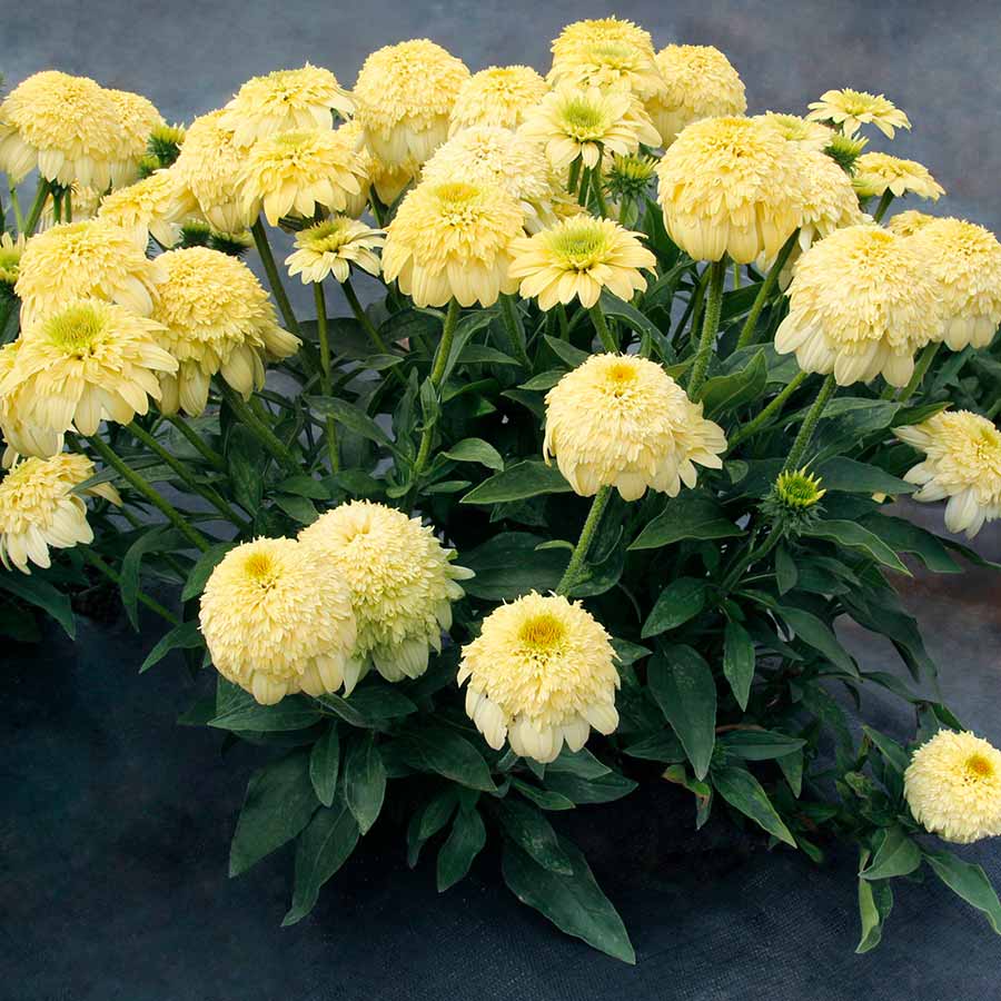 Bred for the pot crop market. Raise your garden’s glass to Echinacea DELIGHTFUL™ ‘Prosecco’, a celebratory coneflower that pours out double yellow blooms like fizzy sunshine. Each flower is a golden pompom perched atop sturdy, upright stems, radiating warmth and cheer from early summer through fall. Compact and container-friendly, this bubbly beauty was bred for brilliance, no pinching, no fuss, just nonstop color.